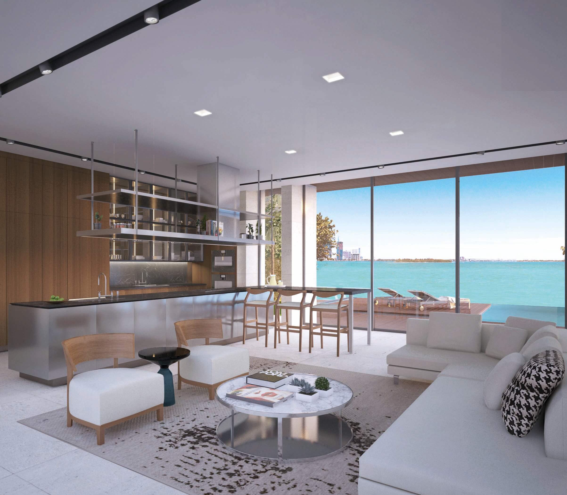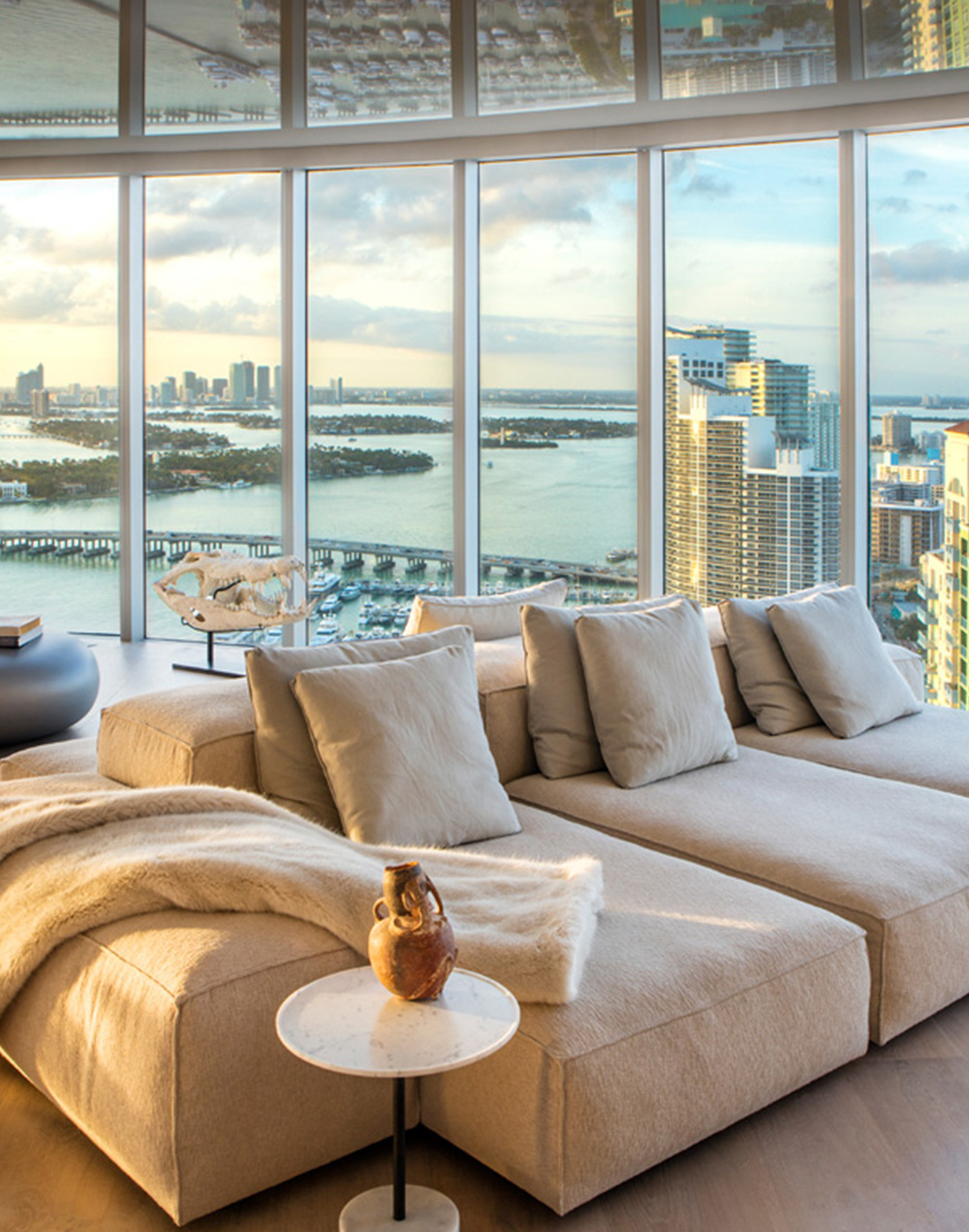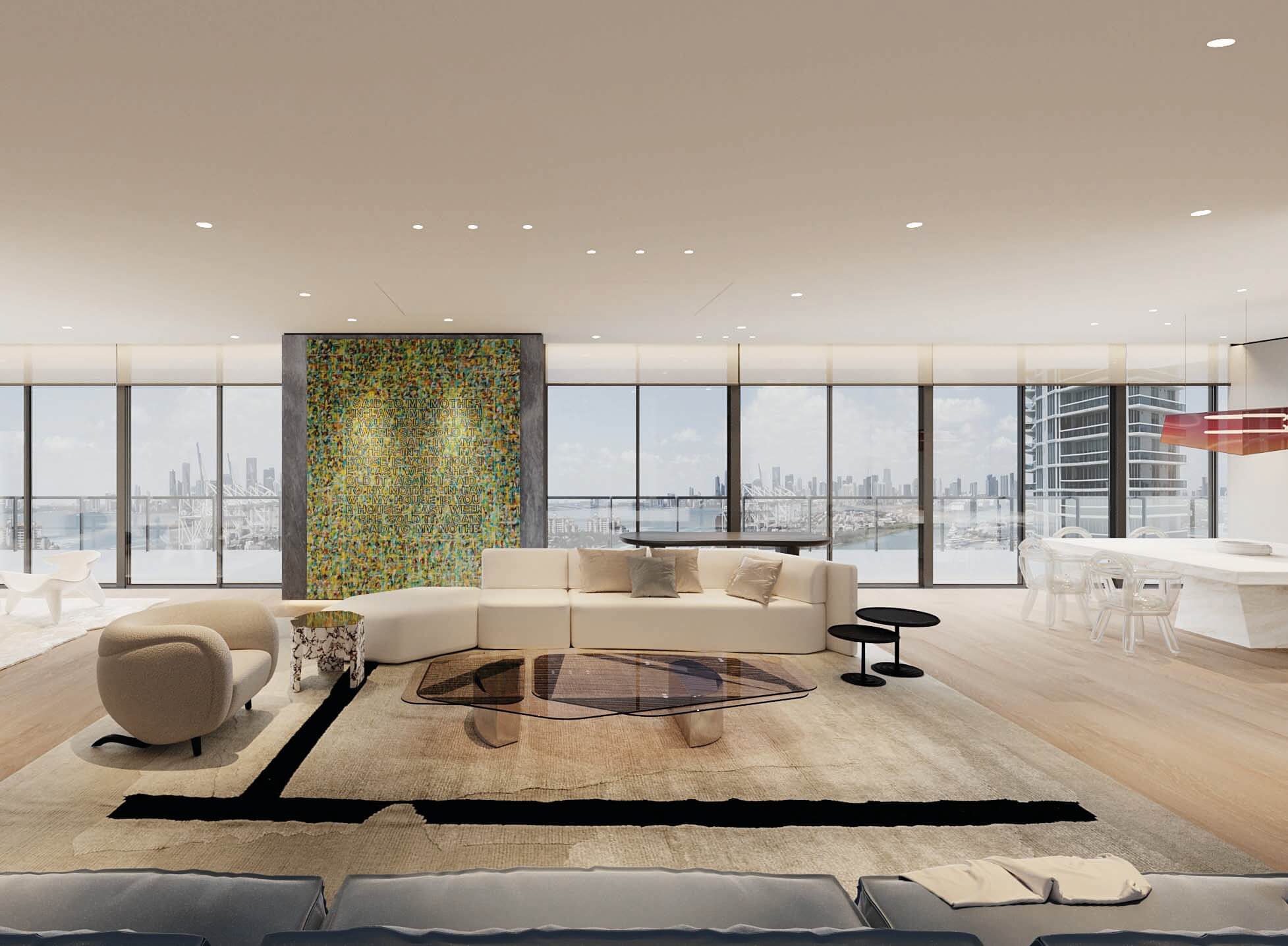 N 2 5 ° 4 6 ' 1 0 "Interior redesign of a unit on one of the top levels of Murano at Portofino in Sofi, Miami Beach. The living concept for this project revolves around the day to day of a photographer/art collector. And the integrated living layout of family room - living - kitchen - dining allows for amazing interactions throughout the space while allowing the user to bask in the stunning uninterrupted 180 degrees views.