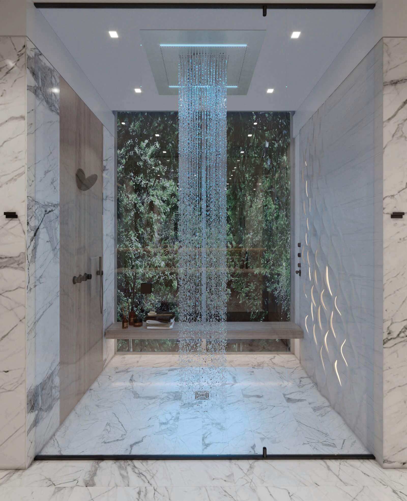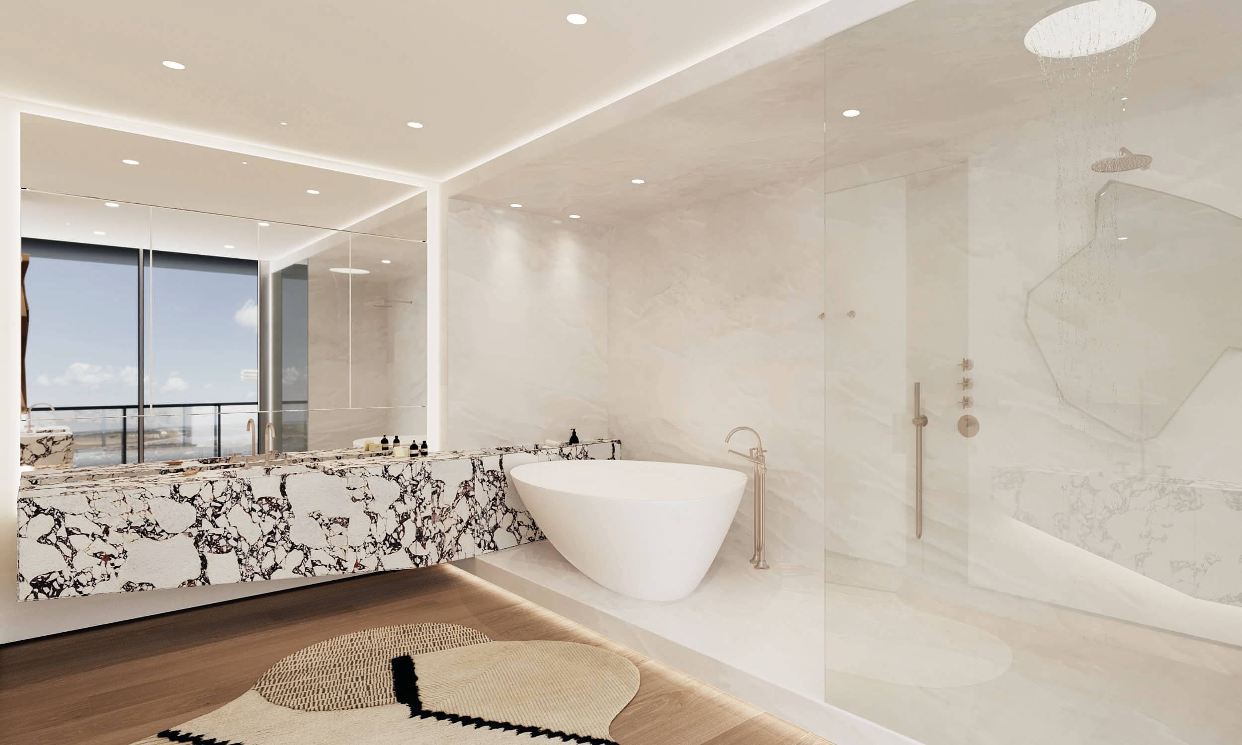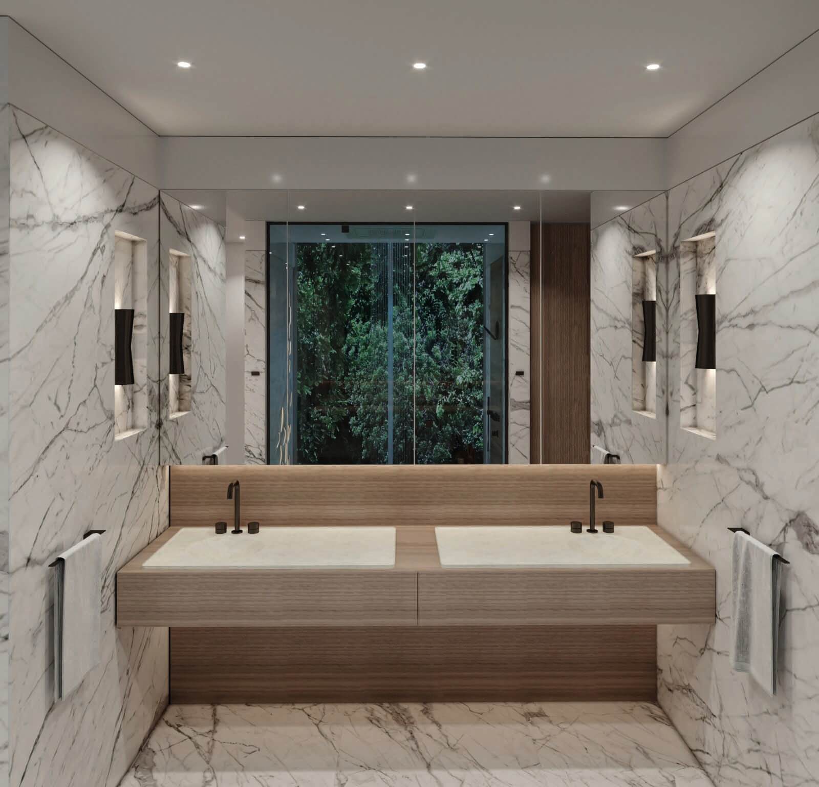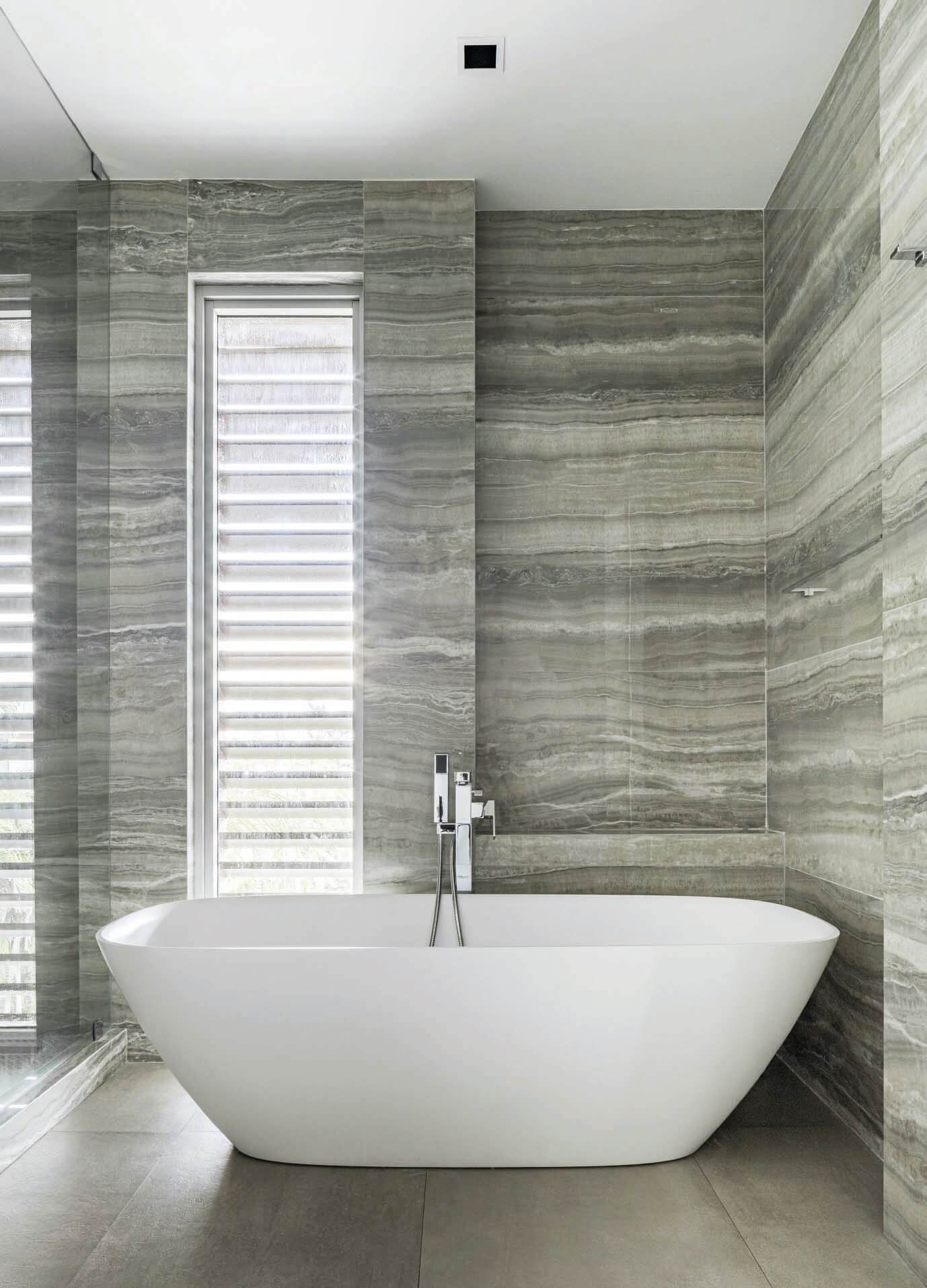 Erosion does not translate in the same shape or texture in nature, regardless of the material it is shaping. The use of a main natural material throughout (white travertine), with different shapes and textures, reflects this concept. Texture expresses something about the quality of the material, and it gives a particular quality to light. Sometimes, the erosion is such that it breaks the skin leaving a physical connection between interior and the exterior, this is reflected in the form of louvers, which are used to connect to the exterior, but at the same time give privacy to the spaces behind.