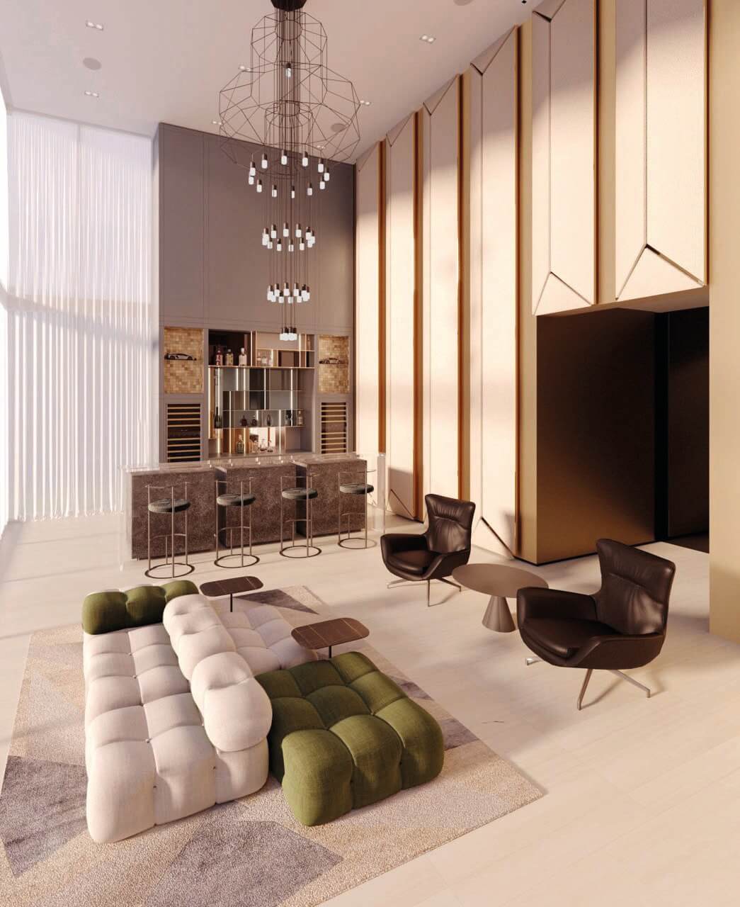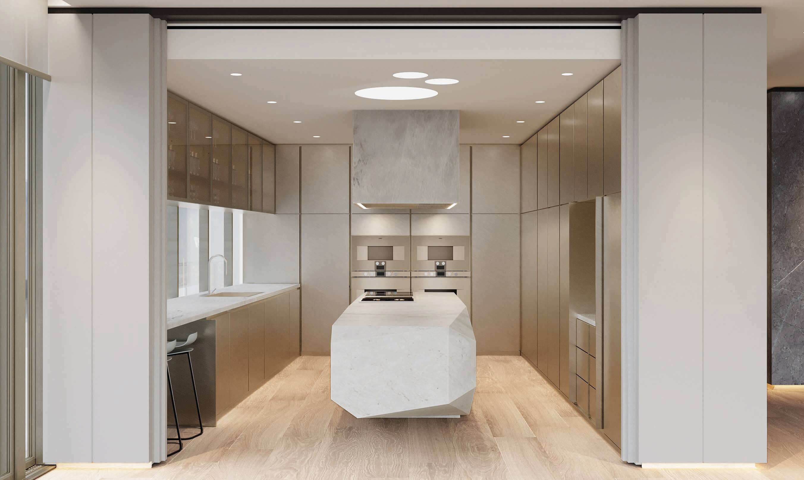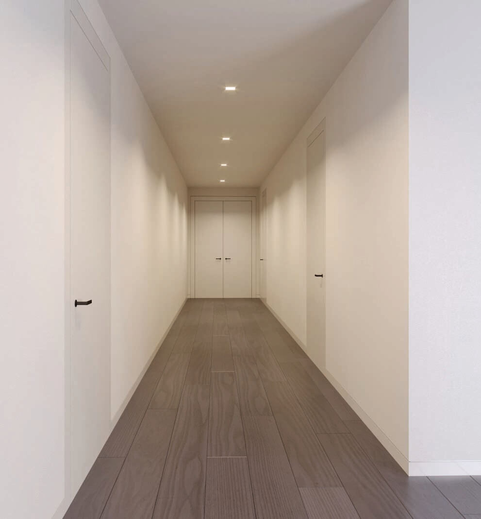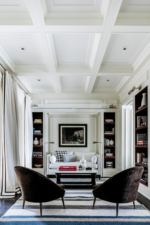 The space provides a sense of retreat as it maintains a monochromatic scheme, with emerald green accents in a few furniture pieces to bring depth into the space. Texture and layers are present throughout this apartment renovation. The flooring finishes change from wood planks to terrazzo, creating shapes that project to the dropped ceiling and emphasized by indirect lighting on the reveals. Window treatments are recessed on the ceiling, as well as the carpets are inlaid on the wood floor to provide a seamless transition for the different materials. 5,600 SF