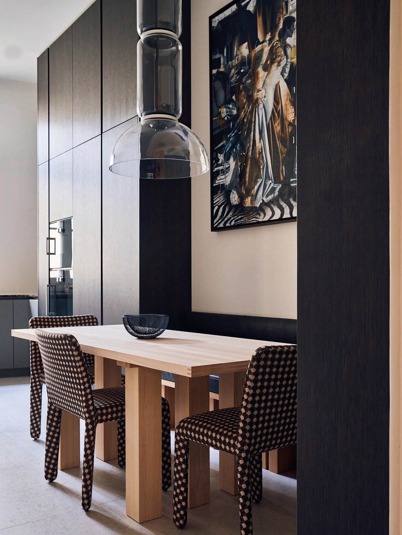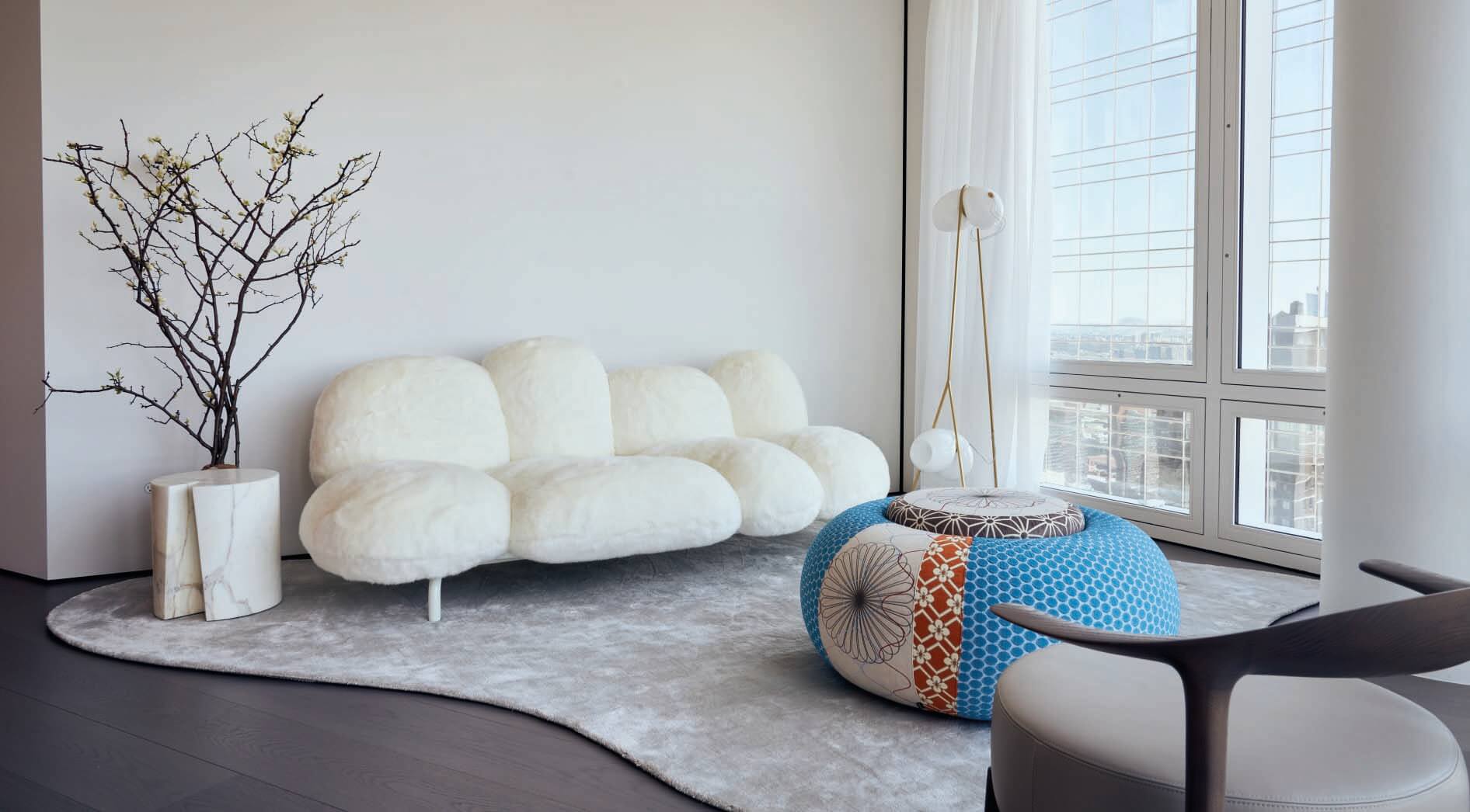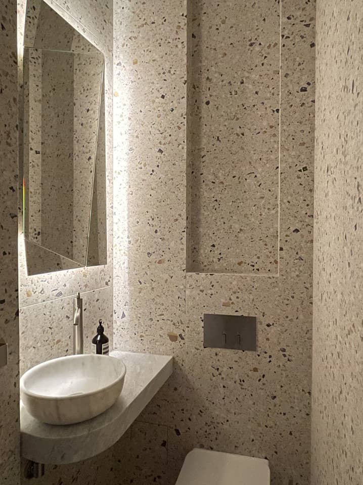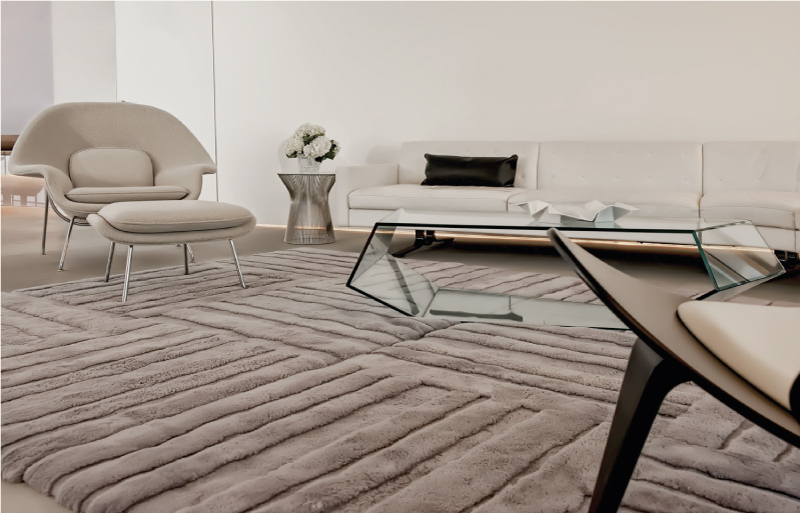 The space provides a sense of retreat as it maintains a monochromatic scheme, with emerald green accents in a few furniture pieces to bring depth into the space. Texture and layers are present throughout this apartment renovation. The flooring finishes change from wood planks to terrazzo, creating shapes that project to the dropped ceiling and emphasized by indirect lighting on the reveals. Window treatments are recessed on the ceiling, as well as the carpets are inlaid on the wood floor to provide a seamless transition for the different materials. 5,600 SF