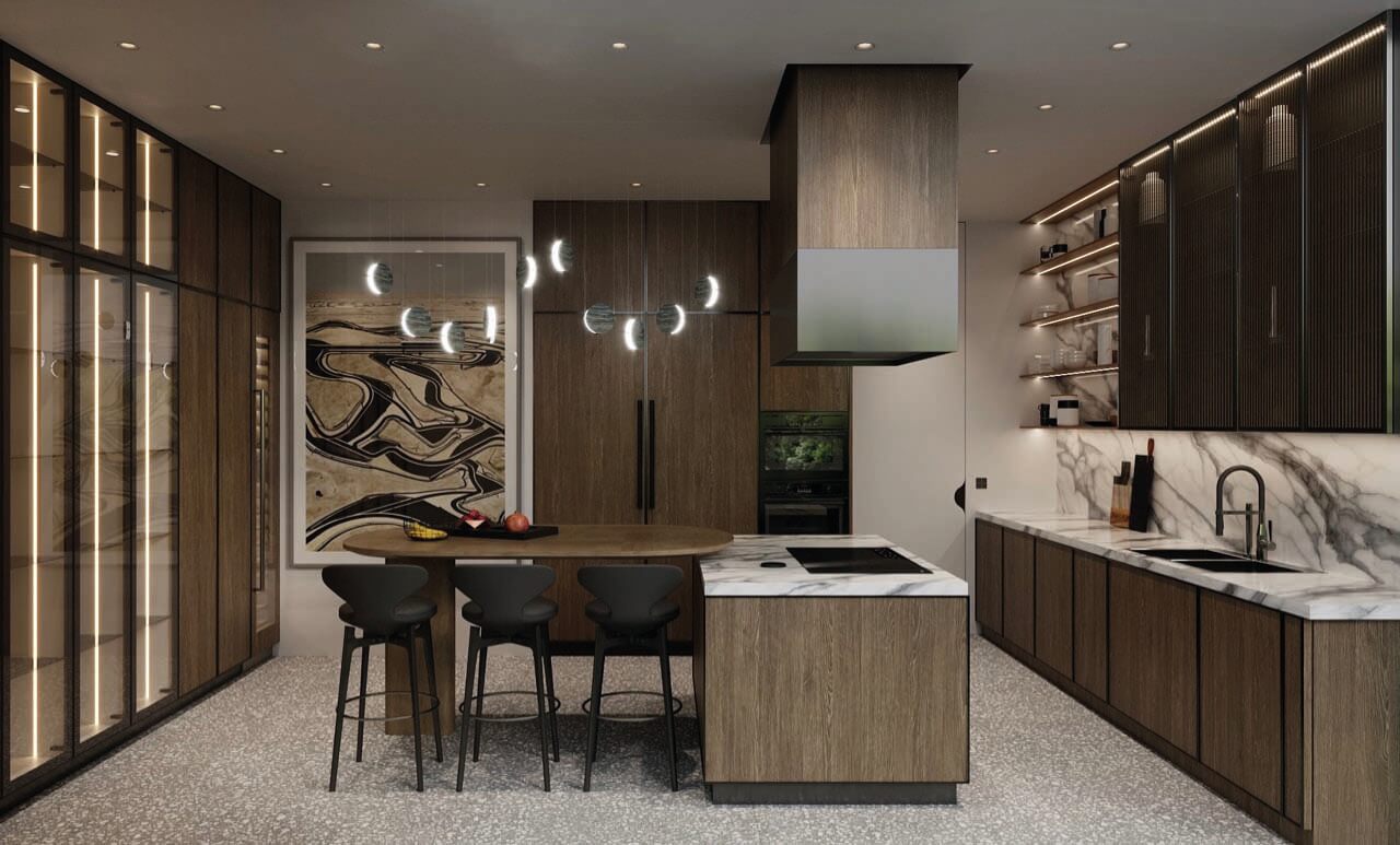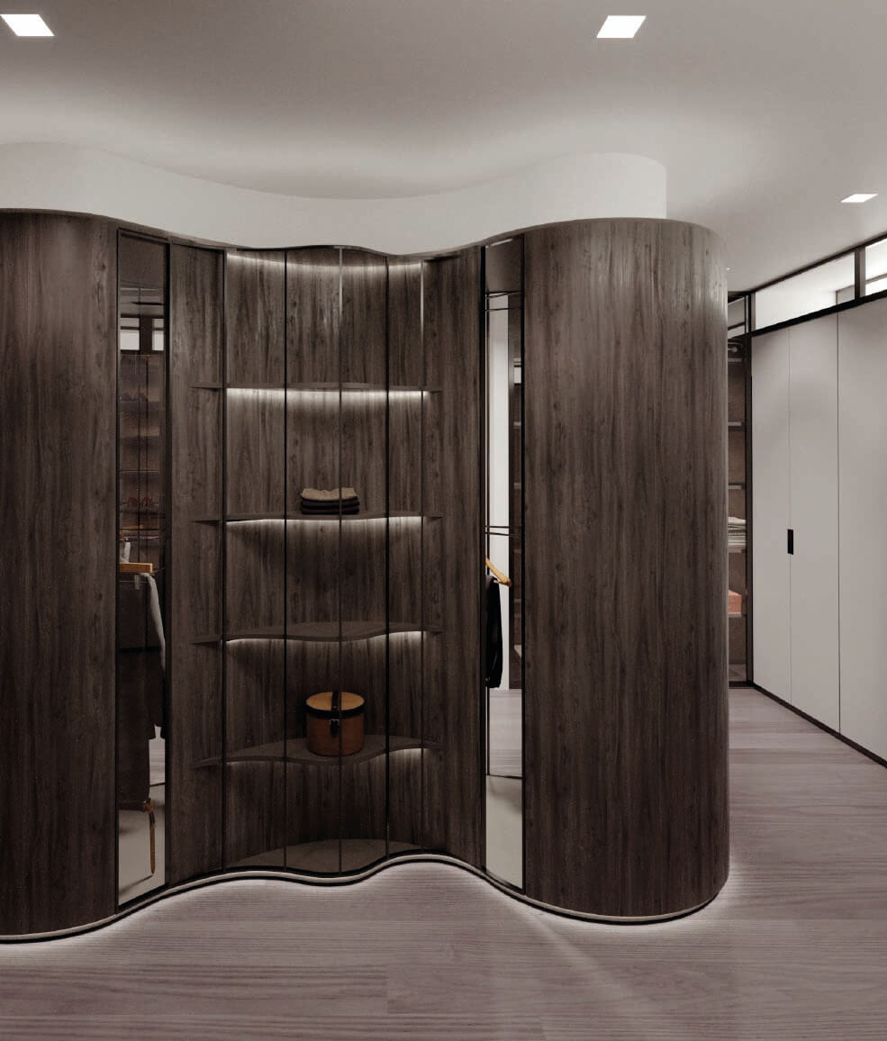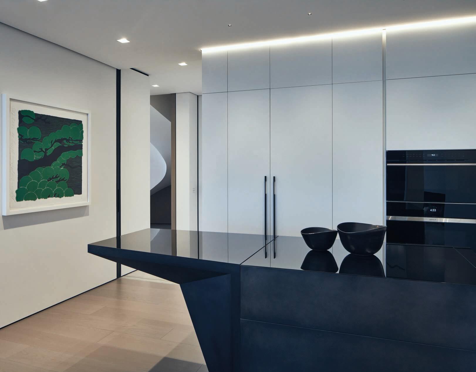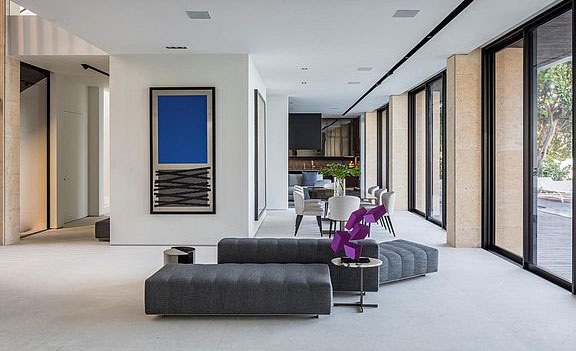 The main principle of this design concept was contrast, maintaining a muted color scheme, to create an emphasis on the definition of the spaces through textured surface materials. These materials define three distinctive and independent modules delineating the areas of the living room, dining room and library. These independent modules link at a point where two of them visually align to its surfaces. To extend the feeling of continuity, the baseboards match the wood floor finish and lift up in a curve ending behind the Kashmir Suede leather panels and natural stone slabs. Behind the panels, an LED light strip washes down the baseboard and accents the light and continuous visual as if the floor disappears on the walls. Keeping a sophisticated materiality on the interior architecture finishes, accents the central character of this design concept: Art. Translating also into the furniture and lighting selection for these spaces. 4,000 SF