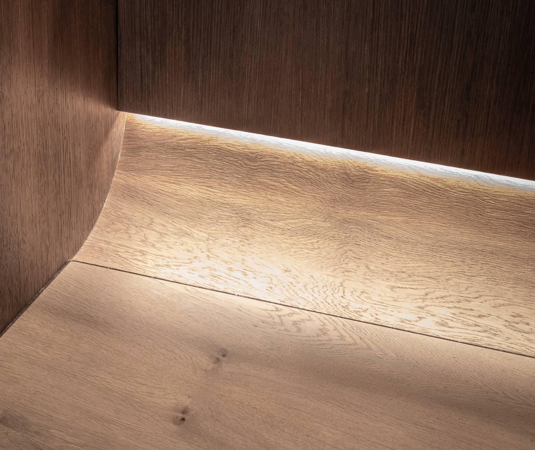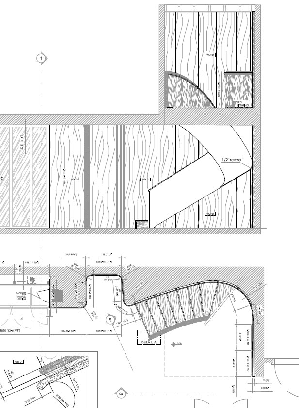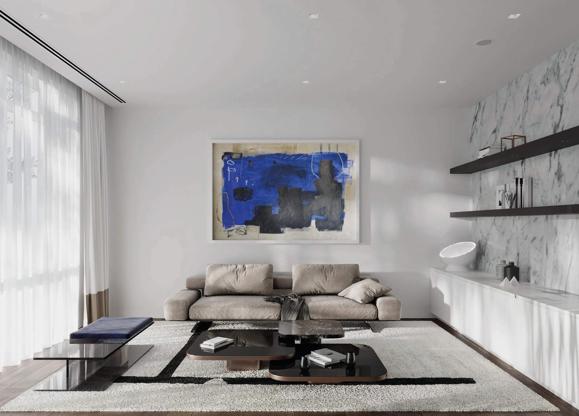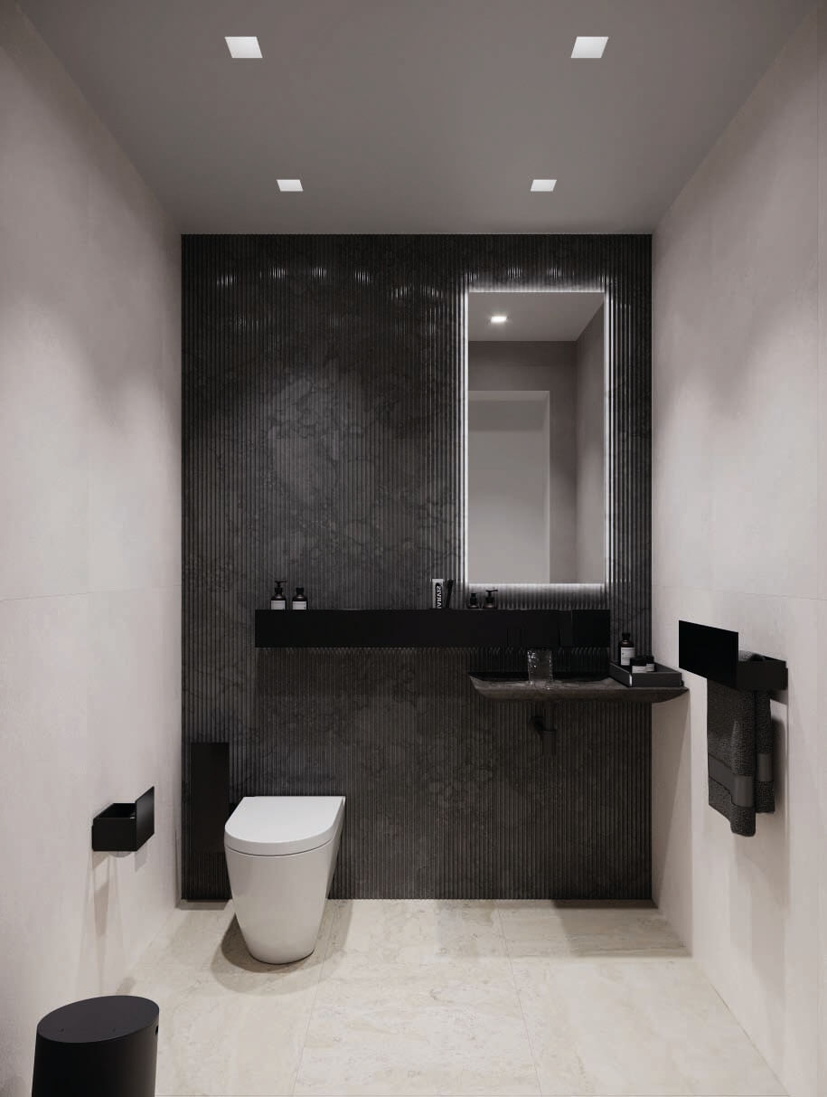 The main principle of this design concept was contrast, maintaining a muted color scheme, to create an emphasis on the definition of the spaces through textured surface materials. These materials define three distinctive and independent modules delineating the areas of the living room, dining room and library. These independent modules link at a point where two of them visually align to its surfaces. To extend the feeling of continuity, the baseboards match the wood floor finish and lift up in a curve ending behind the Kashmir Suede leather panels and natural stone slabs. Behind the panels, an LED light strip washes down the baseboard and accents the light and continuous visual as if the floor disappears on the walls. Keeping a sophisticated materiality on the interior architecture finishes, accents the central character of this design concept: Art. Translating also into the furniture and lighting selection for these spaces. 4,000 SF