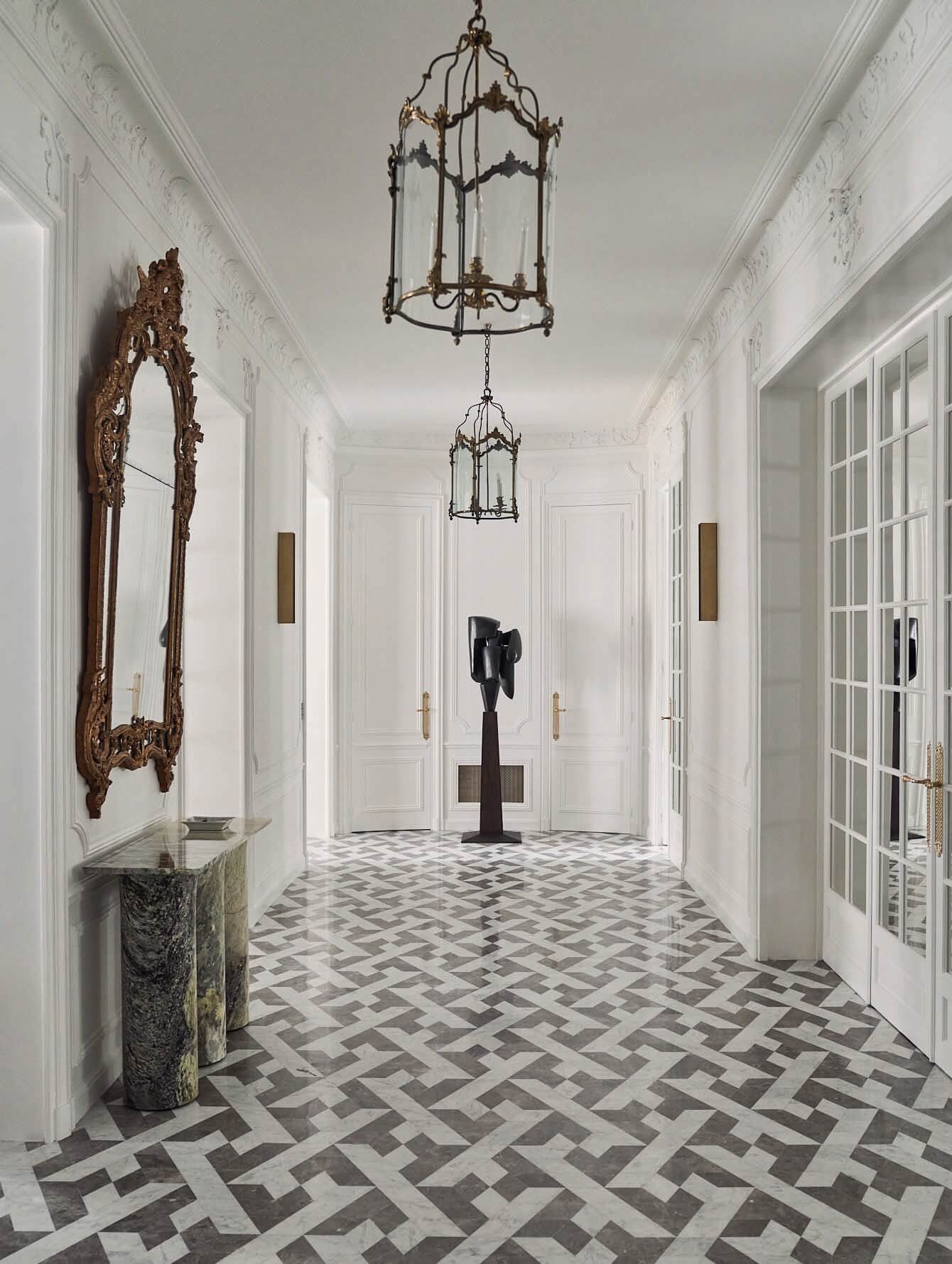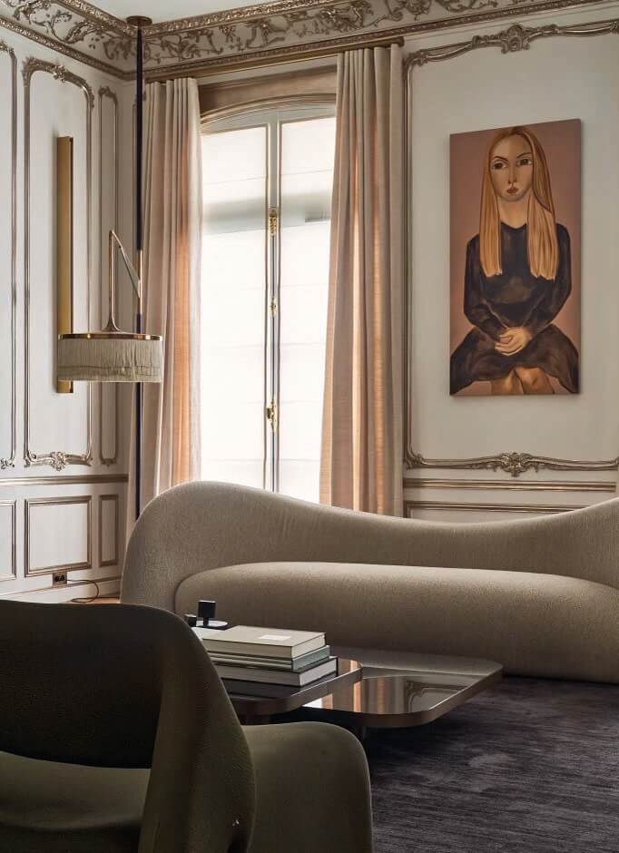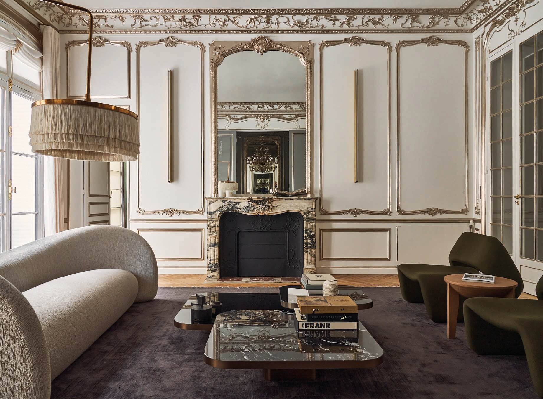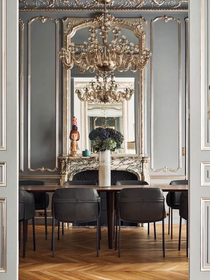A true 1890s Hausmann classical yet contemporary Parisian apartment renovation. Inspired by an eclectic 1930s “avant-garde” Paris and juxtaposed experimental design ideas, combining and accentuating the existing architectural features such as elaborate crown and wall moldings, mirrored walls with hidden doors as well as exotic marble chimneys and original chevron oak parquet, complemented with modern unique one off finishes and contemporary art furniture, custom lighting fixtures and renown art pieces from a large variety of artists and bespoke designers. 3,100 SF