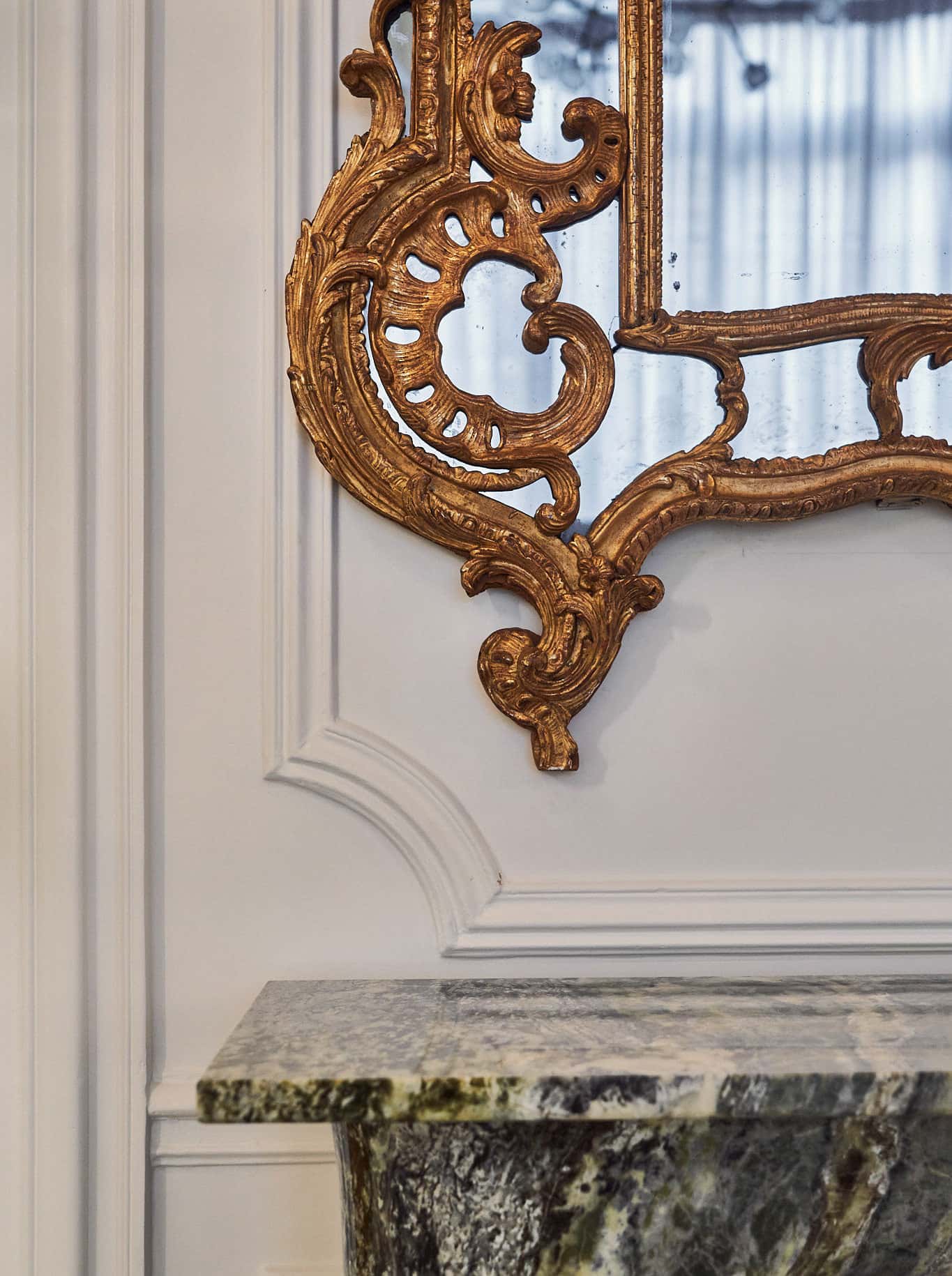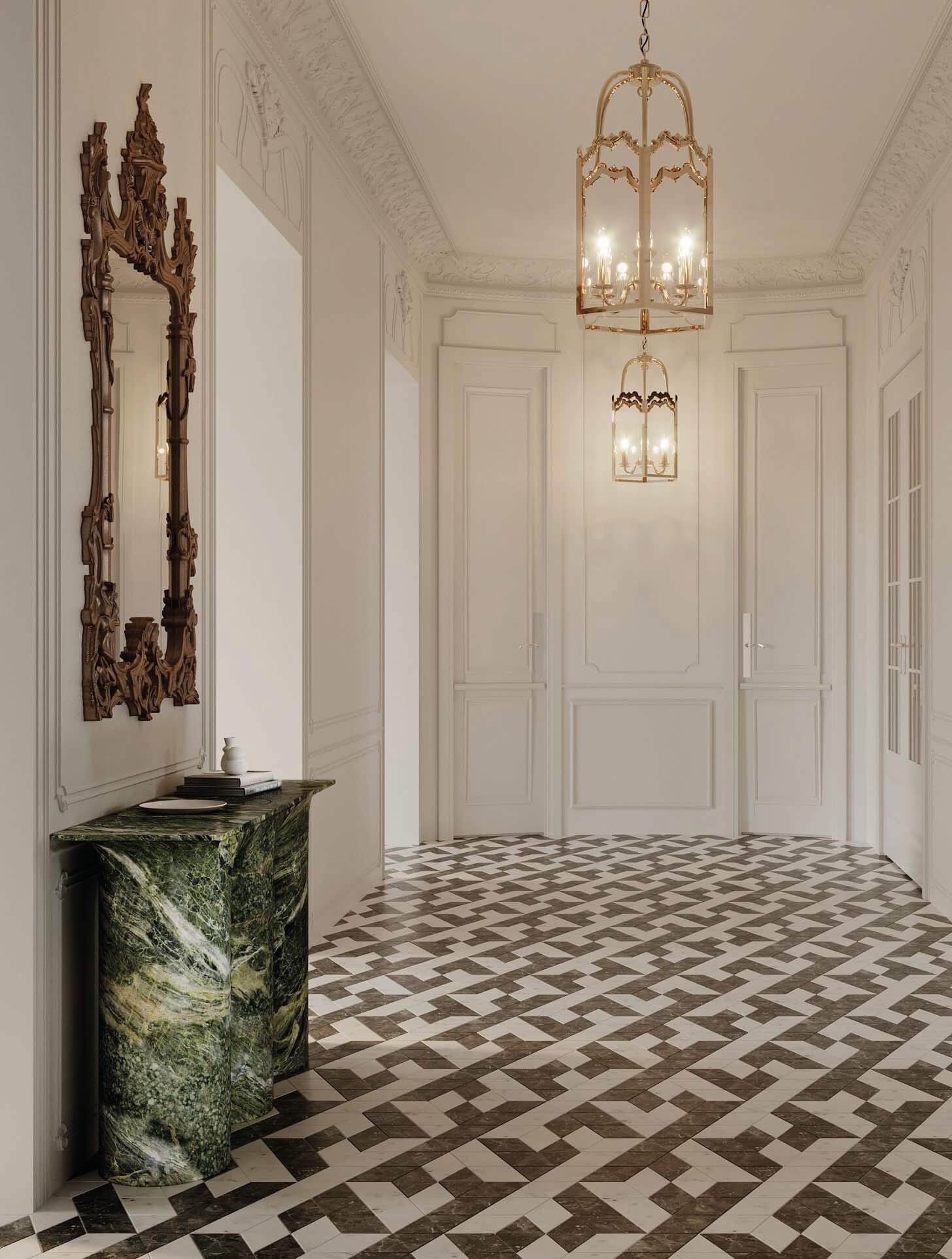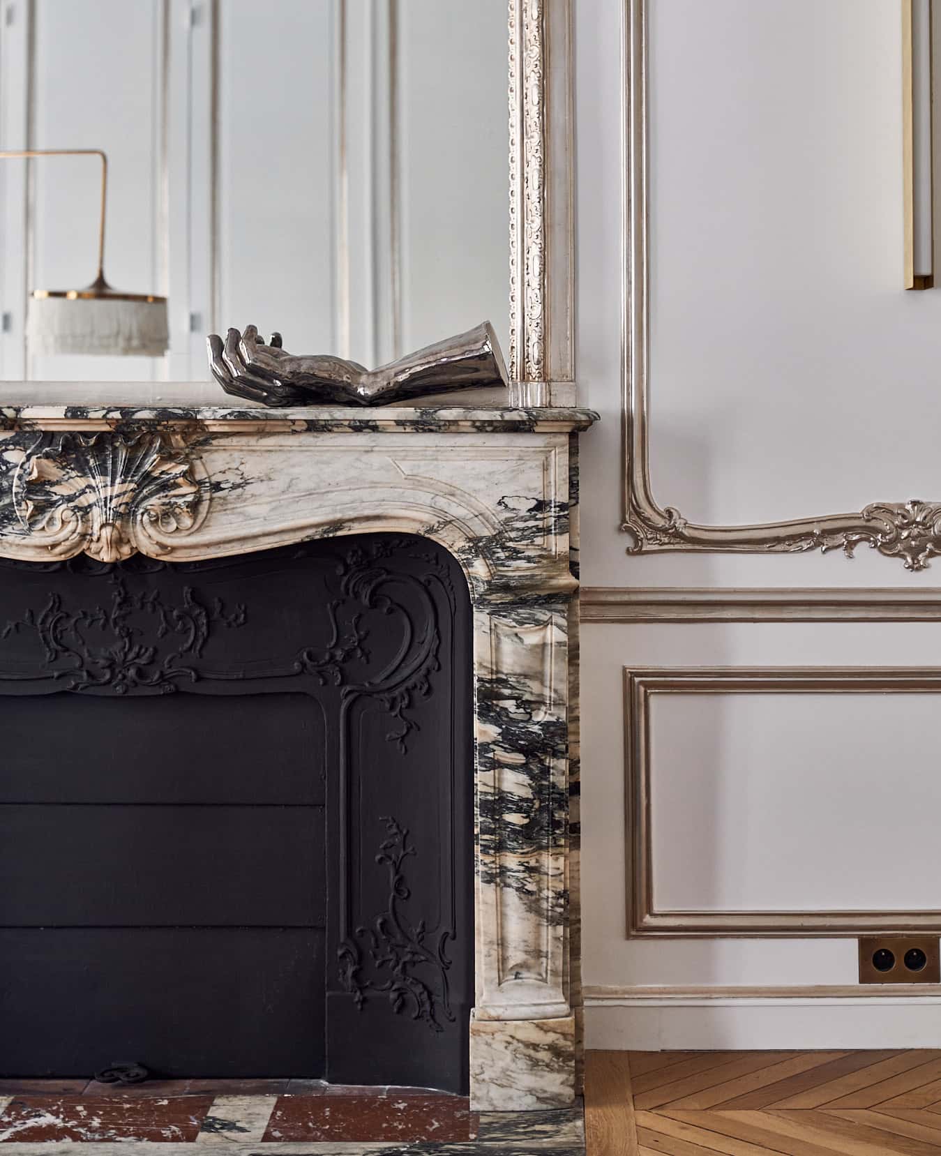 A true 1890s Hausmann classical yet contemporary Parisian apartment renovation. Inspired by an eclectic 1930s “avant-garde” Paris and juxtaposed experimental design ideas, combining and accentuating the existing architectural features such as elaborate crown and wall moldings, mirrored walls with hidden doors as well as exotic marble chimneys and original chevron oak parquet, complemented with modern unique one off finishes and contemporary art furniture, custom lighting fixtures and renown art pieces from a large variety of artists and bespoke designers. 3,100 SF
