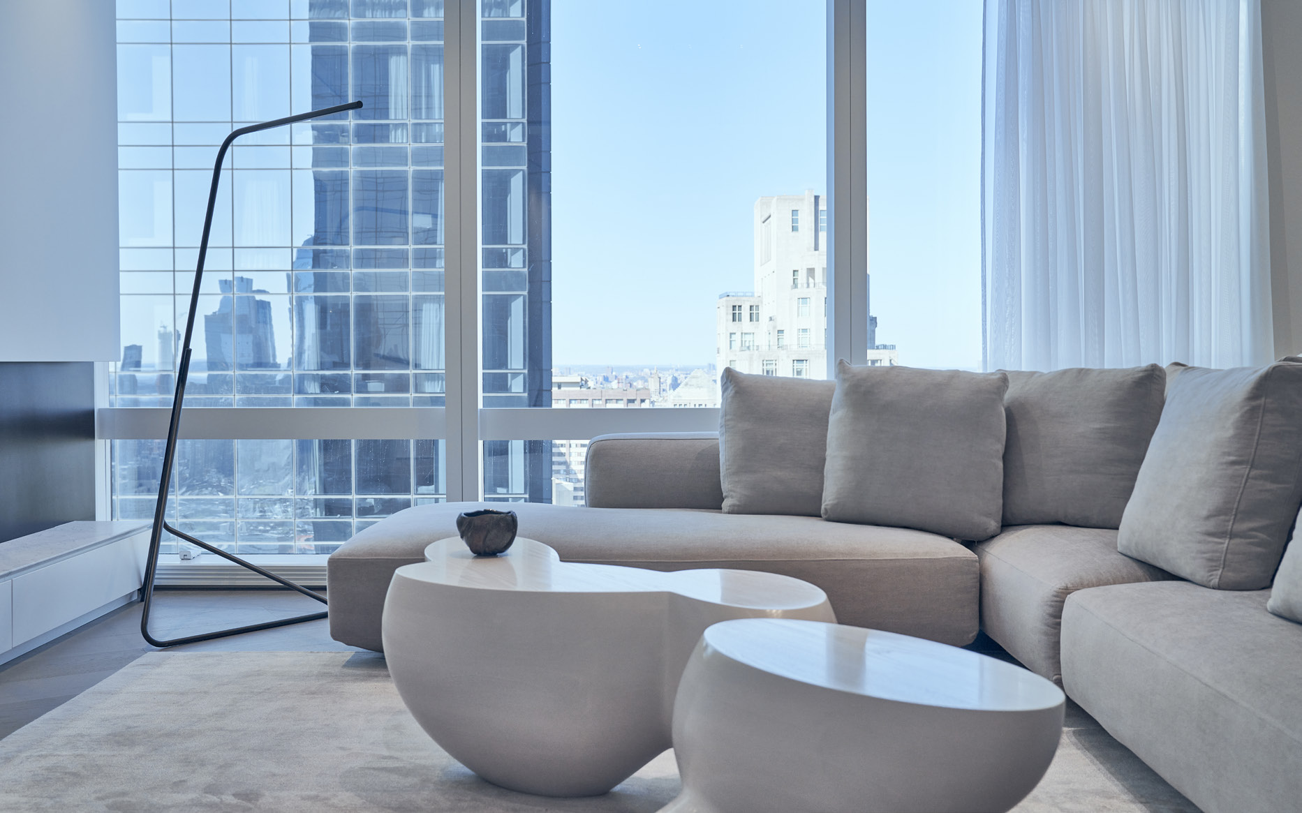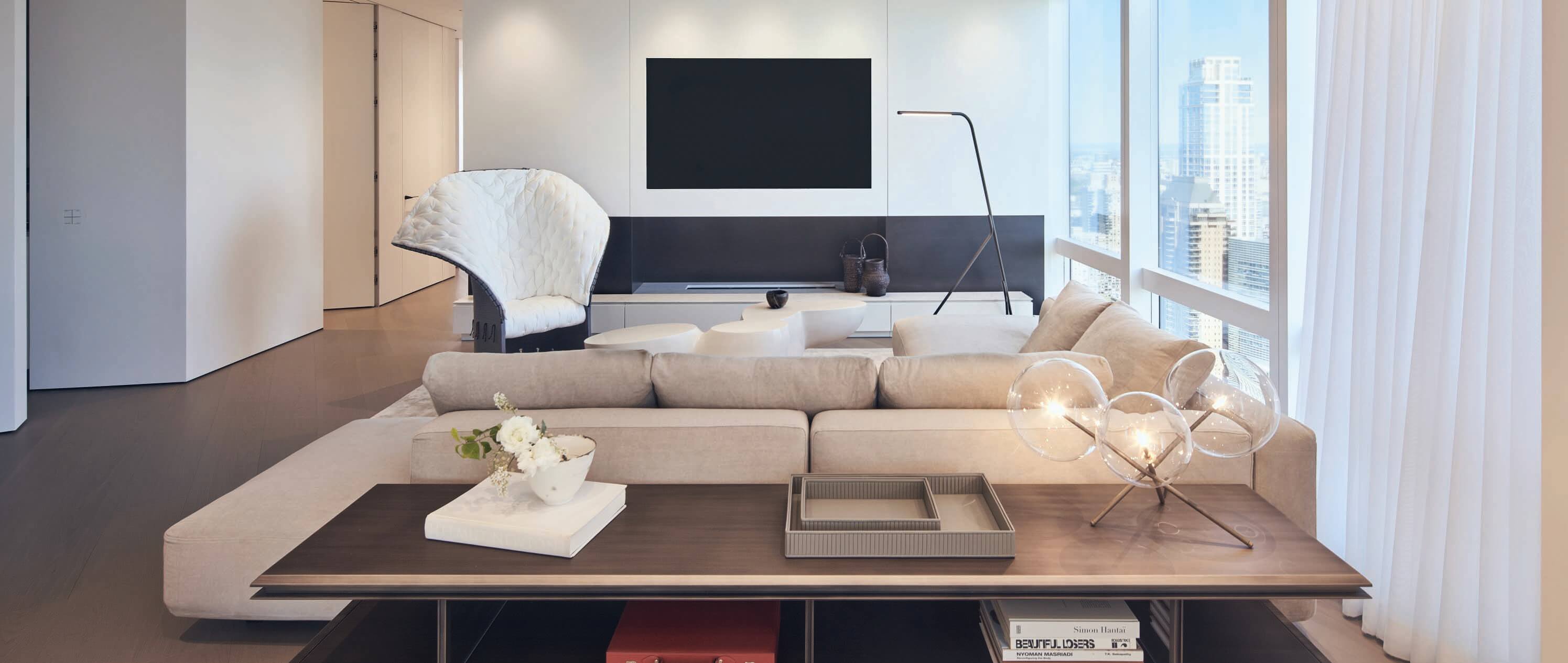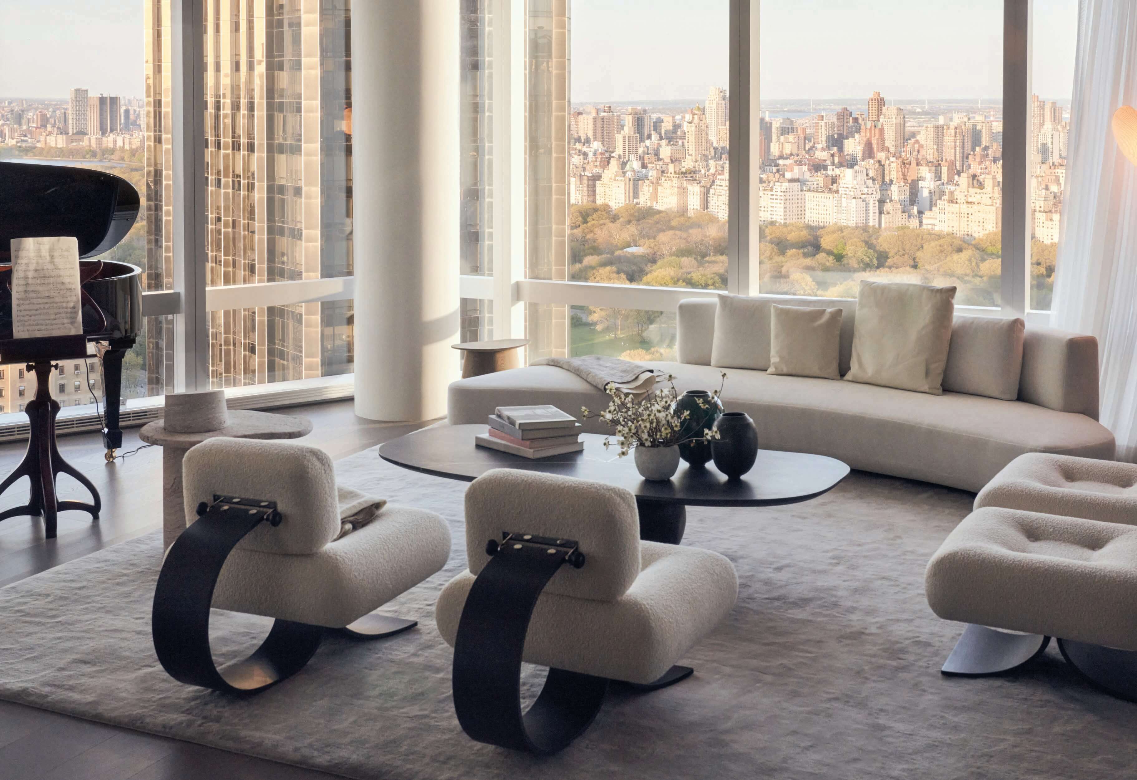 N 25° 31' 09. 16"This project consisted of a combination of two separate units into a single unified duplex and the full renovation and interior design for all the spaces, creating an elevated pied-a-terre for the clients. This project included a complete overhaul of the apartment with all new finishes, lighting, custom stairway, millwork, bathrooms, closets, and kitchen. The concept for the design was Thirlwall’s take on organic minimalism with the integration of natural materials and textures, also considering a certain awareness to Asian culture, particularly Japanese, through the reinterpretation of traditional motifs and themes present in details throughout the design. A generally neutral color palette with different textures was selected to Evoque a calming space in the city with the main focus on the views to central park combined with delicately selected touches of color. 3580, SF