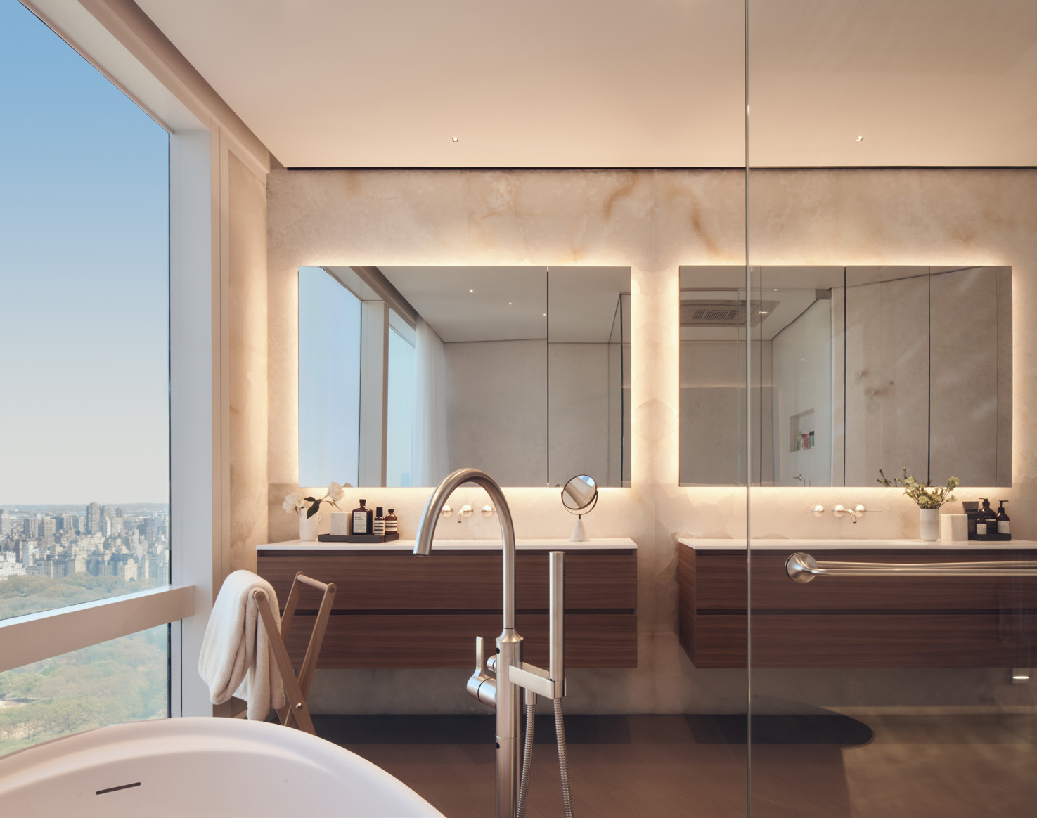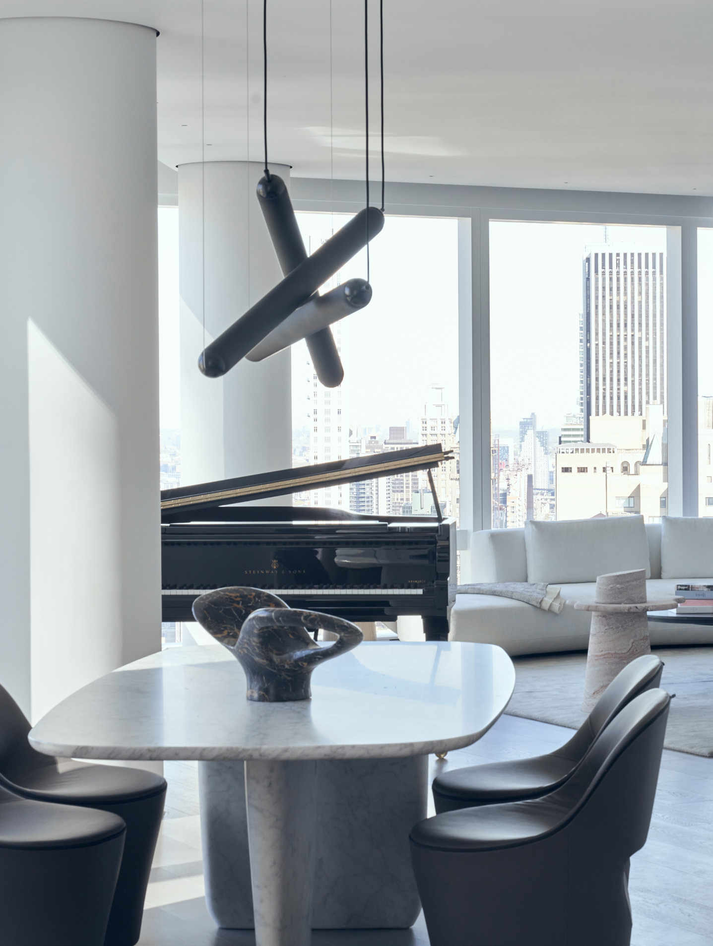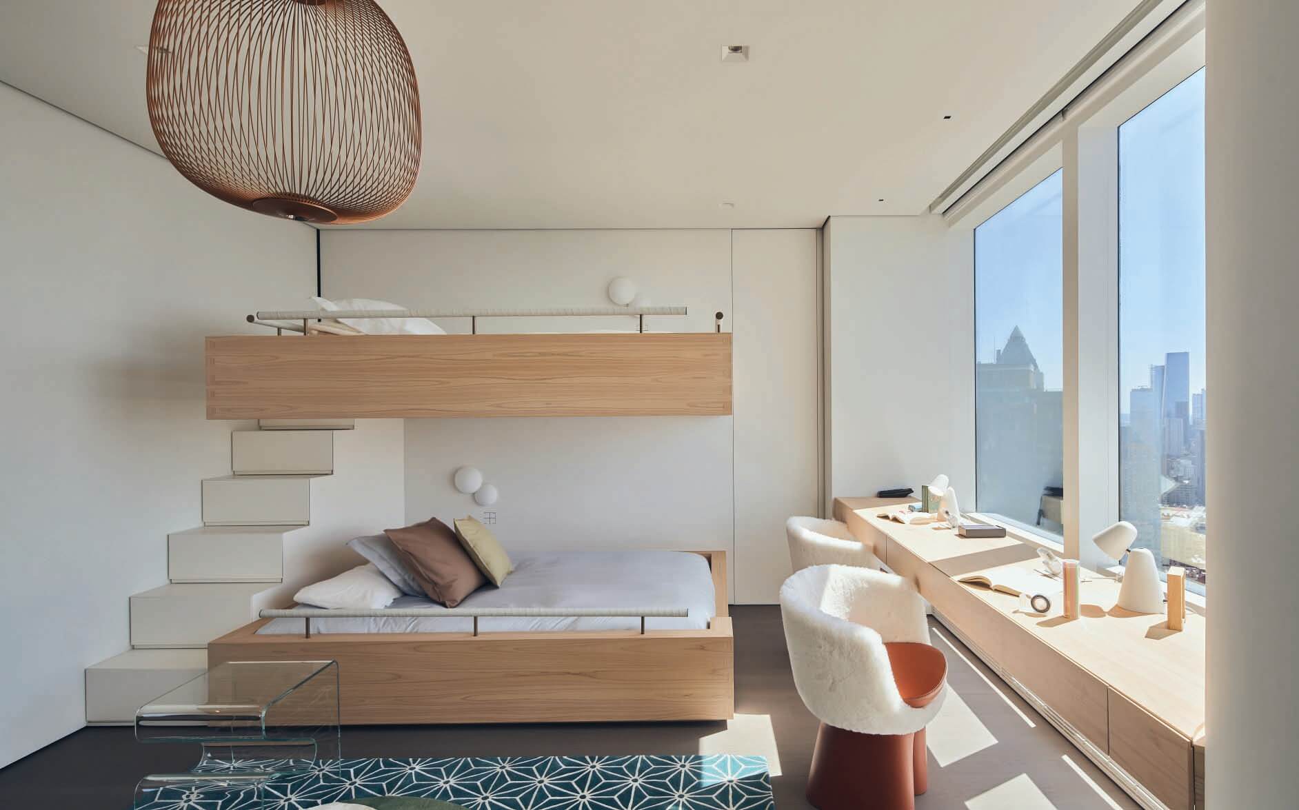 N 25° 31' 09. 16"This project consisted of a combination of two separate units into a single unified duplex and the full renovation and interior design for all the spaces, creating an elevated pied-a-terre for the clients. This project included a complete overhaul of the apartment with all new finishes, lighting, custom stairway, millwork, bathrooms, closets, and kitchen. The concept for the design was Thirlwall’s take on organic minimalism with the integration of natural materials and textures, also considering a certain awareness to Asian culture, particularly Japanese, through the reinterpretation of traditional motifs and themes present in details throughout the design. A generally neutral color palette with different textures was selected to Evoque a calming space in the city with the main focus on the views to central park combined with delicately selected touches of color. 3580, SF