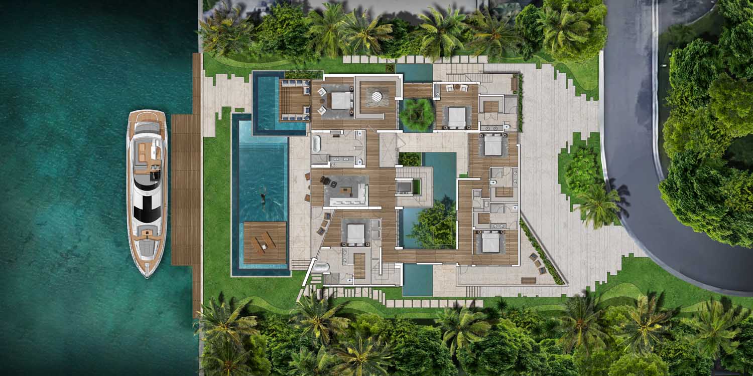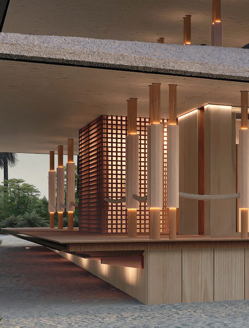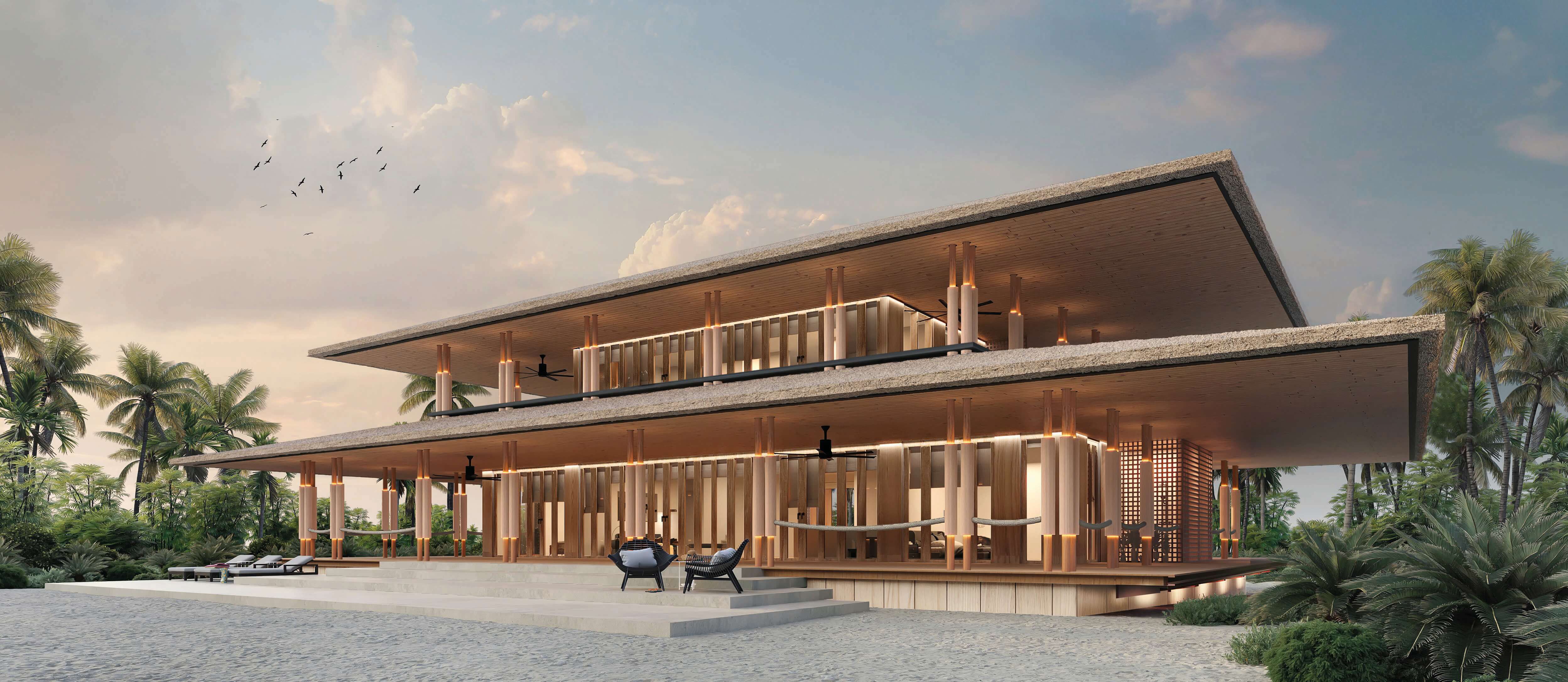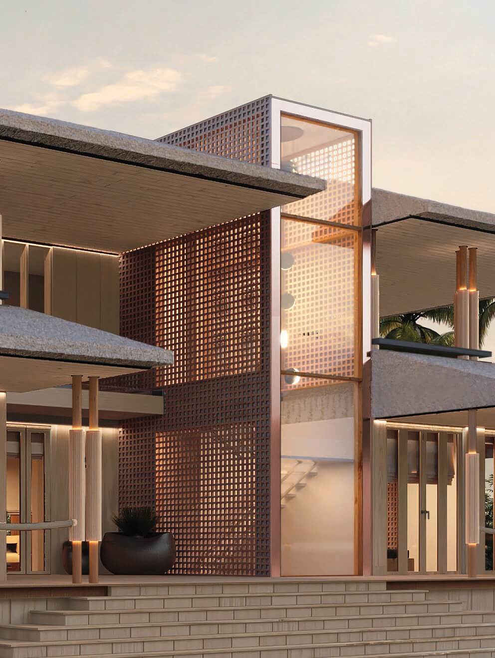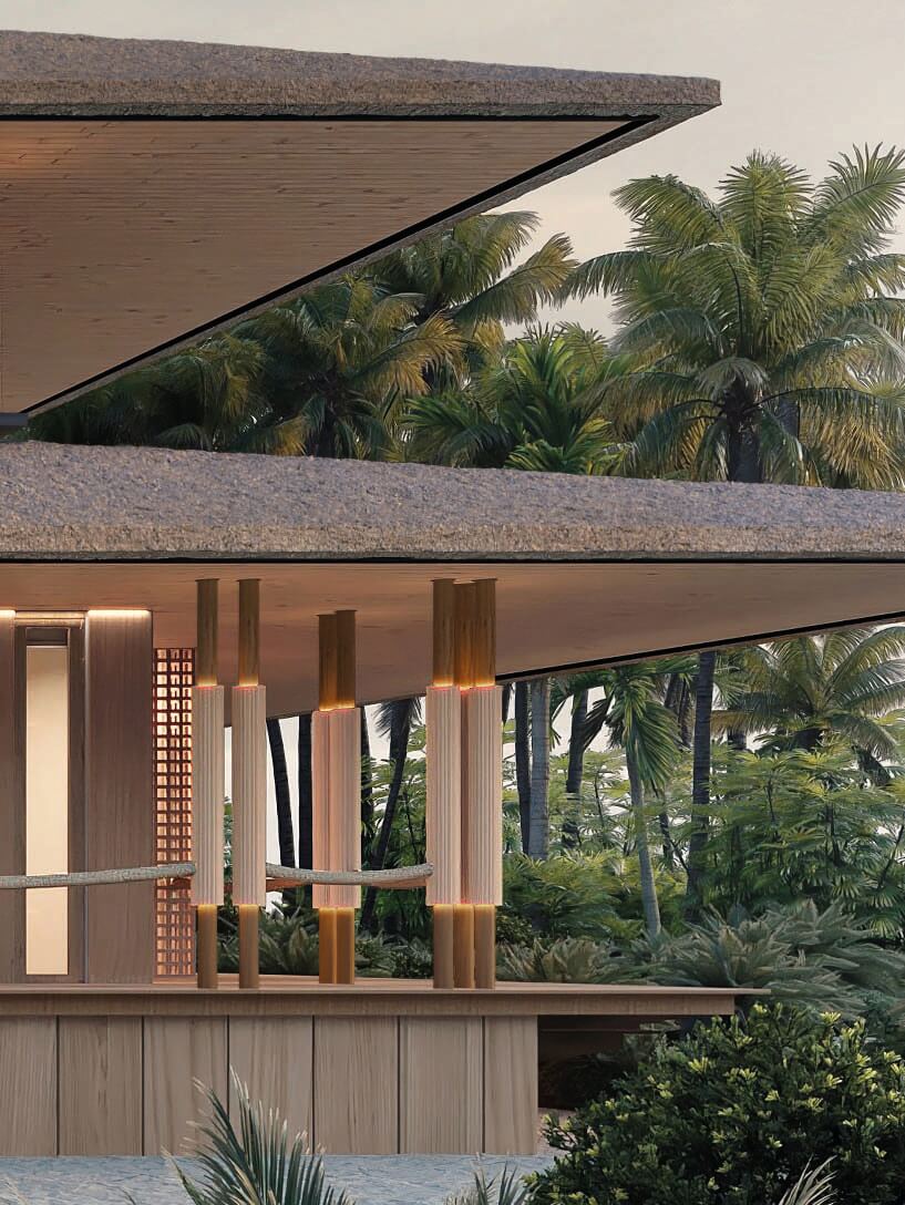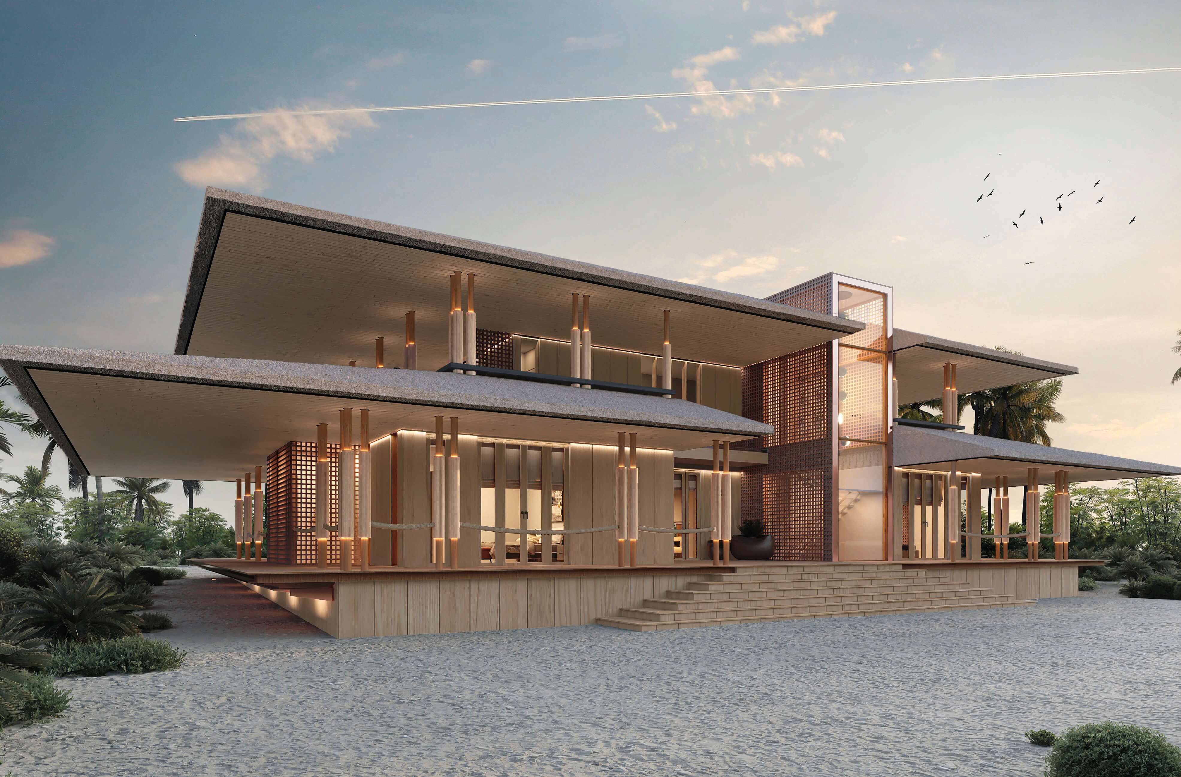 This design concept merges architectural elements of a caribbean bungalow and modern architecture. Proposed materiality includes thatched sloped roofs, copper elements and details, such as screen partitions, custom ceramic column covers, and wood paneling throughout the facades. 5,490 SF