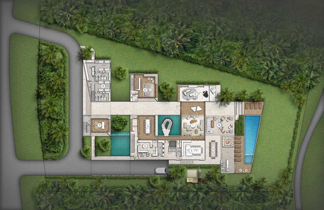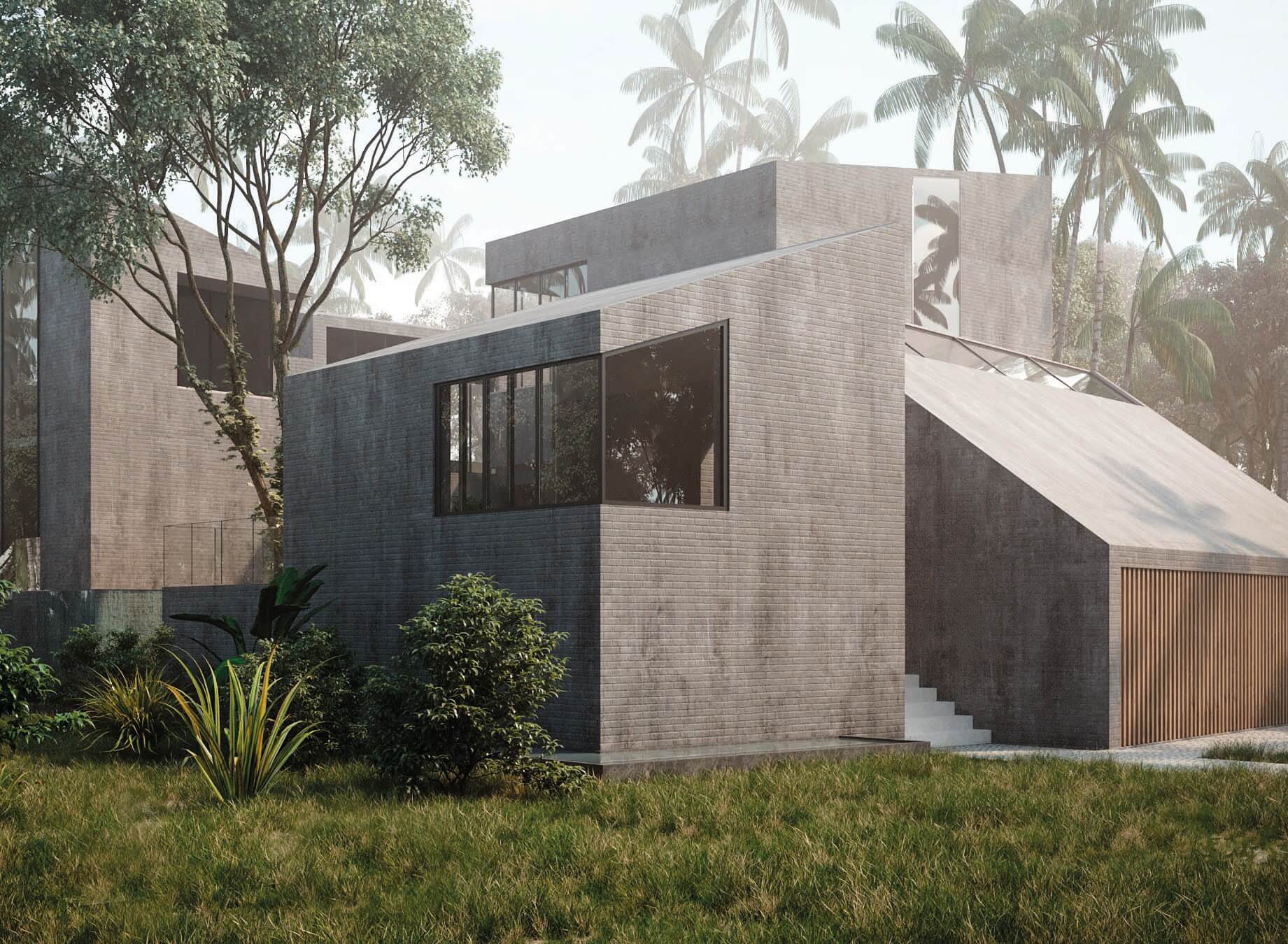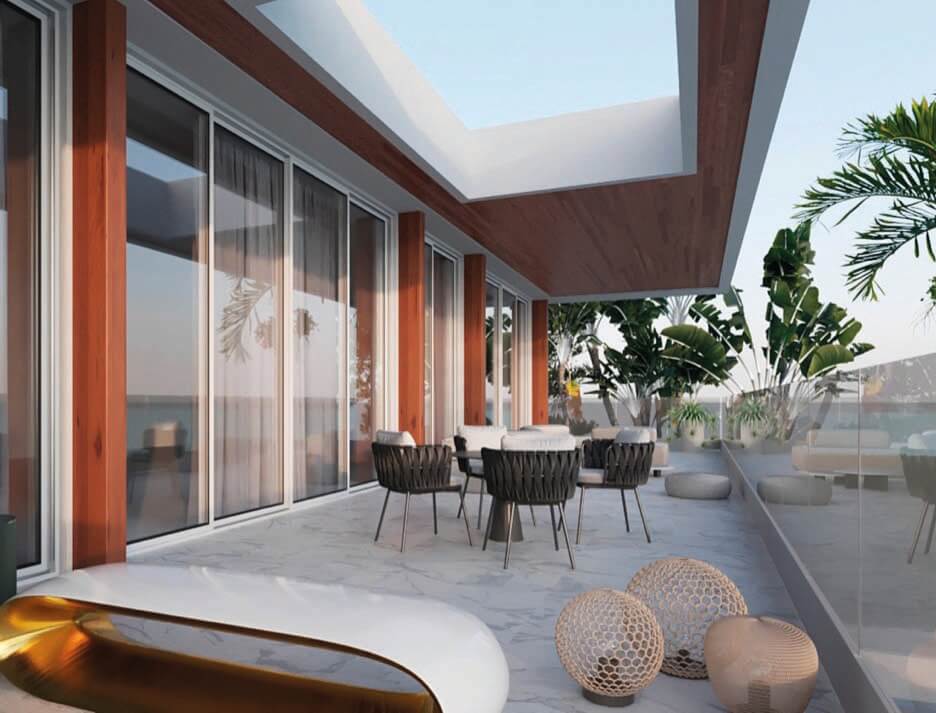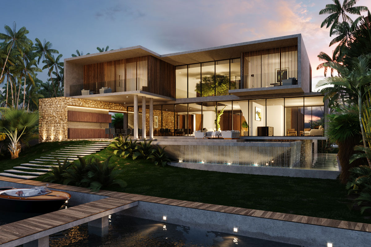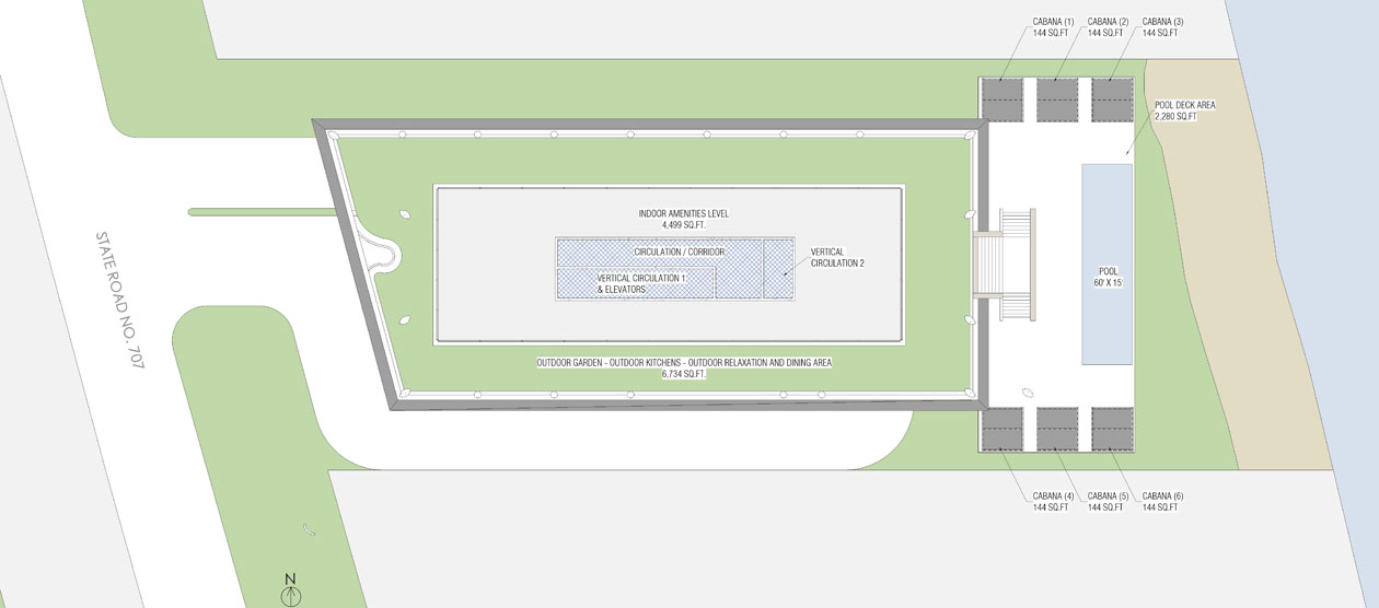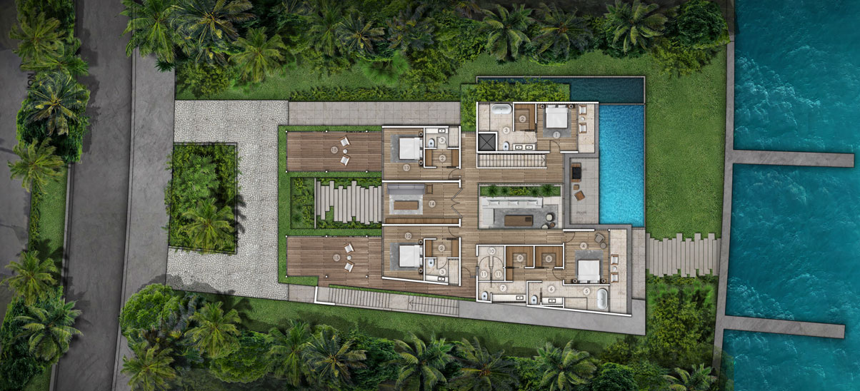 This design concept merges architectural elements of a caribbean bungalow and modern architecture. Proposed materiality includes thatched sloped roofs, copper elements and details, such as screen partitions, custom ceramic column covers, and wood paneling throughout the facades. 5,490 SF