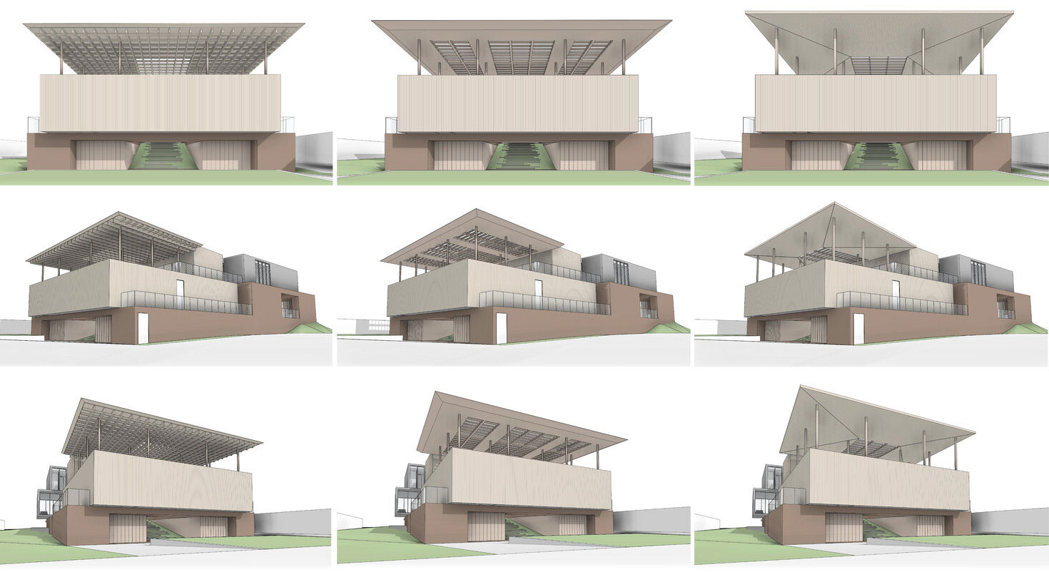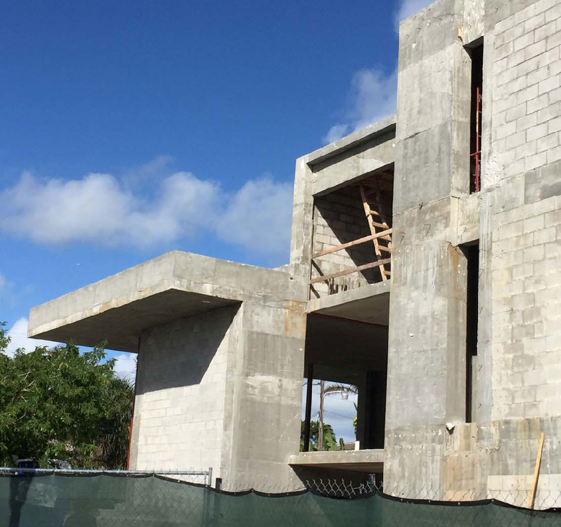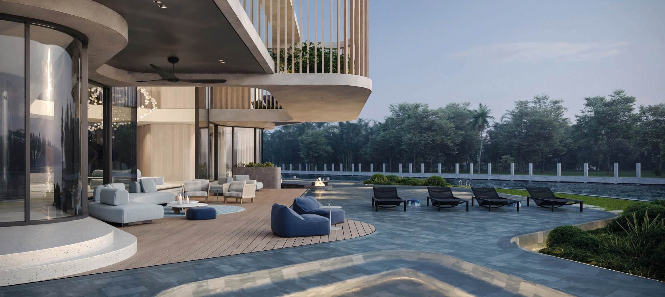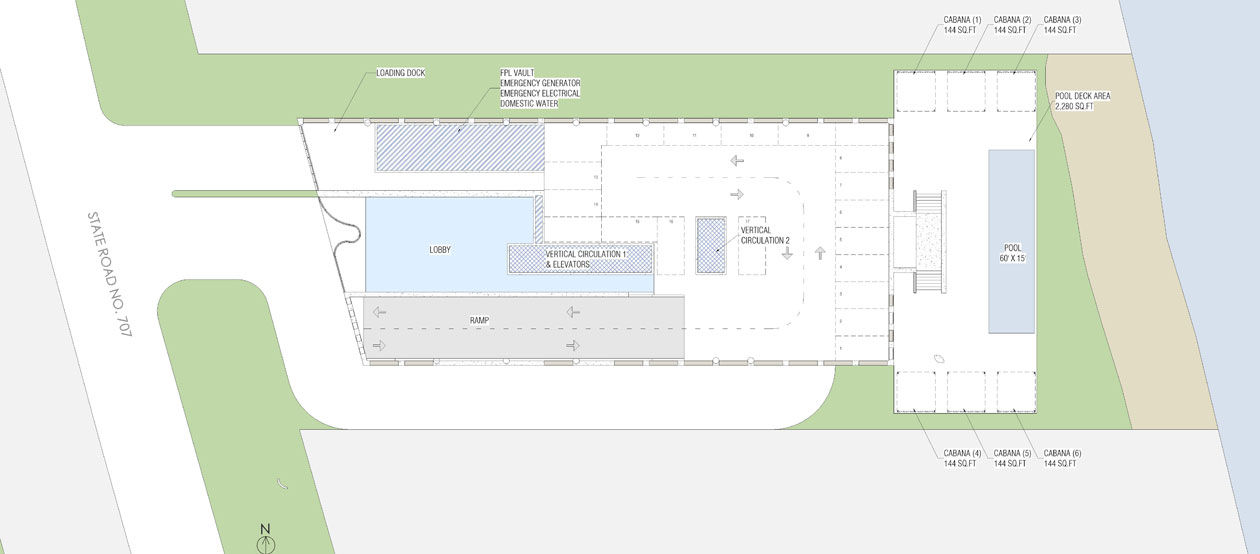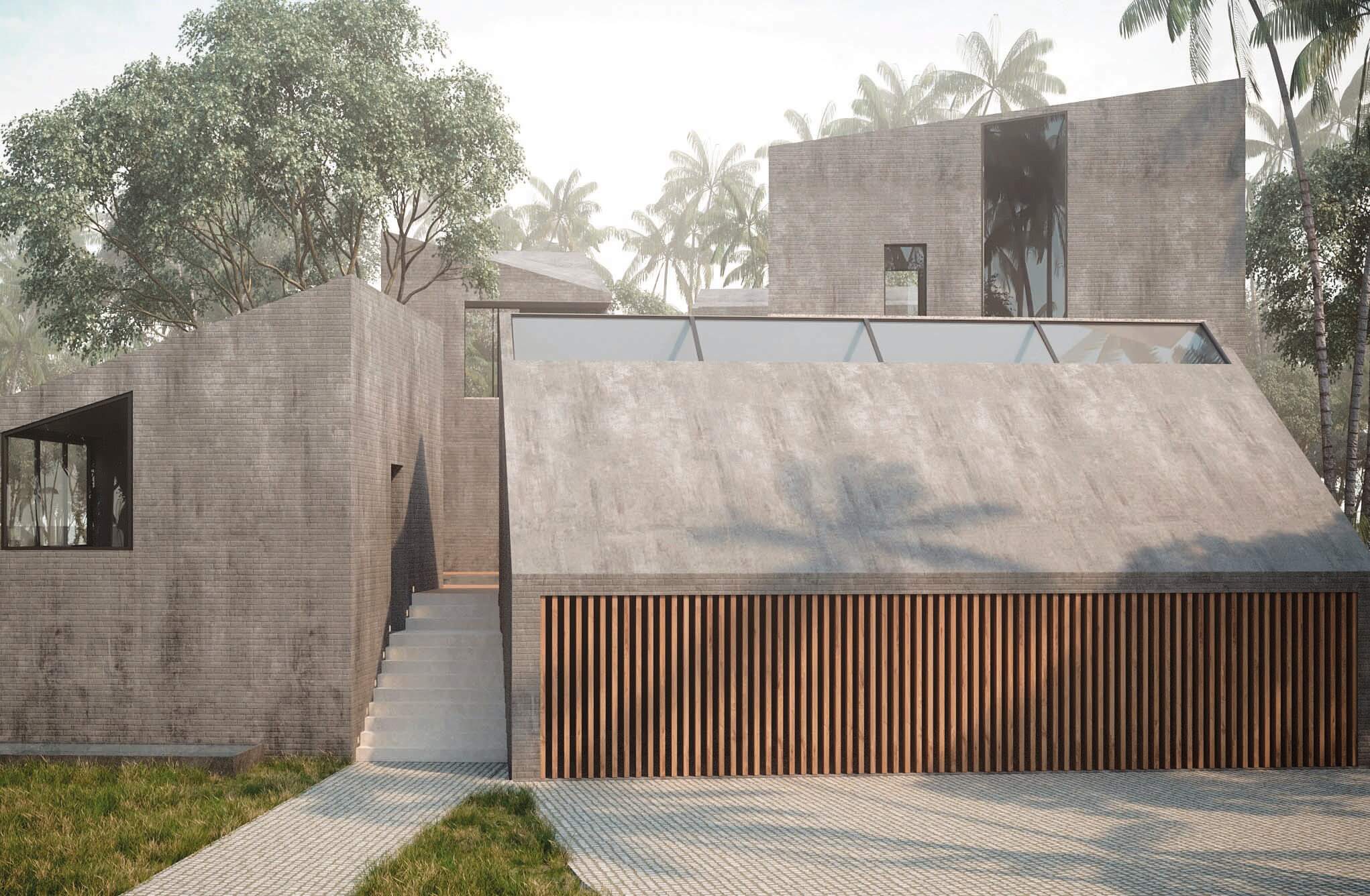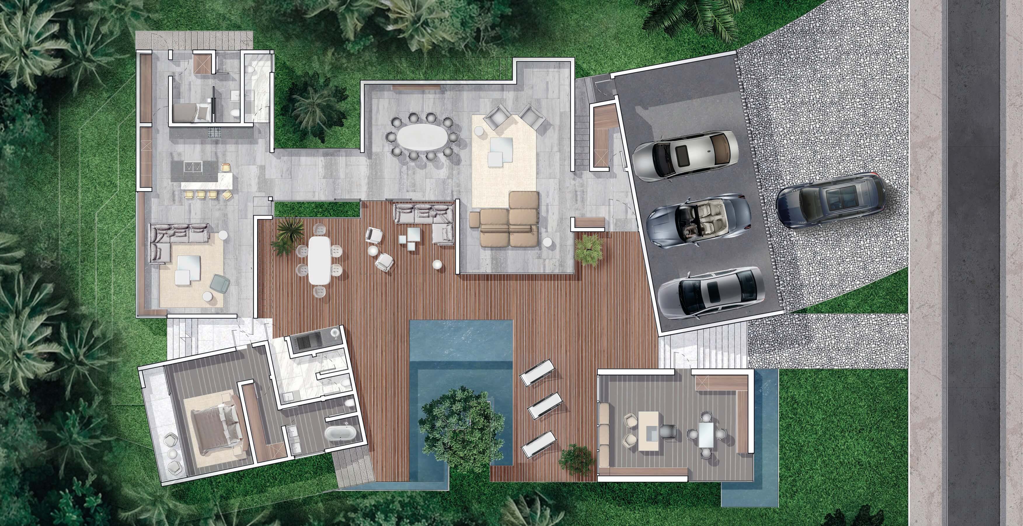 This design concept merges architectural elements of a caribbean bungalow and modern architecture. Proposed materiality includes thatched sloped roofs, copper elements and details, such as screen partitions, custom ceramic column covers, and wood paneling throughout the facades. 5,490 SF