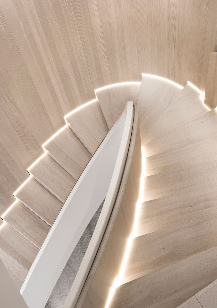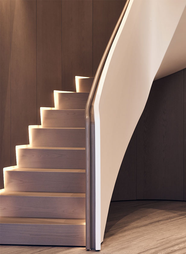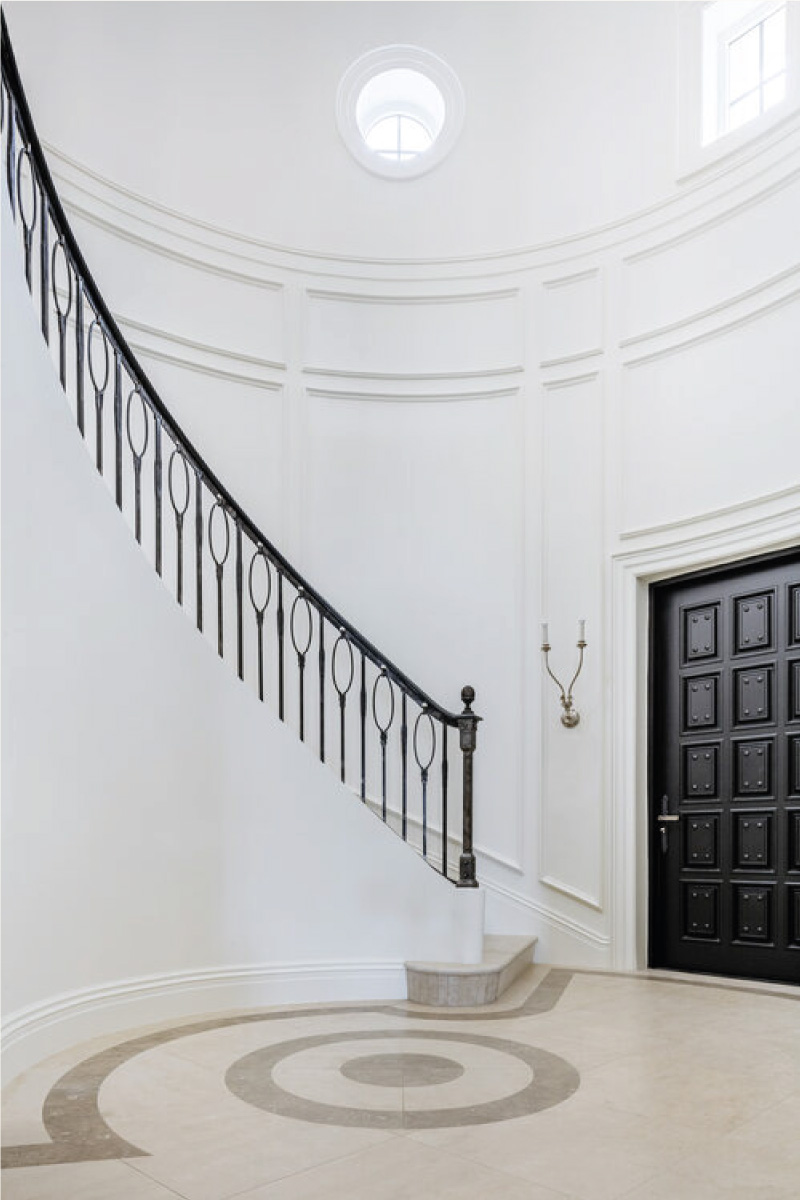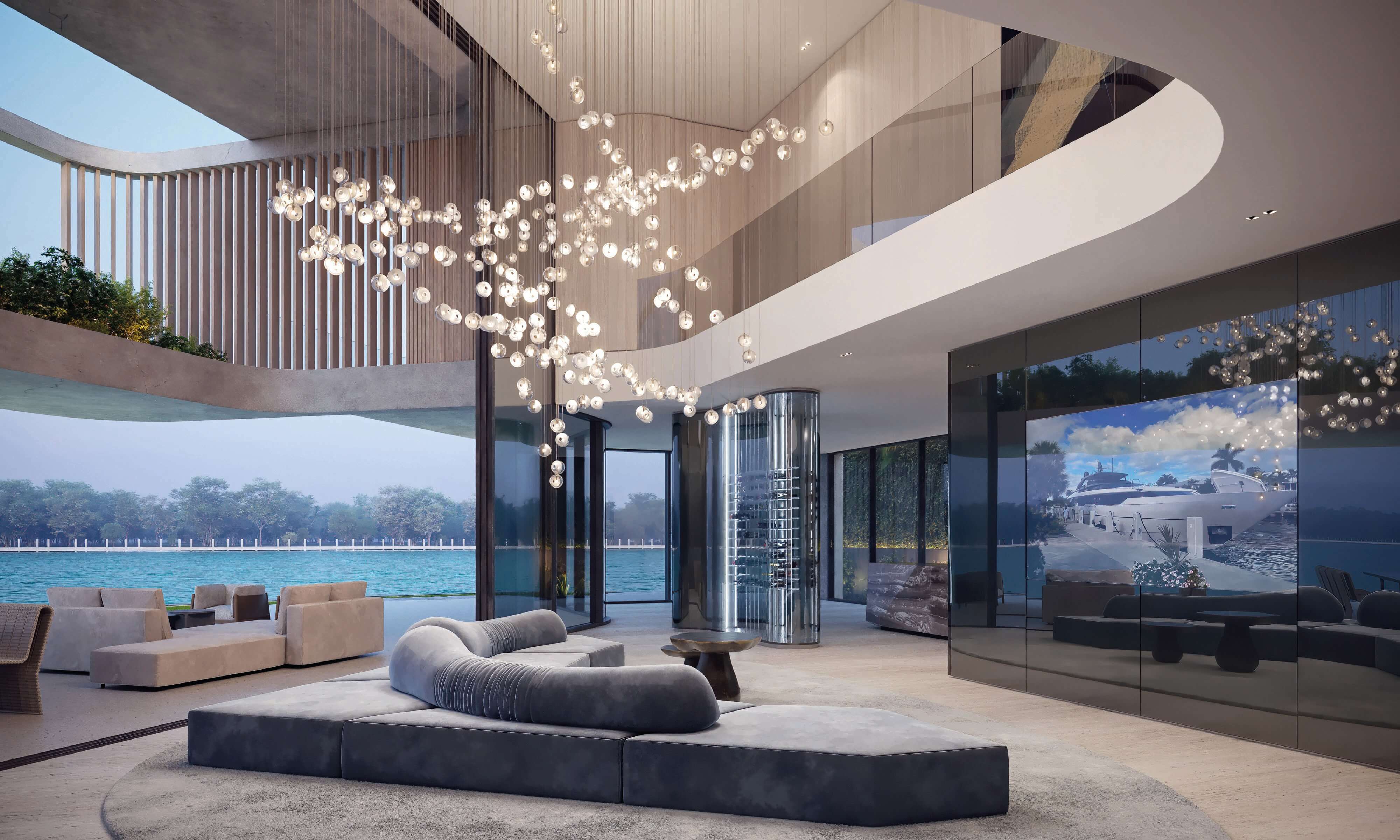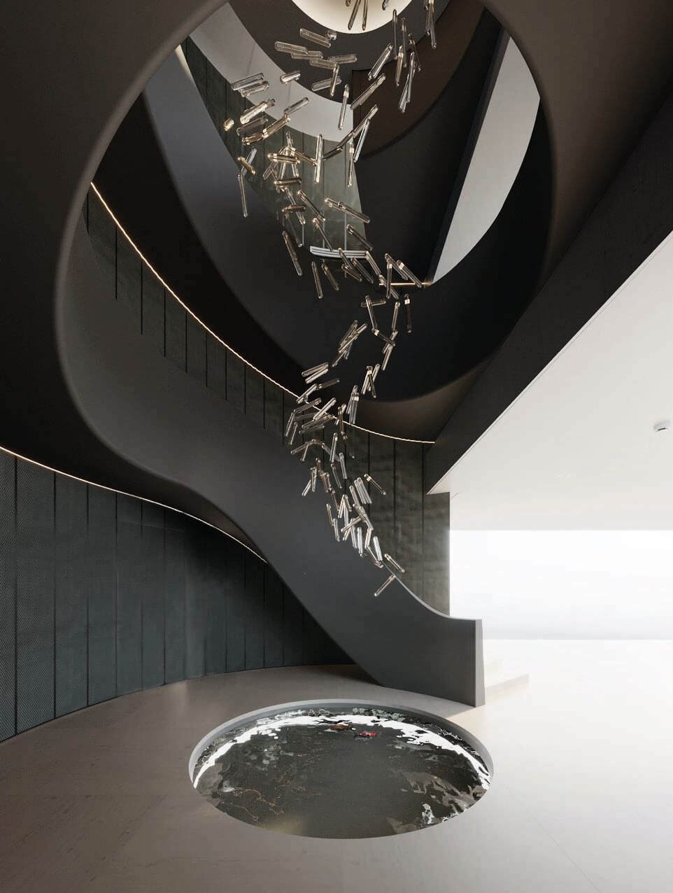 This was a specific need from the client, that we were able to accomplish by designing a space with a fit flooring finish for both situations, a lighting design that can be adjusted depending on the use and by designing several custom moveable division modules fit to modify and divide the space as needed. The scope of work also included a two-floor cabana by the bay, with a gym, a spa, and outdoor terraces. As for the full renovation to the existing house we designed in detail all and every room of the residence with a special highlight to the core of the house, the spiral staircase which we were able to completely transform into a soft lined, irregular, curved and seamless matt black staircase with a central cove at the top floor ceiling, from which a one of kind art piece chandelier, dropped down, to stop a few feet from a black concave water feature at the bottom, with hundreds of fiberoptics spotlights which mean to be the reflection of the lights above being absorbed into a dark hole.