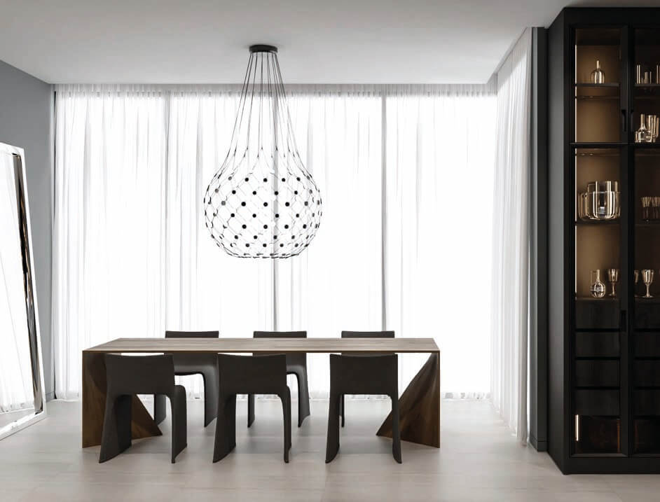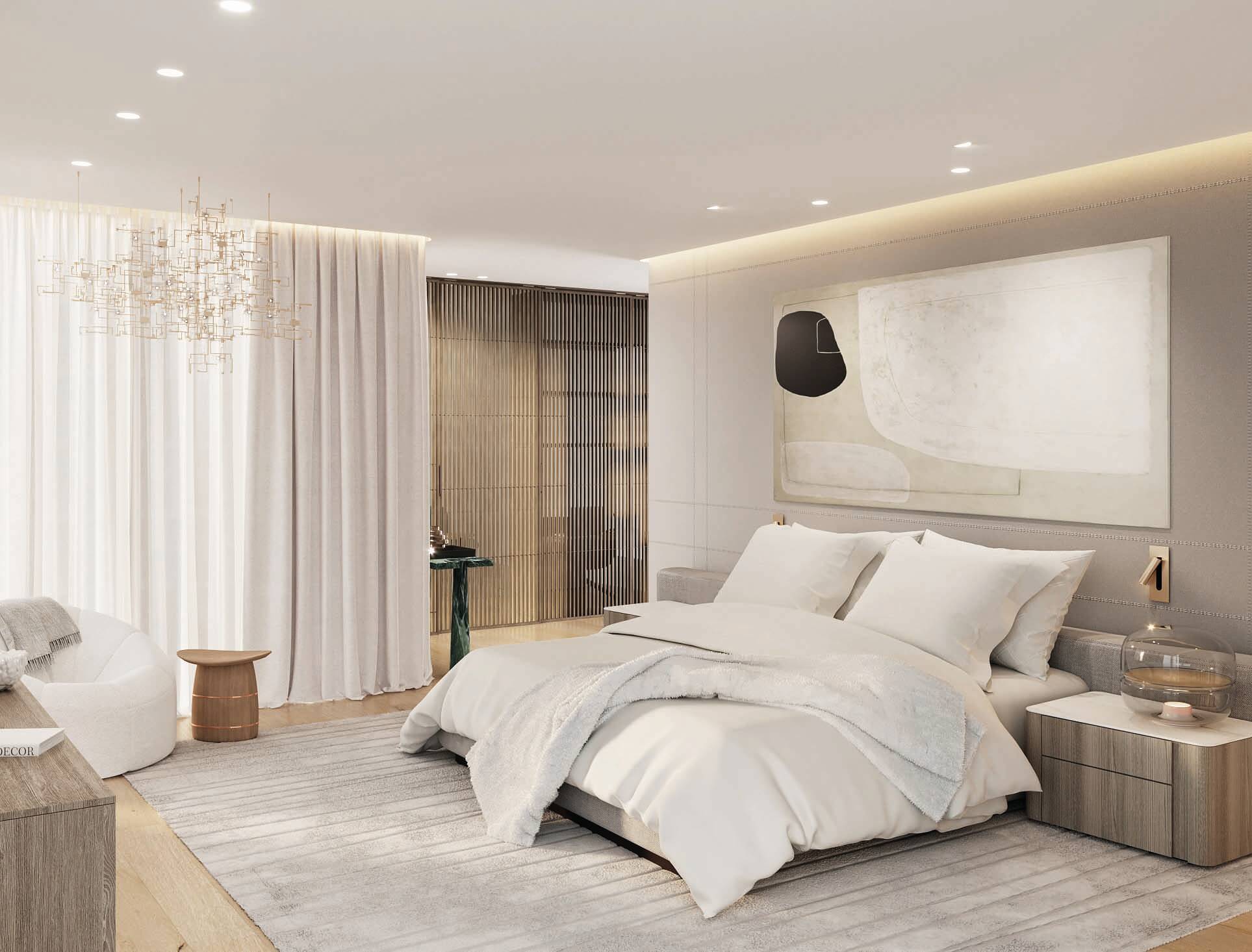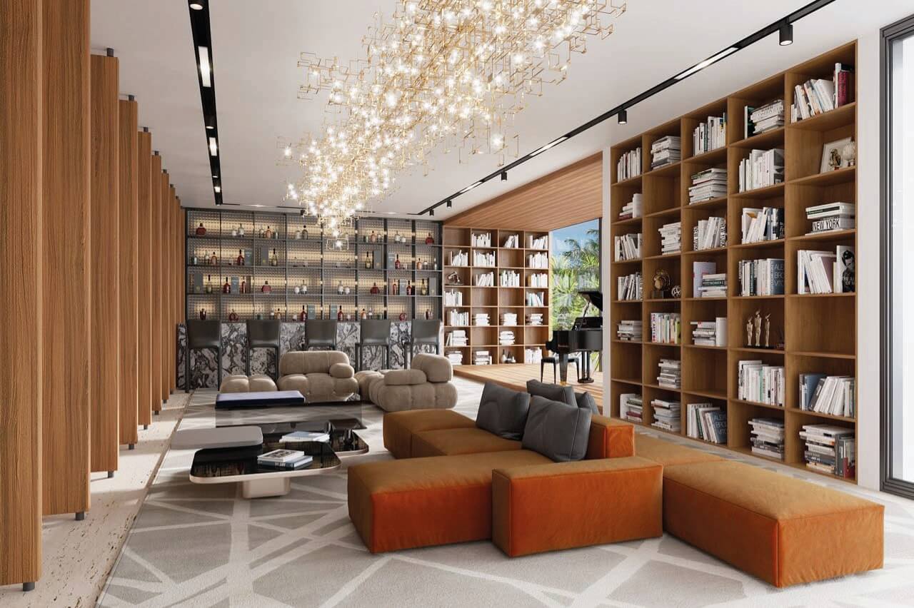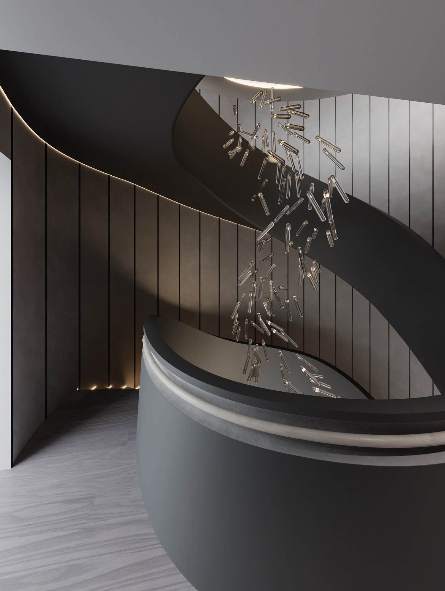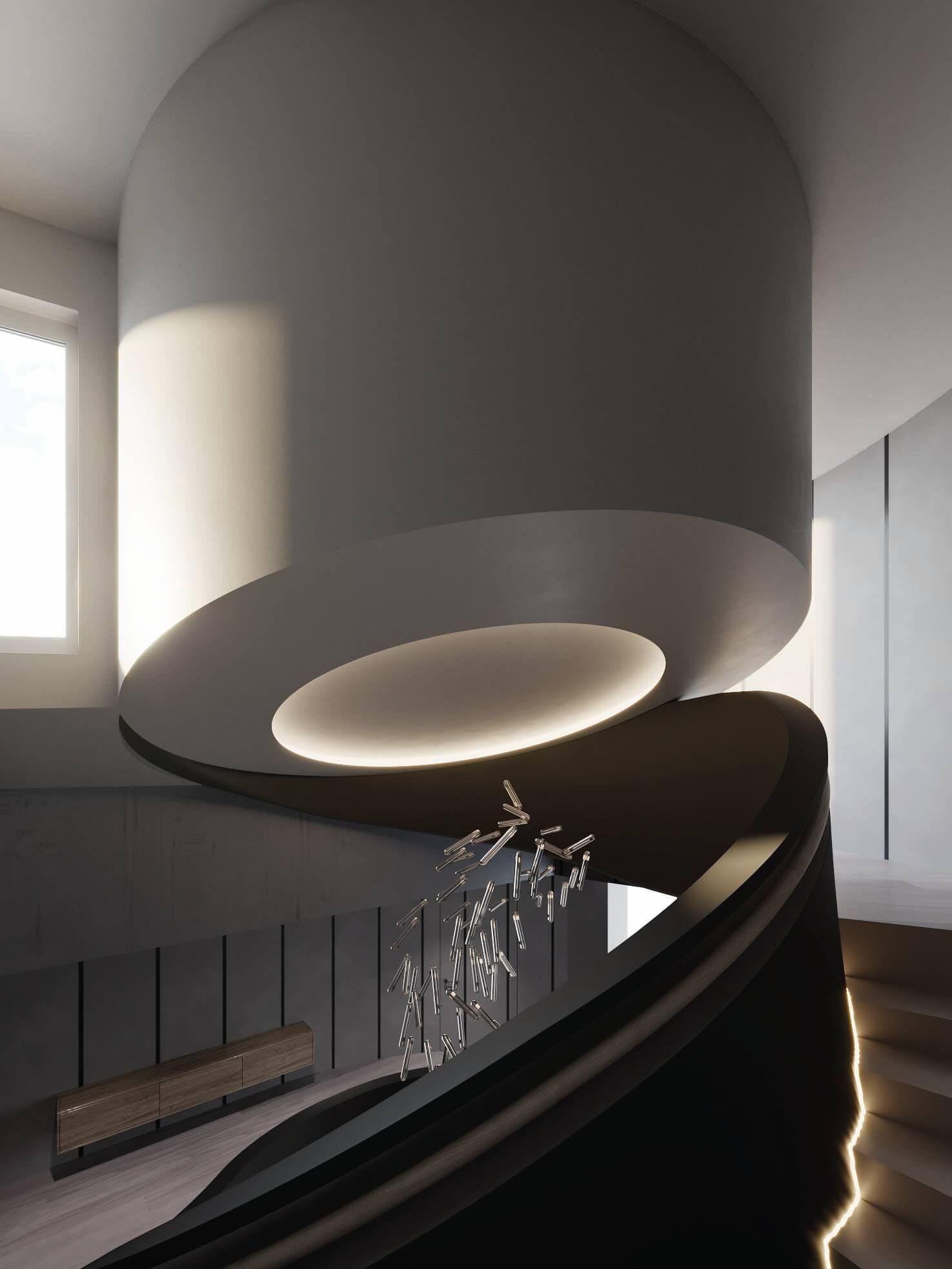 This was a specific need from the client, that we were able to accomplish by designing a space with a fit flooring finish for both situations, a lighting design that can be adjusted depending on the use and by designing several custom moveable division modules fit to modify and divide the space as needed. The scope of work also included a two-floor cabana by the bay, with a gym, a spa, and outdoor terraces. As for the full renovation to the existing house we designed in detail all and every room of the residence with a special highlight to the core of the house, the spiral staircase which we were able to completely transform into a soft lined, irregular, curved and seamless matt black staircase with a central cove at the top floor ceiling, from which a one of kind art piece chandelier, dropped down, to stop a few feet from a black concave water feature at the bottom, with hundreds of fiberoptics spotlights which mean to be the reflection of the lights above being absorbed into a dark hole.