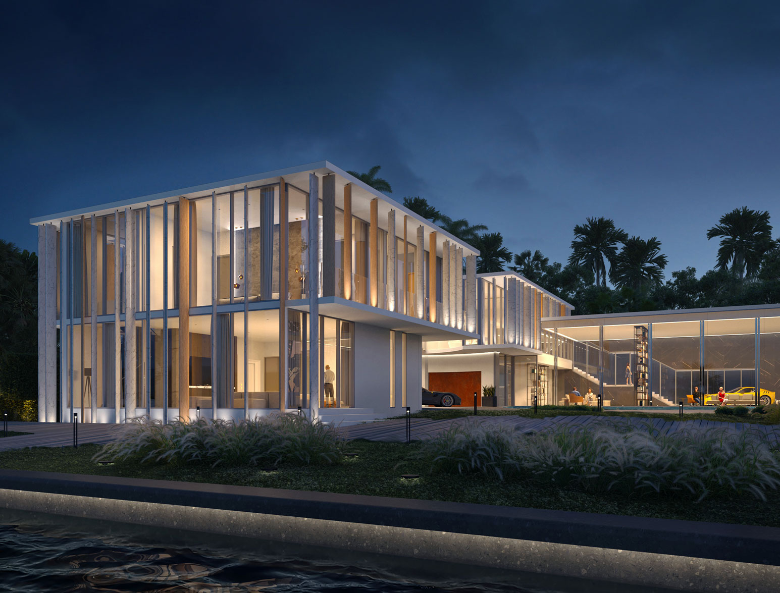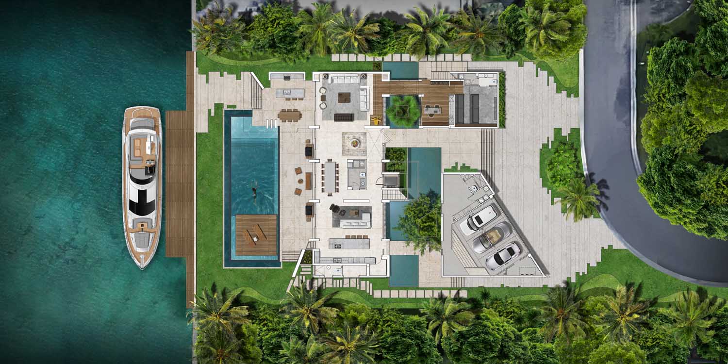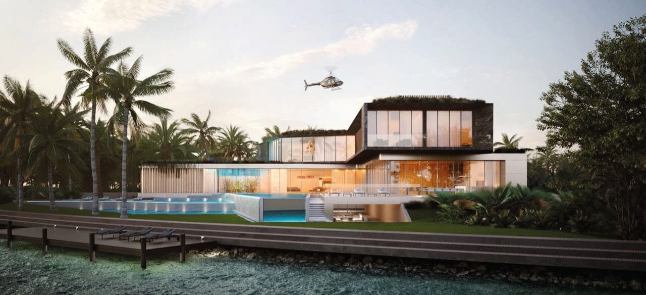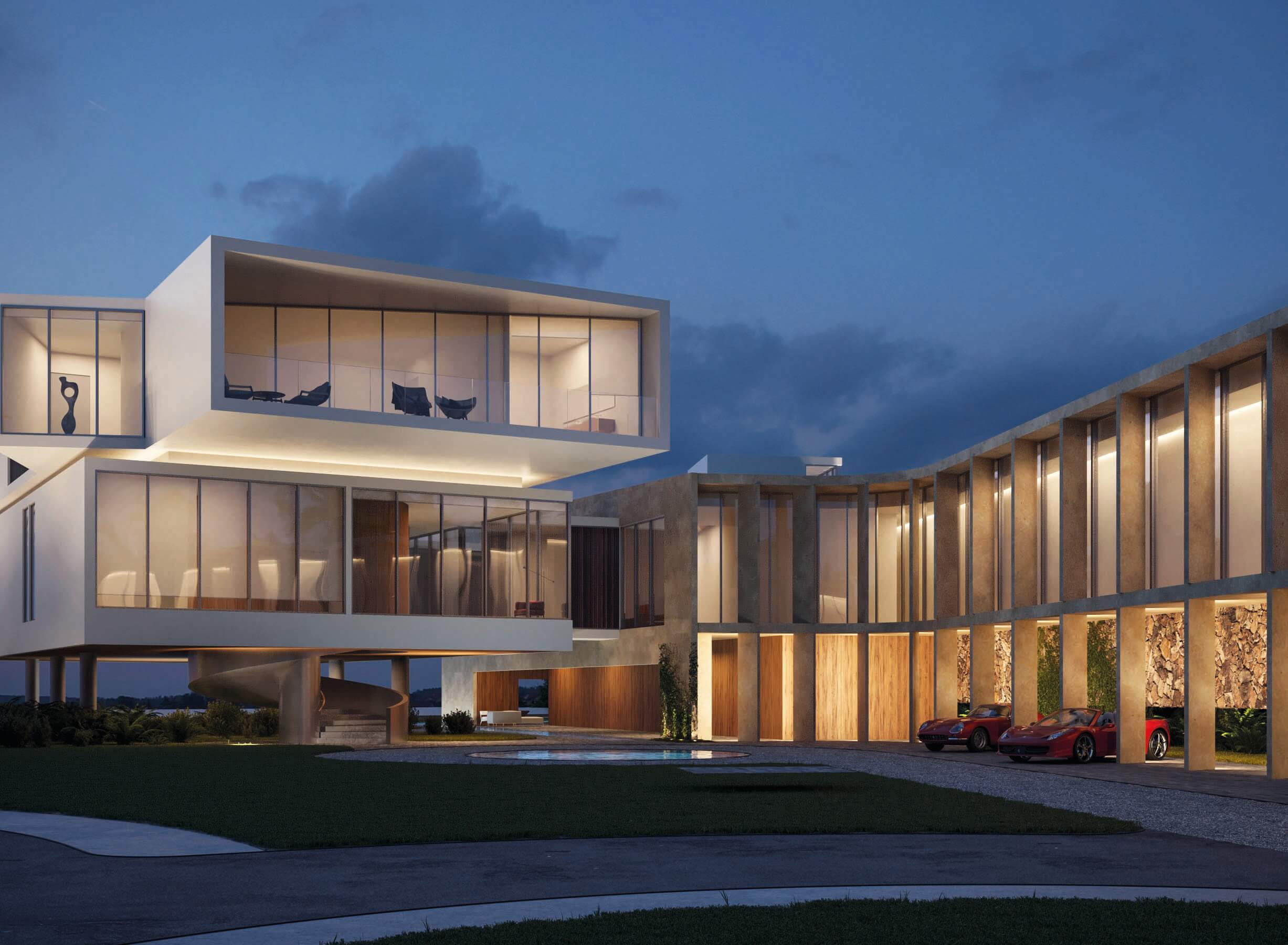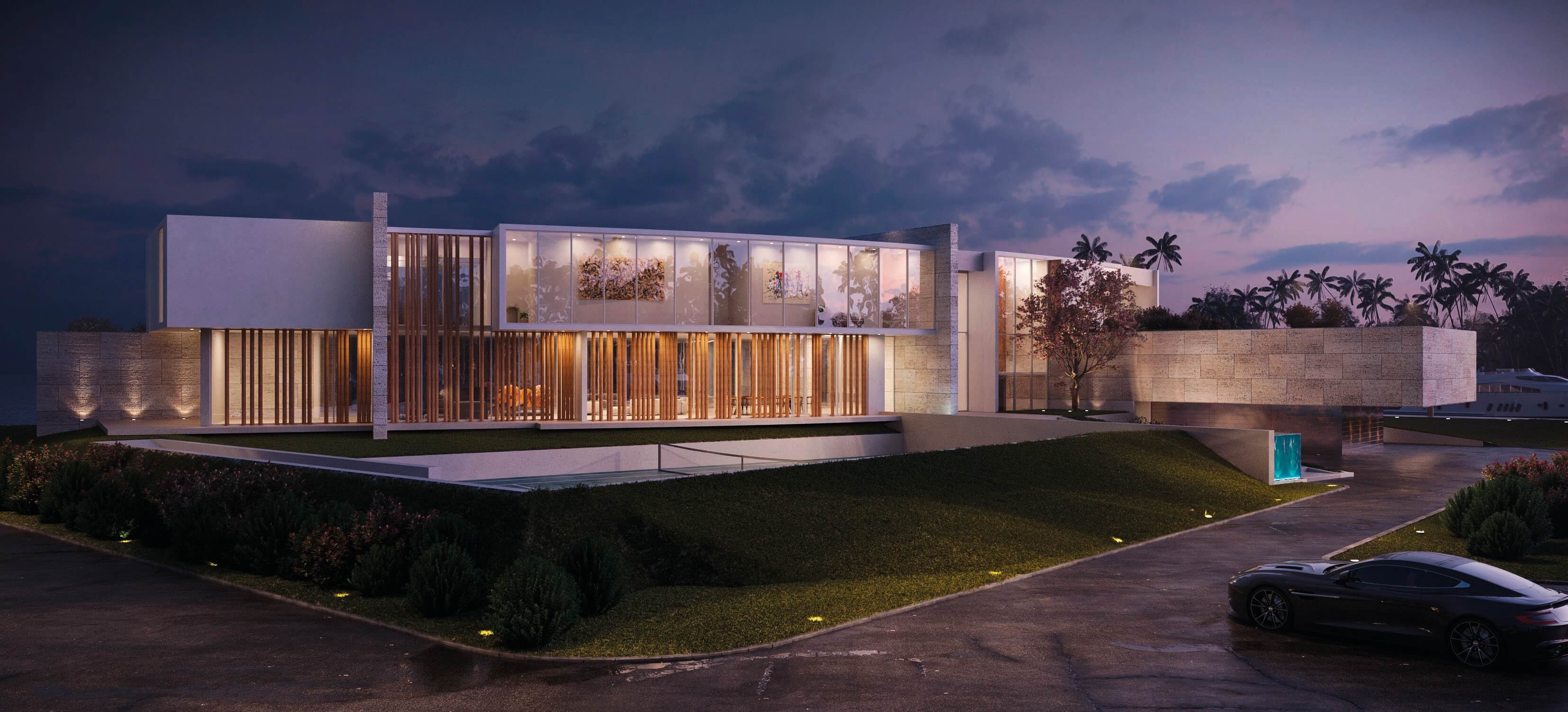 The project involved the combination of two water lots of 31,000 sq ft and 33,000 sq ft, with a total combined length of 270 linear feet by the water. The scope of the project was the full renovation of the existing residence on one of the lots, and the proposal of a magnificent two-floor entry Gate House to welcome you to the state, with a two floor Guest House with views to the bay and a gallery polyvalent space that can easily fluctuate from being a set of consecutive living areas to an exhibition 10 car gallery garage.
