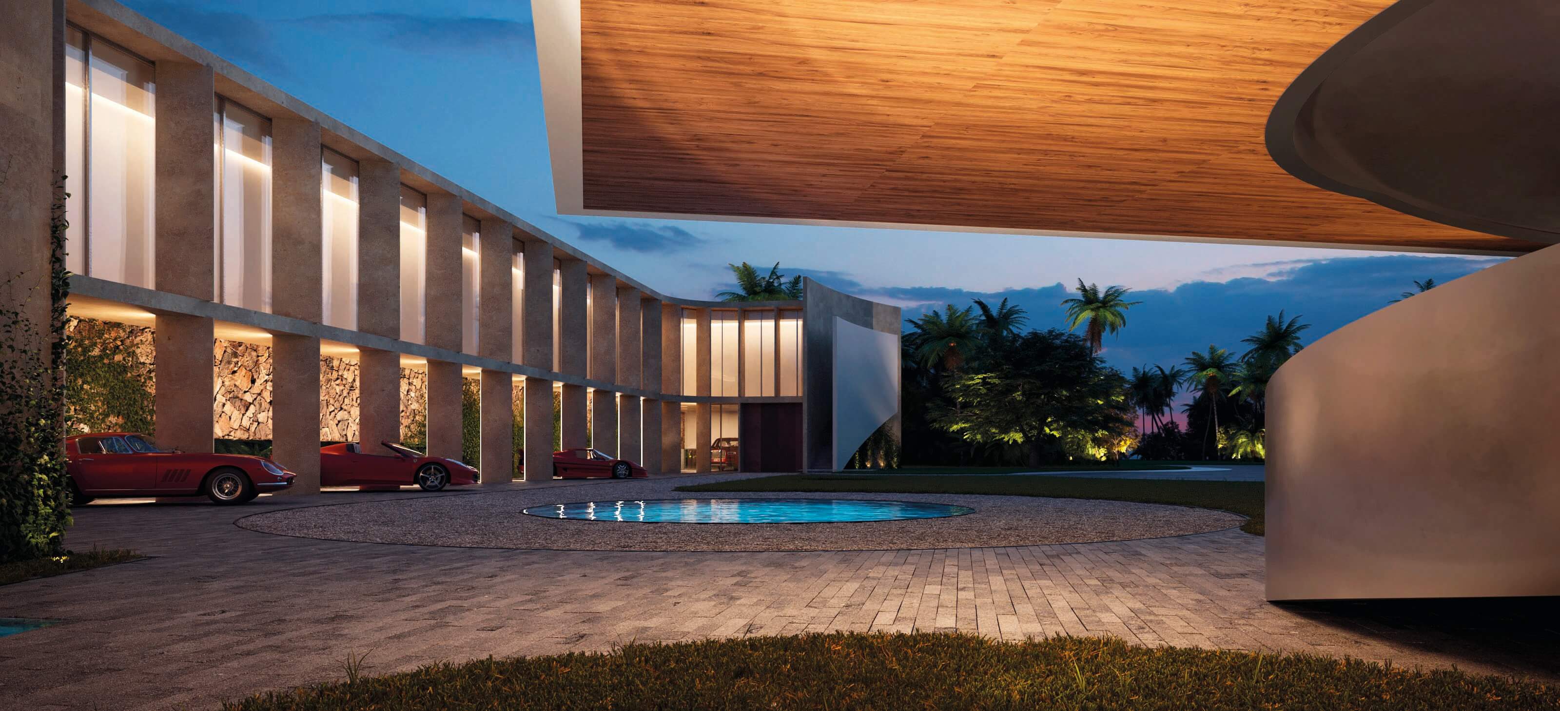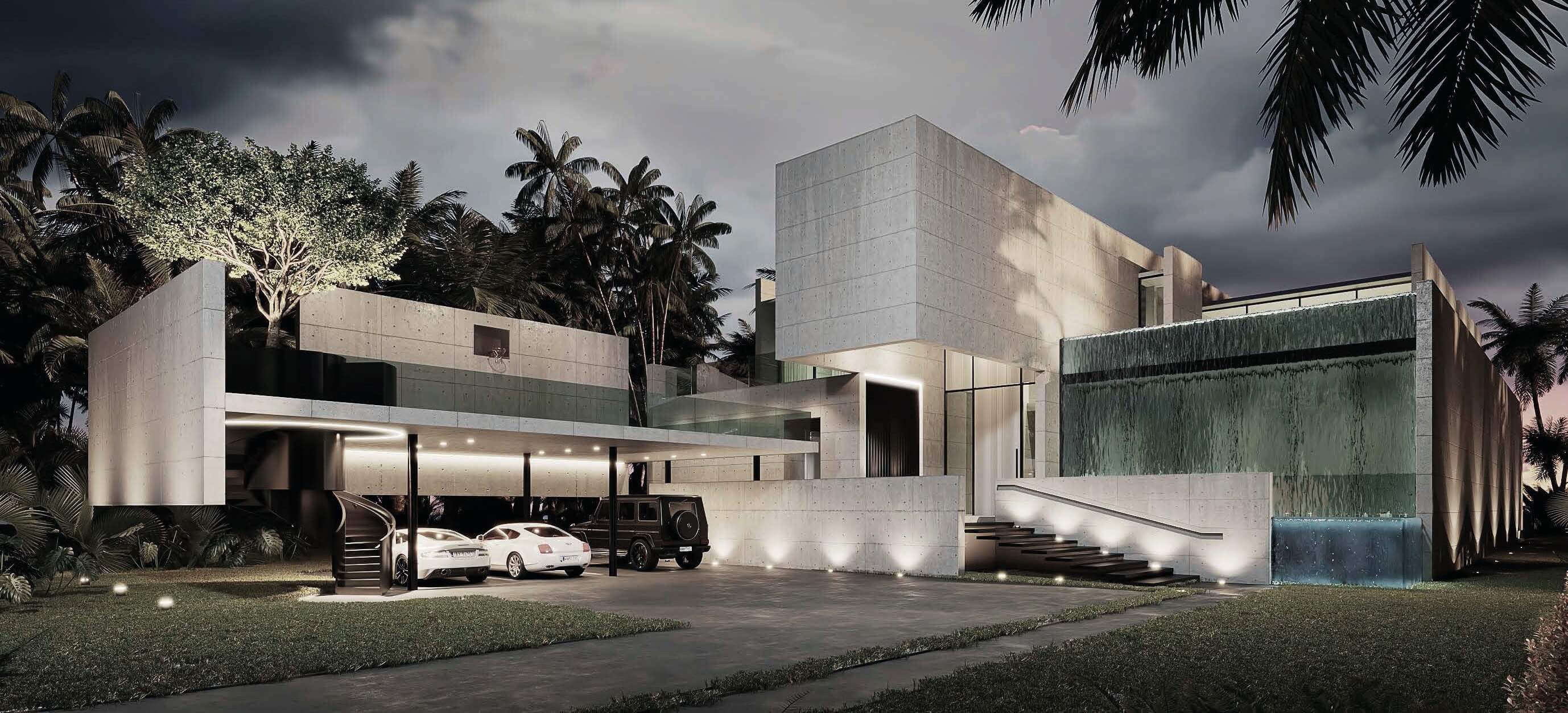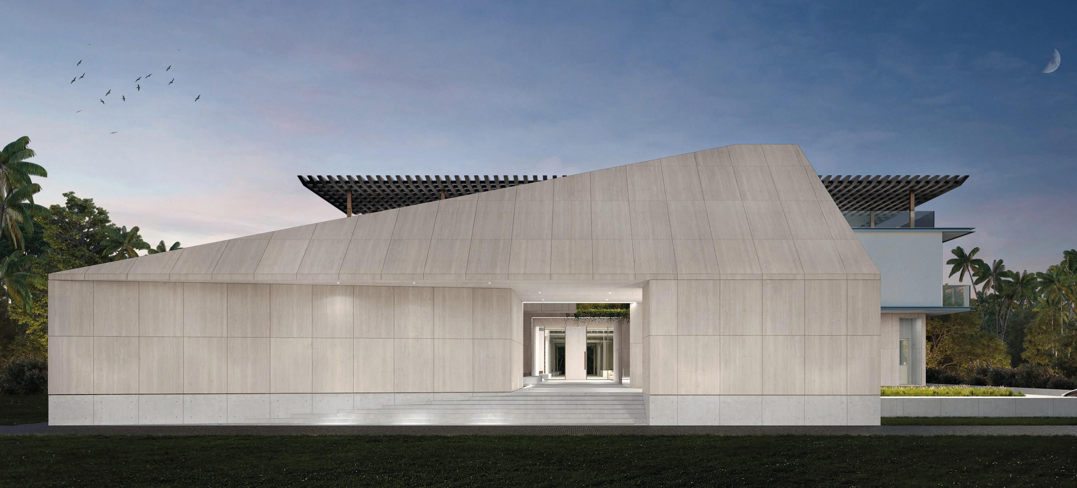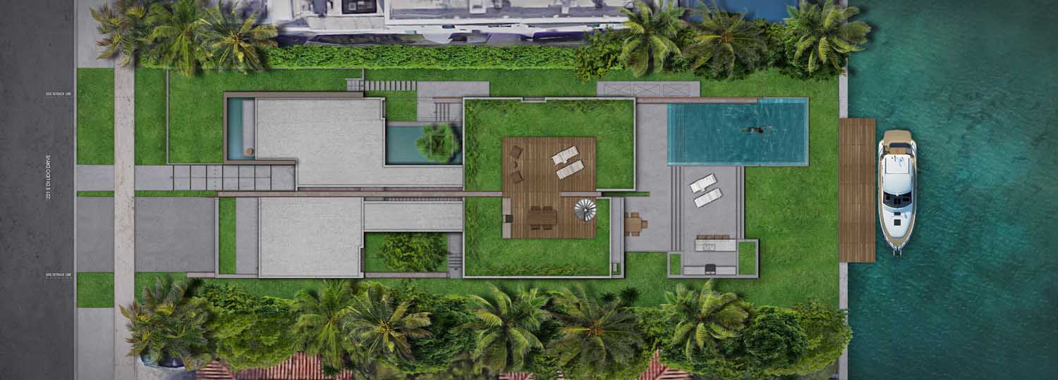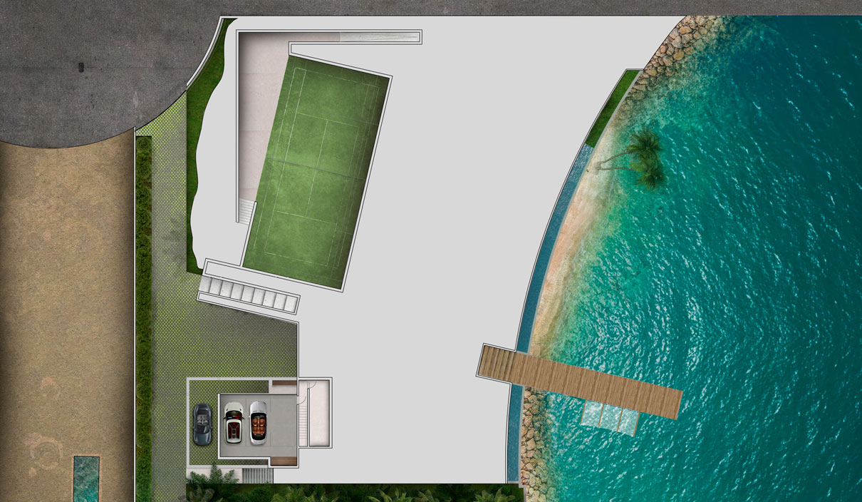 The particular condition of this 37,826 sq ft corner lot, with both its side and rear facing the water (this last one in a curved shape), was the trigger for the design concept of the project. An L shaped volume at the water corner, curved at Biscayne Bay’ side to open up the the view cone towards Miami beach, and to resemble the soft curves of a sail molded by the wind, is broken up by a main axis that connects both visually and physically the entrance and the water. Other vertical walls parallel to this axis and perpendicular to the curved main volume, break this one at different locations to delimit the spaces and to break the horizontality. The proposed materiality is a blend of white travertine, for the vertical elements, white stucco, ceramic louvers where a privacy veal is needed, stainless steel, gray volcanic stone for exterior hardscapes, glass, water and landscaping. The program is composed of a 4 car garage, a double height entrance, a chef’s kitchen, a back kitchen, service quarters, family room, formal dining room, living room, bar/music room, powder bathroom, a guest loft with private entrance, exterior lounge area, exterior dining area and summer kitchen, exterior pools and tennis court on the first floor. On the second floor, there’s a Master bedroom loft with a large private exterior terrace and a balcony, 4 bedrooms in suite and a VIP bedroom in suite. 14,200 SF