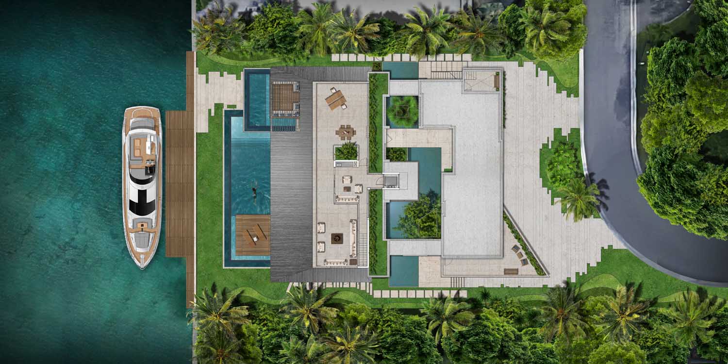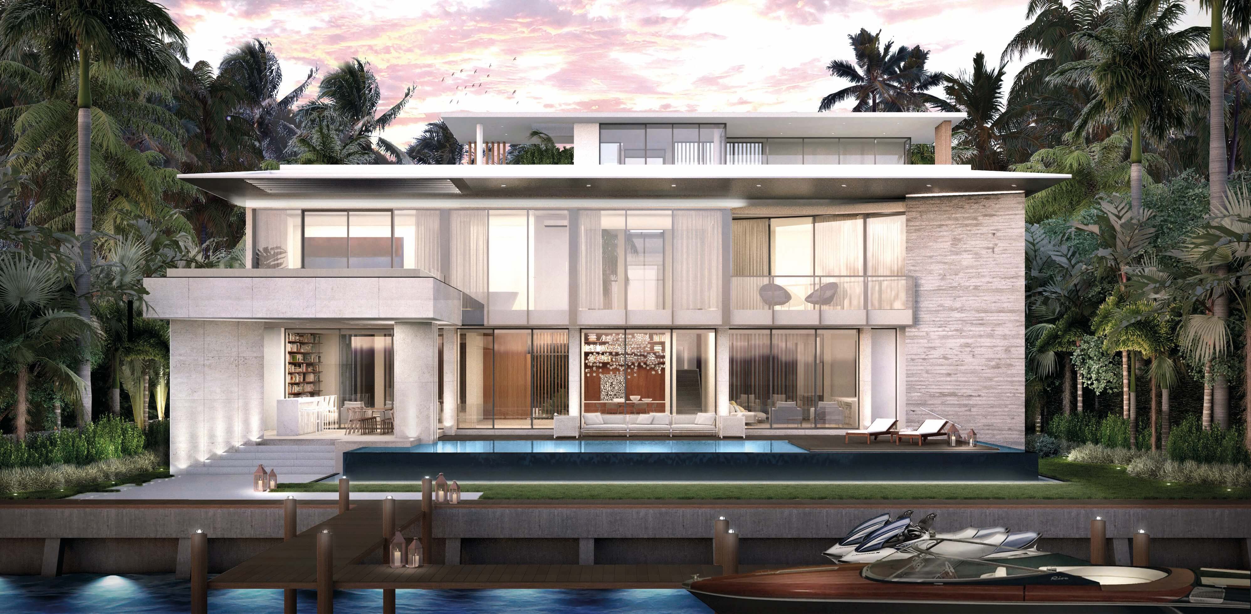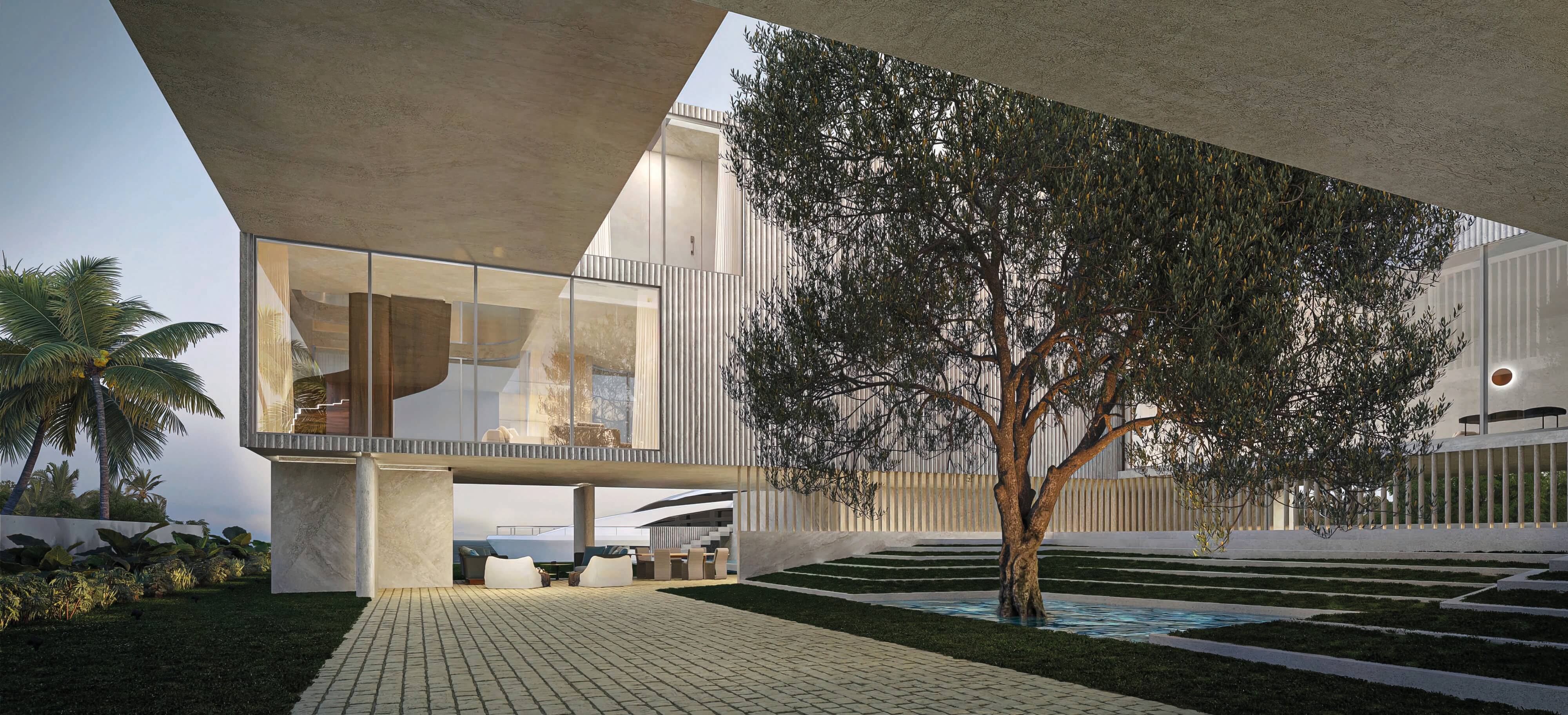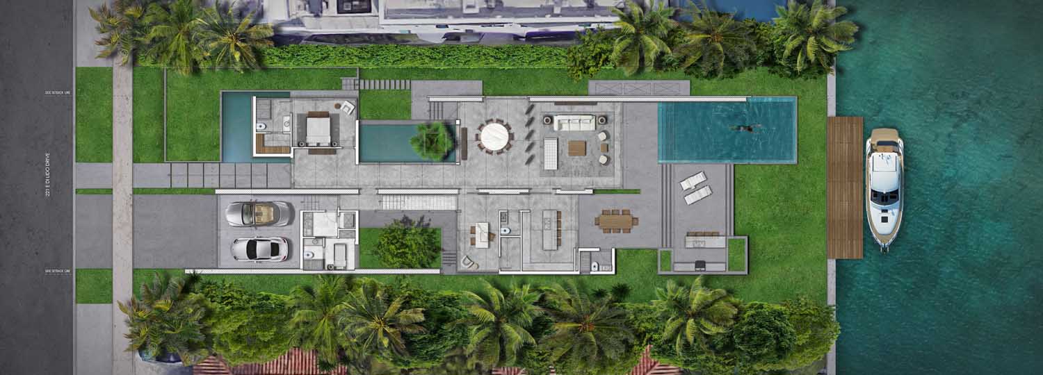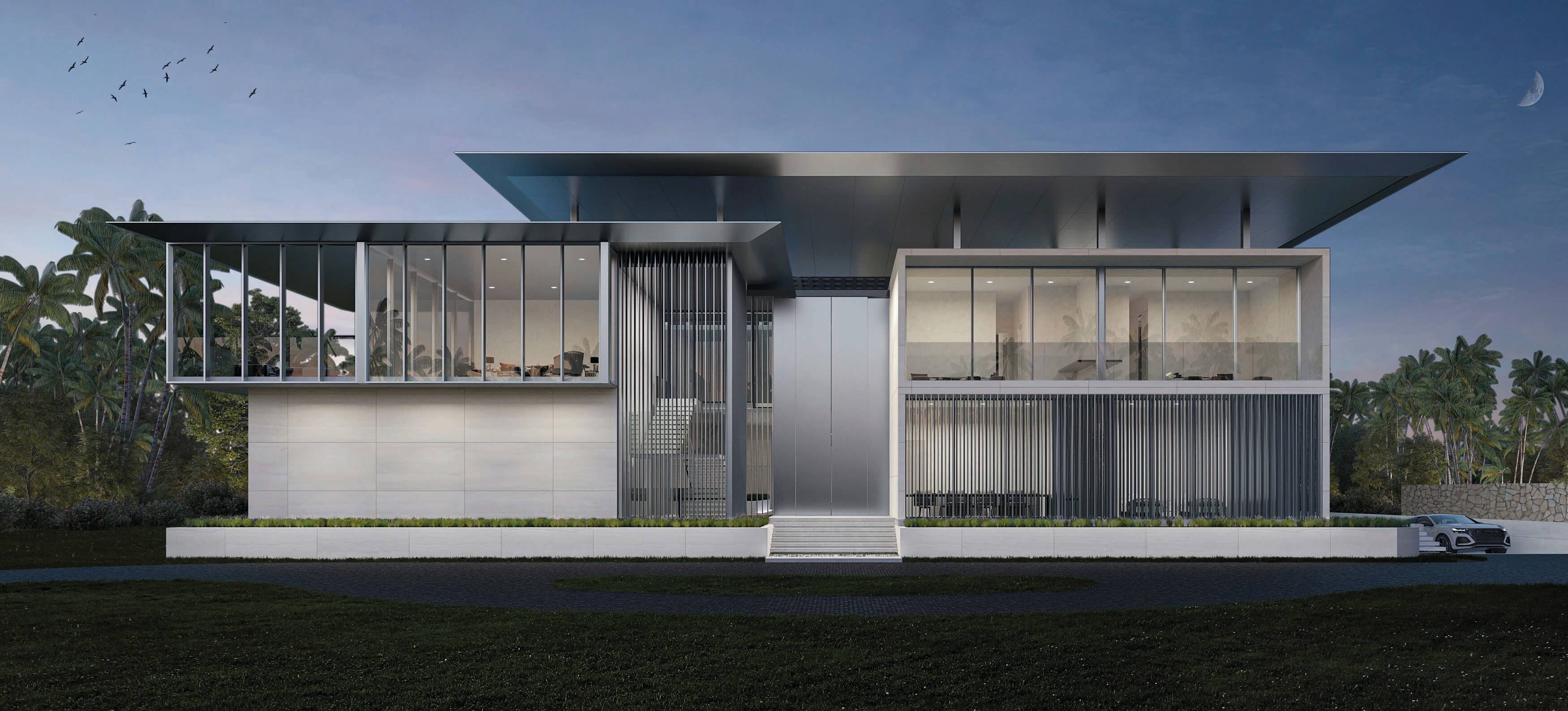 The particular condition of this 37,826 sq ft corner lot, with both its side and rear facing the water (this last one in a curved shape), was the trigger for the design concept of the project. An L shaped volume at the water corner, curved at Biscayne Bay’ side to open up the the view cone towards Miami beach, and to resemble the soft curves of a sail molded by the wind, is broken up by a main axis that connects both visually and physically the entrance and the water. Other vertical walls parallel to this axis and perpendicular to the curved main volume, break this one at different locations to delimit the spaces and to break the horizontality. The proposed materiality is a blend of white travertine, for the vertical elements, white stucco, ceramic louvers where a privacy veal is needed, stainless steel, gray volcanic stone for exterior hardscapes, glass, water and landscaping. The program is composed of a 4 car garage, a double height entrance, a chef’s kitchen, a back kitchen, service quarters, family room, formal dining room, living room, bar/music room, powder bathroom, a guest loft with private entrance, exterior lounge area, exterior dining area and summer kitchen, exterior pools and tennis court on the first floor. On the second floor, there’s a Master bedroom loft with a large private exterior terrace and a balcony, 4 bedrooms in suite and a VIP bedroom in suite. 14,200 SF