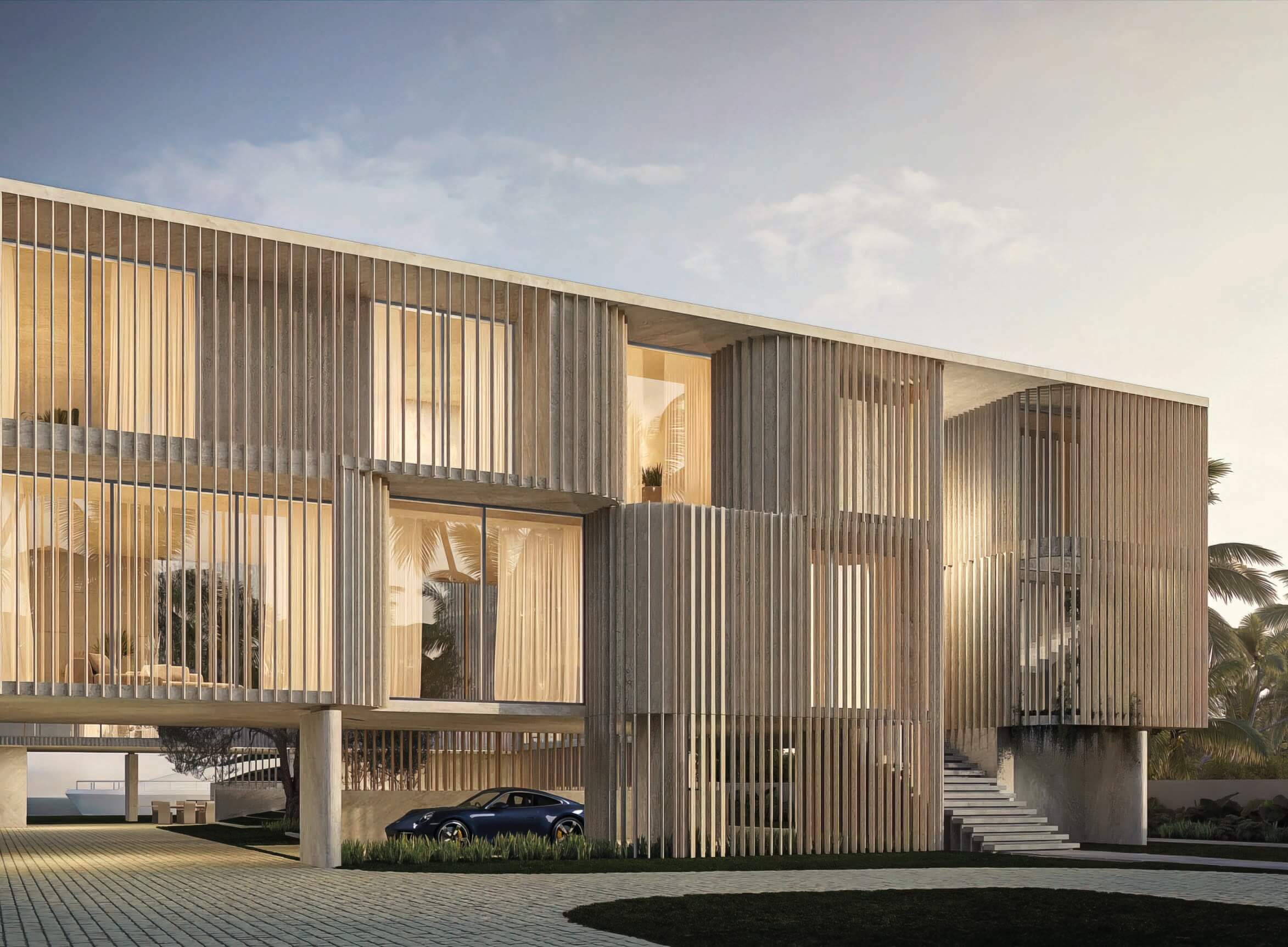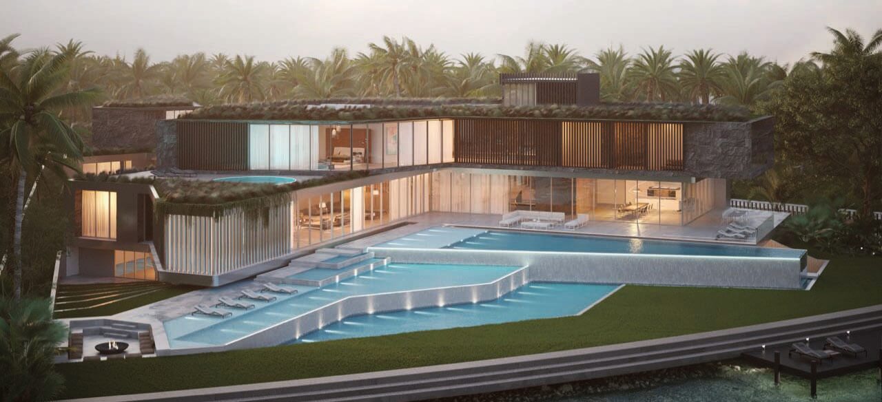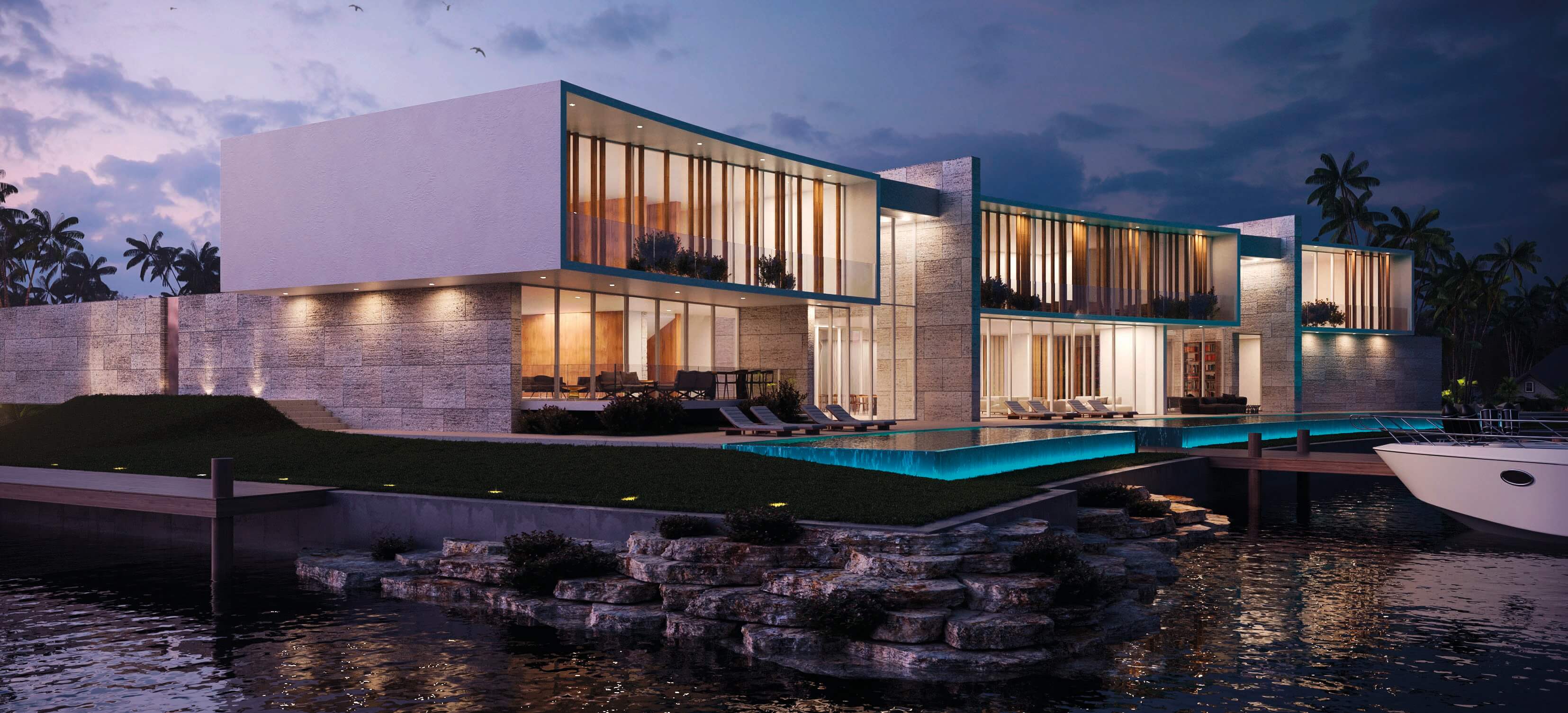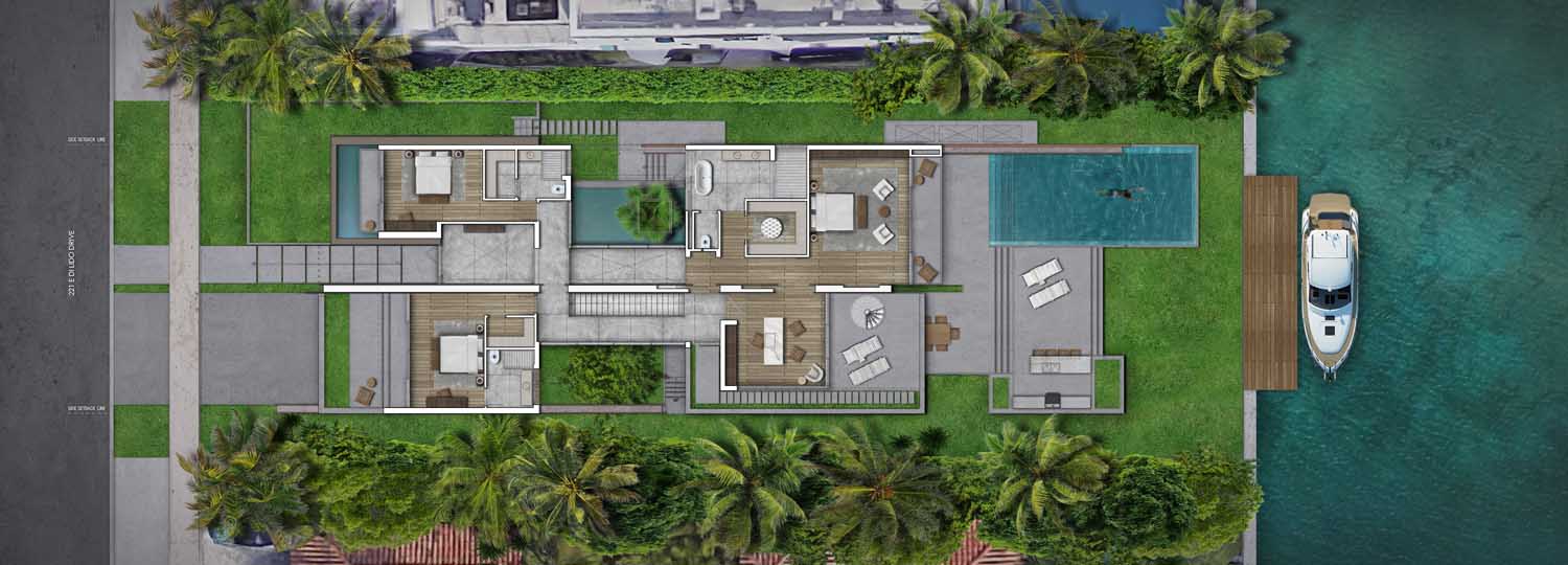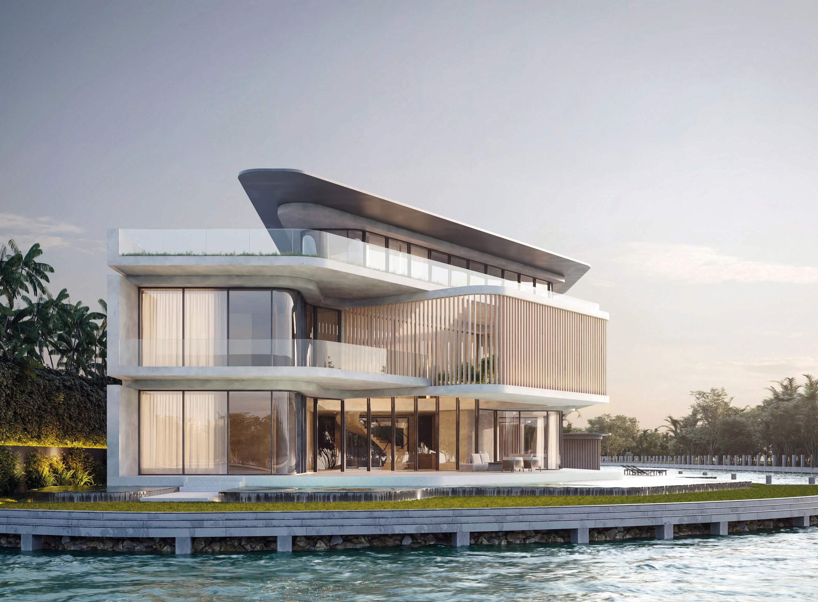 The particular condition of this 37,826 sq ft corner lot, with both its side and rear facing the water (this last one in a curved shape), was the trigger for the design concept of the project. An L shaped volume at the water corner, curved at Biscayne Bay’ side to open up the the view cone towards Miami beach, and to resemble the soft curves of a sail molded by the wind, is broken up by a main axis that connects both visually and physically the entrance and the water. Other vertical walls parallel to this axis and perpendicular to the curved main volume, break this one at different locations to delimit the spaces and to break the horizontality. The proposed materiality is a blend of white travertine, for the vertical elements, white stucco, ceramic louvers where a privacy veal is needed, stainless steel, gray volcanic stone for exterior hardscapes, glass, water and landscaping. The program is composed of a 4 car garage, a double height entrance, a chef’s kitchen, a back kitchen, service quarters, family room, formal dining room, living room, bar/music room, powder bathroom, a guest loft with private entrance, exterior lounge area, exterior dining area and summer kitchen, exterior pools and tennis court on the first floor. On the second floor, there’s a Master bedroom loft with a large private exterior terrace and a balcony, 4 bedrooms in suite and a VIP bedroom in suite. 14,200 SF