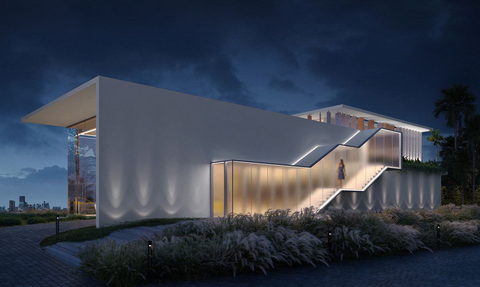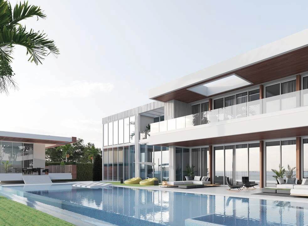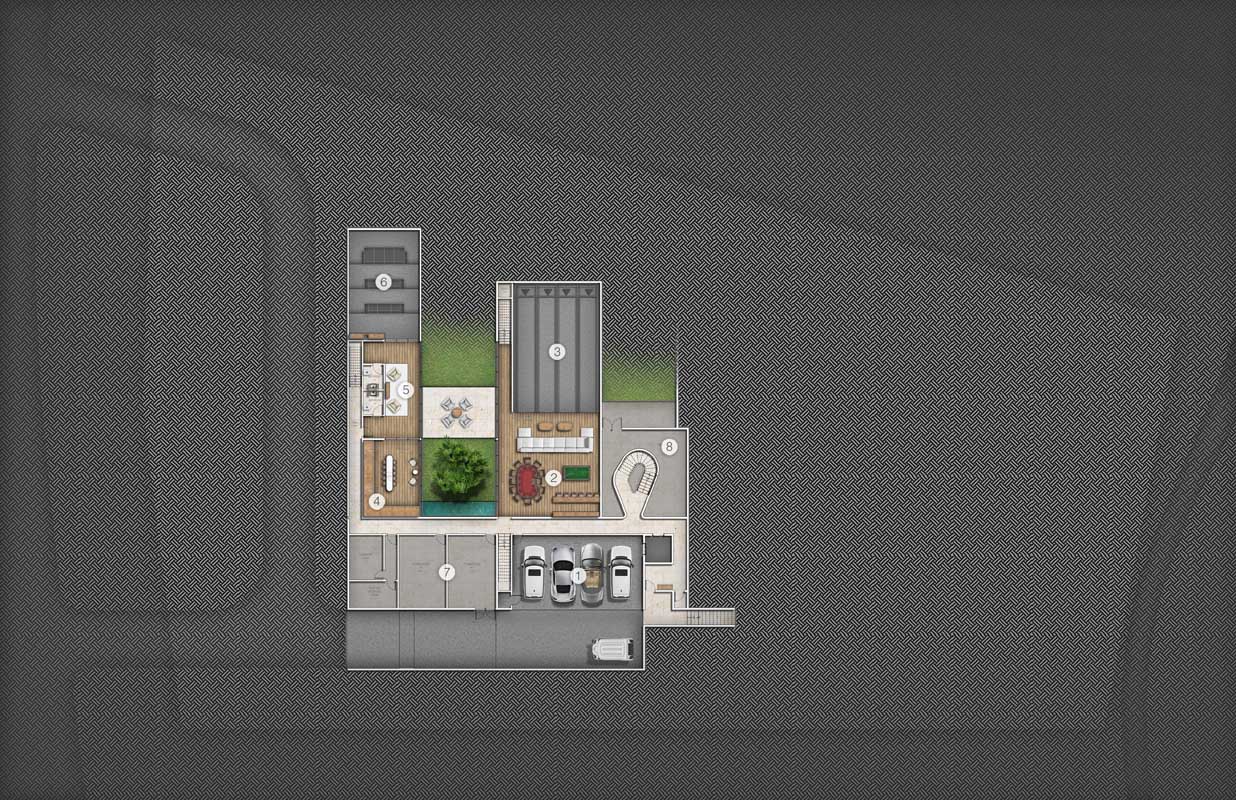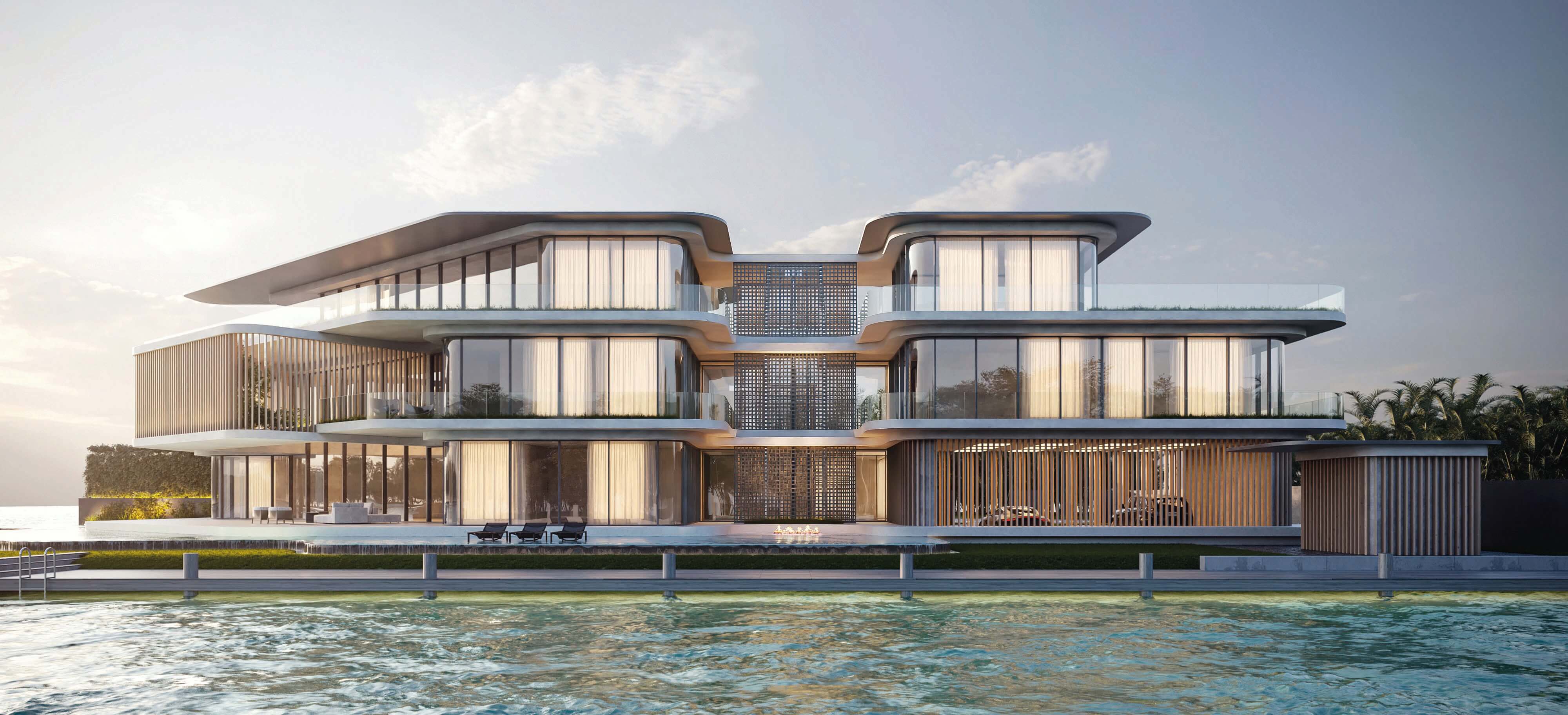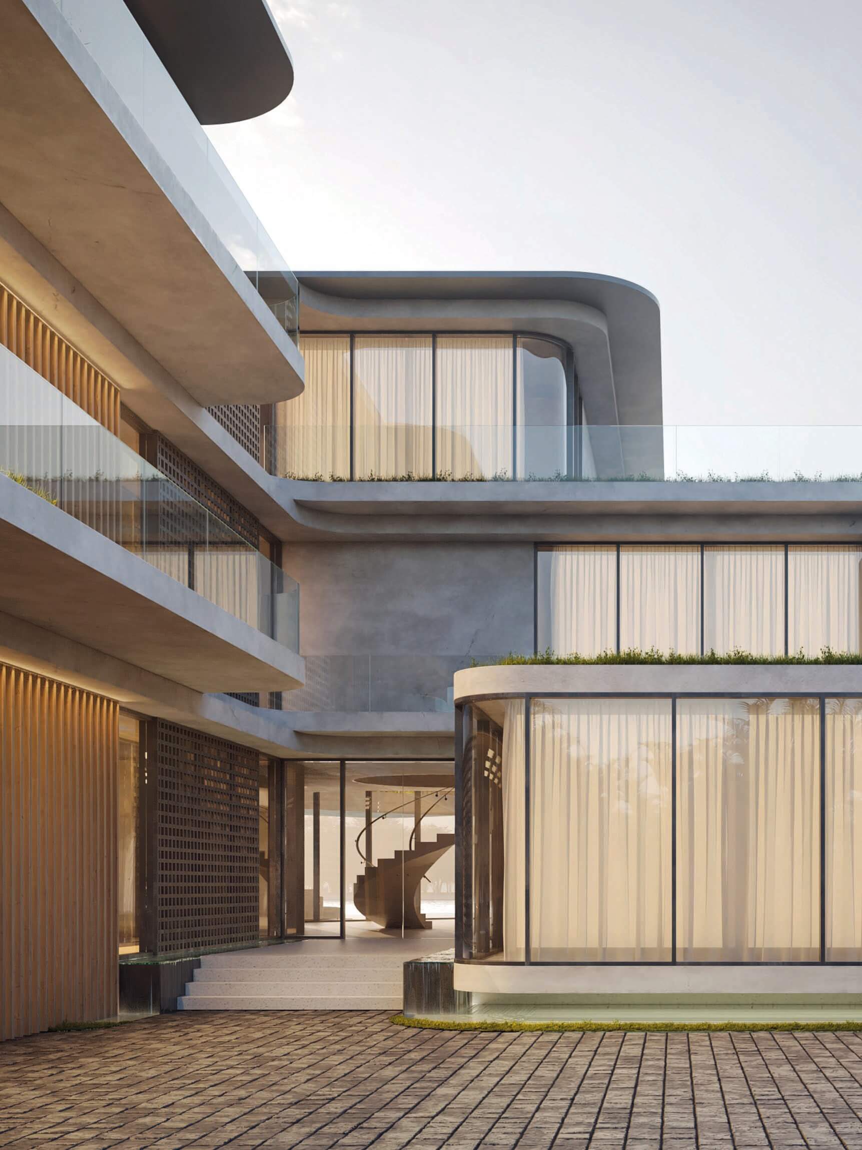 The particular condition of this 37,826 sq ft corner lot, with both its side and rear facing the water (this last one in a curved shape), was the trigger for the design concept of the project. An L shaped volume at the water corner, curved at Biscayne Bay’ side to open up the the view cone towards Miami beach, and to resemble the soft curves of a sail molded by the wind, is broken up by a main axis that connects both visually and physically the entrance and the water. Other vertical walls parallel to this axis and perpendicular to the curved main volume, break this one at different locations to delimit the spaces and to break the horizontality. The proposed materiality is a blend of white travertine, for the vertical elements, white stucco, ceramic louvers where a privacy veal is needed, stainless steel, gray volcanic stone for exterior hardscapes, glass, water and landscaping. The program is composed of a 4 car garage, a double height entrance, a chef’s kitchen, a back kitchen, service quarters, family room, formal dining room, living room, bar/music room, powder bathroom, a guest loft with private entrance, exterior lounge area, exterior dining area and summer kitchen, exterior pools and tennis court on the first floor. On the second floor, there’s a Master bedroom loft with a large private exterior terrace and a balcony, 4 bedrooms in suite and a VIP bedroom in suite. 14,200 SF