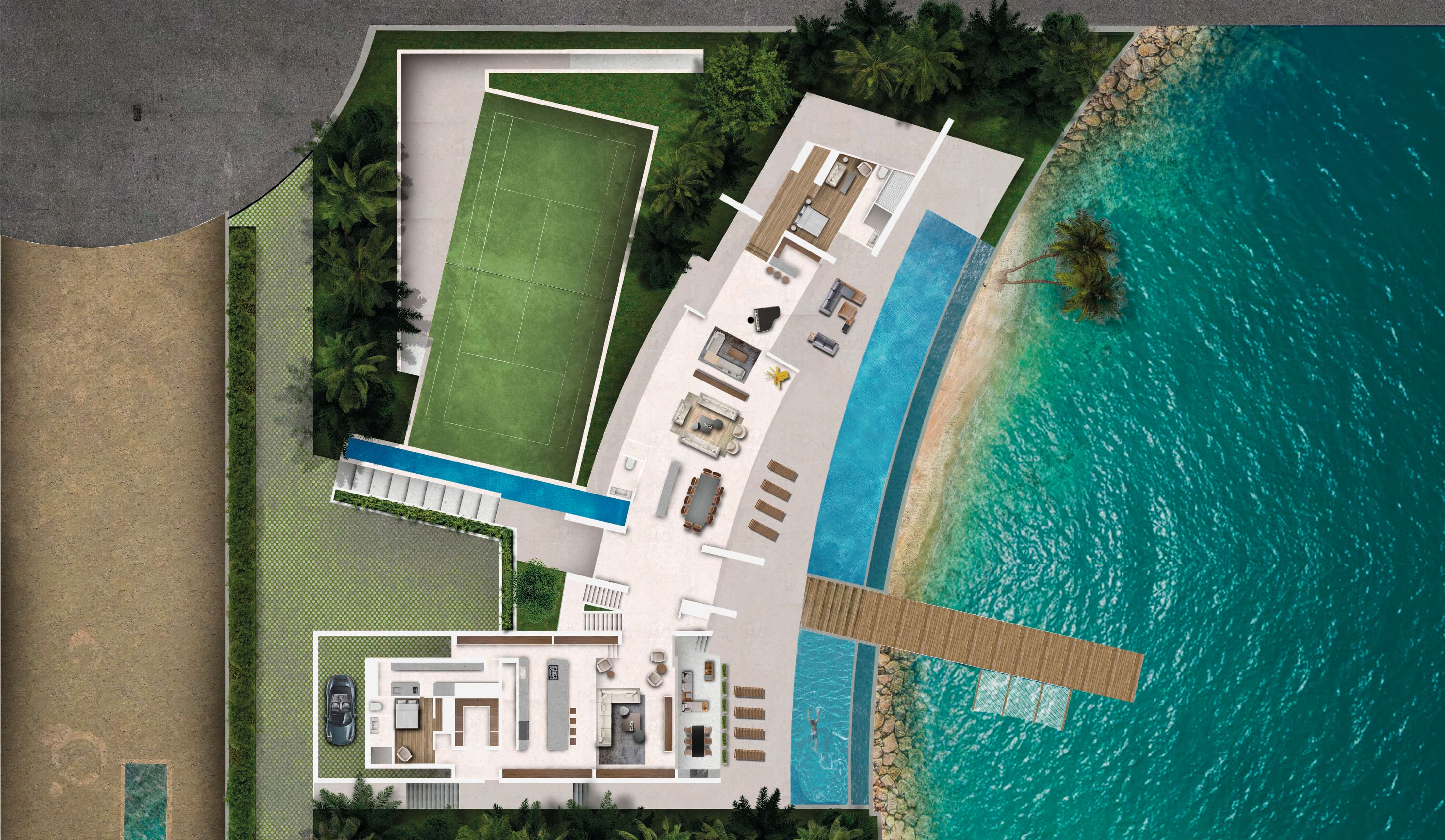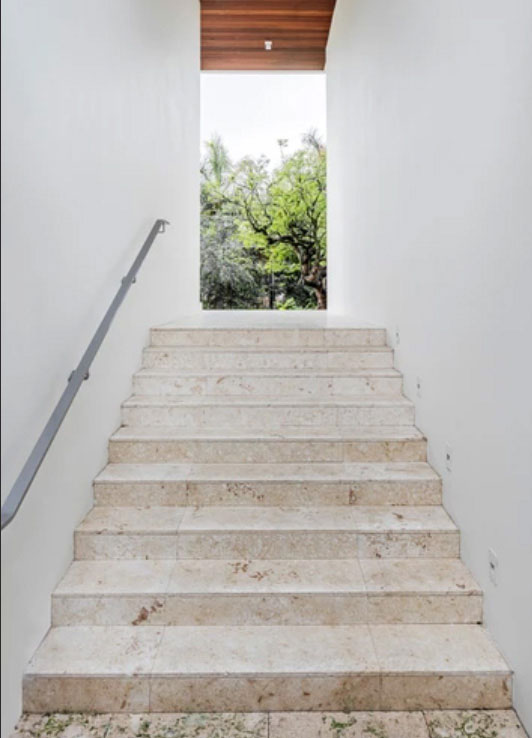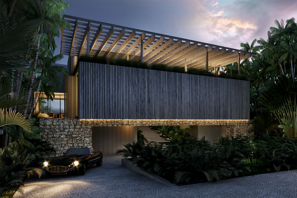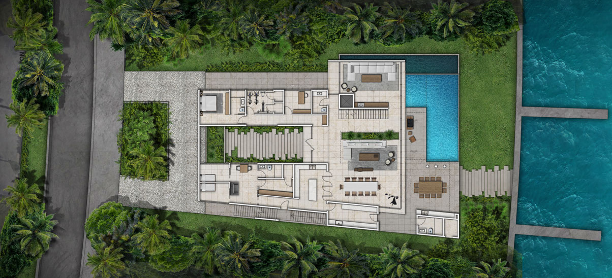 The integration of nature and architecture is the key factor of the concept, materialized by the use of a central main axis amongst which spaces are organized. This one consists of a monumental but intimate interior-exterior staircase at the entrance, which leads you, with a surprise factor, to the core tropical patio of the house with the ocean view. 11,300
