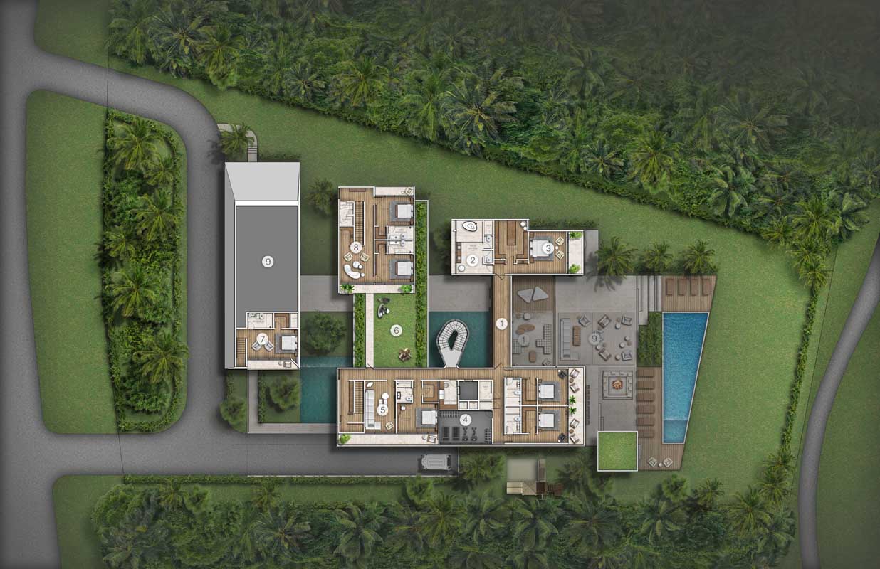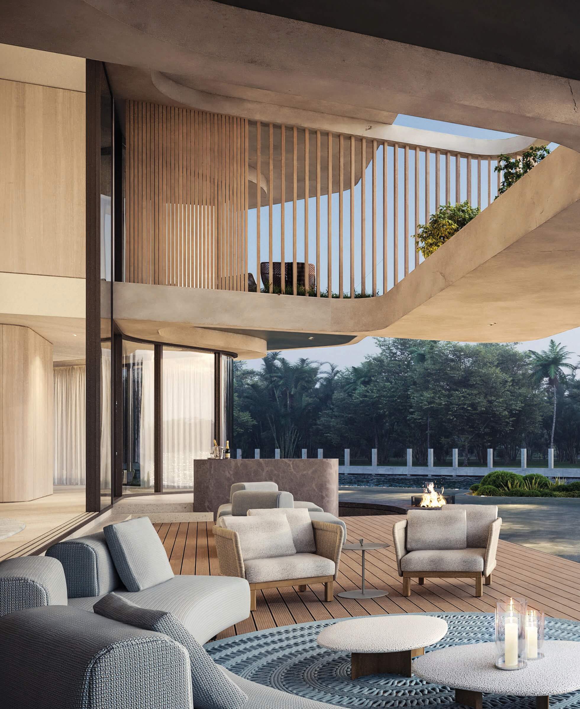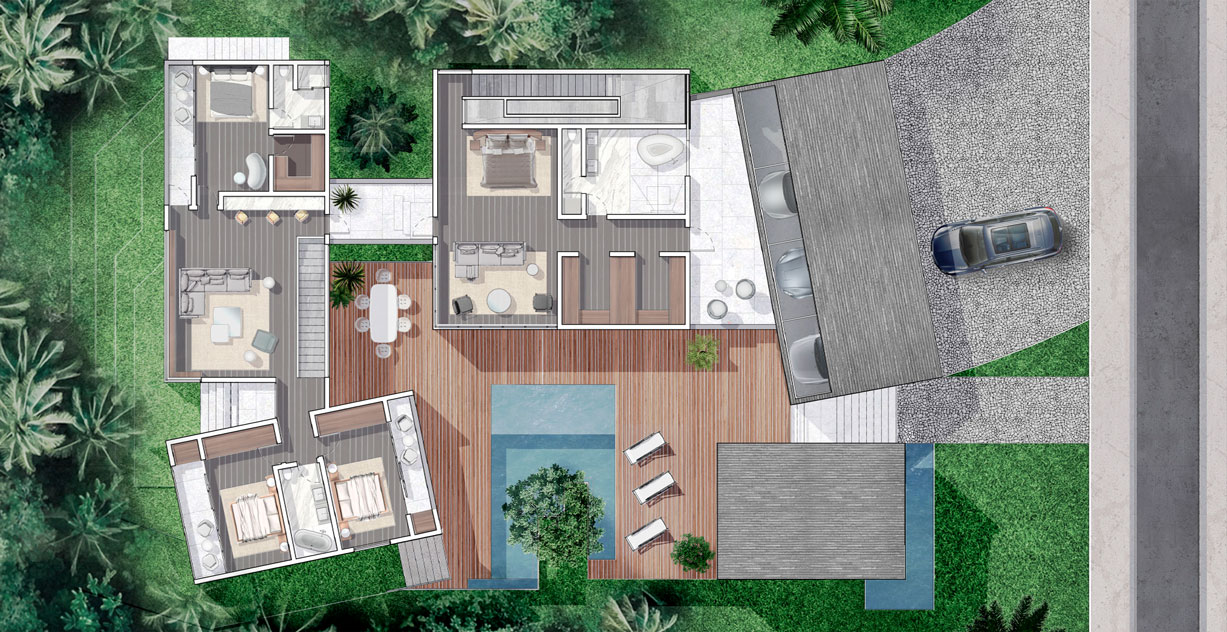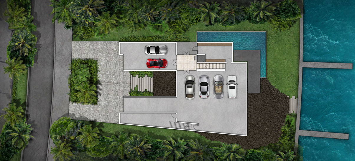 The integration of nature and architecture is the key factor of the concept, materialized by the use of a central main axis amongst which spaces are organized. This one consists of a monumental but intimate interior-exterior staircase at the entrance, which leads you, with a surprise factor, to the core tropical patio of the house with the ocean view. 11,300