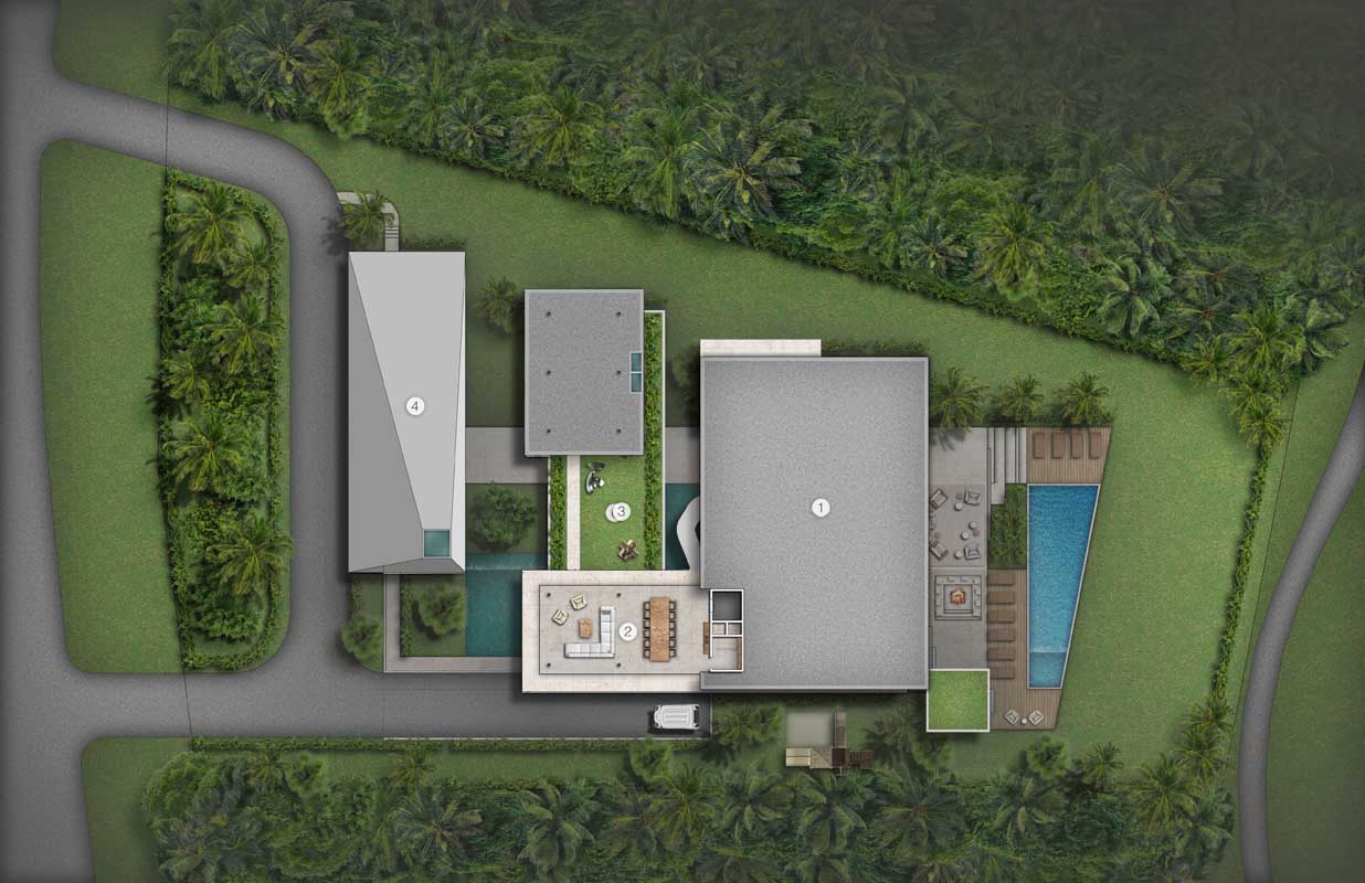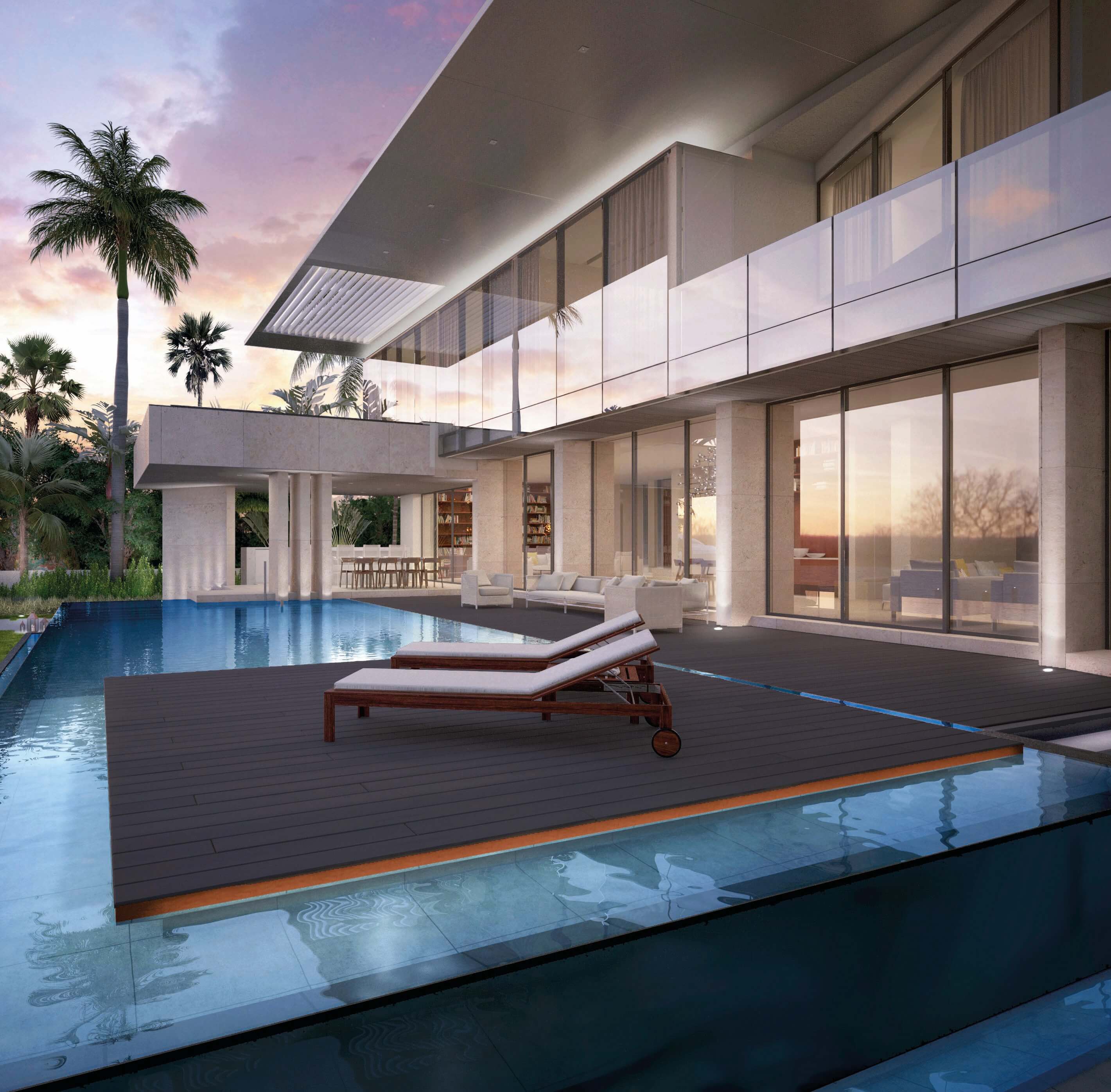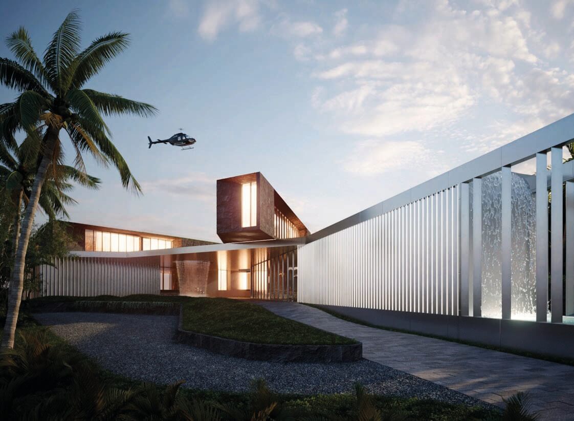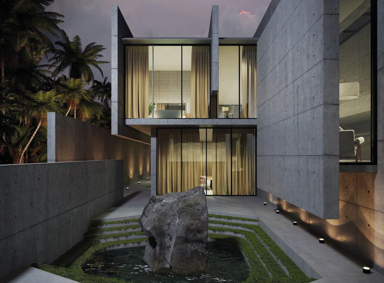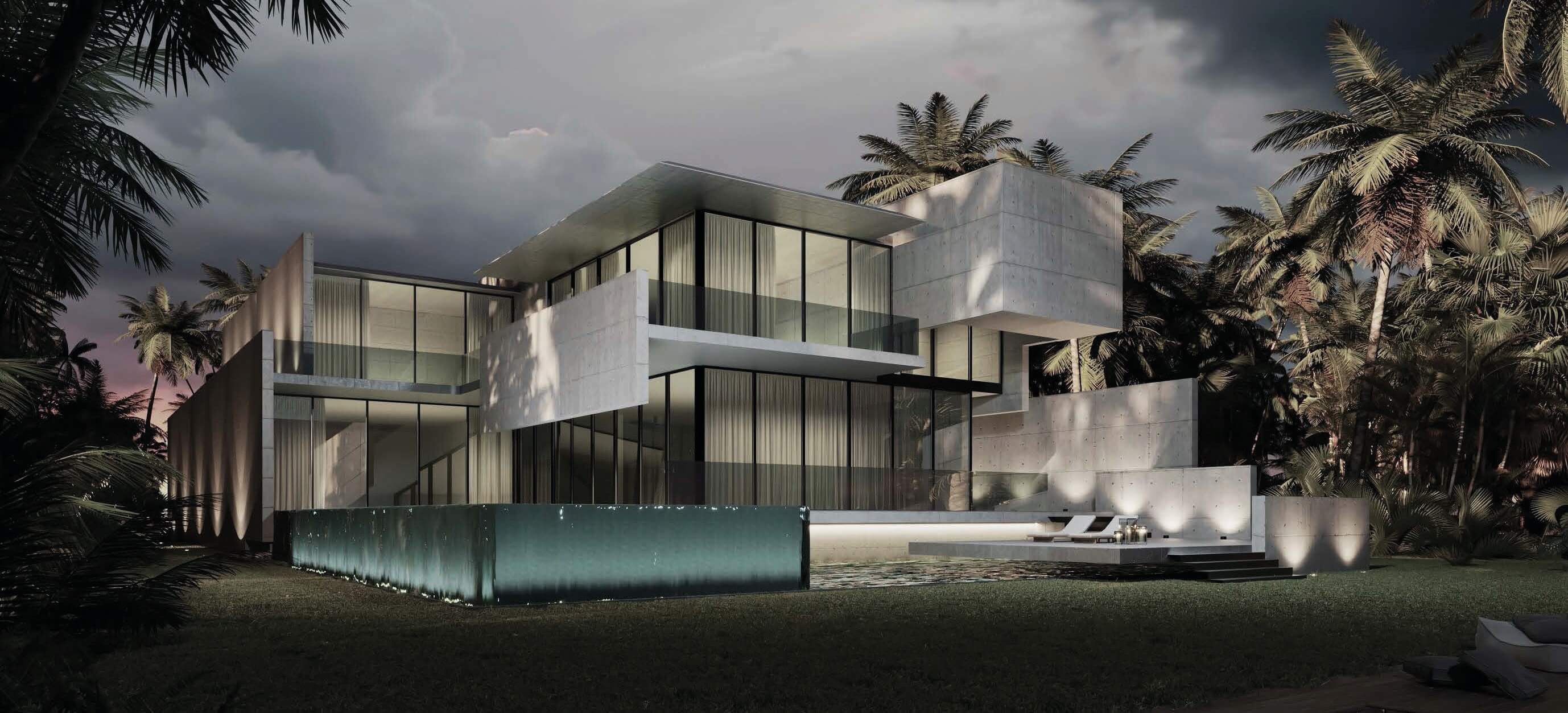 The design concept was to create a set of parallel and perpendicular planes intersecting each other at different heights to create both interior and exterior spaces in all four axis. As a result, with the extension of some of these planes, a sense of lightness is created in the entirety of the project. The most present architectural material is cast in place concrete yet the design concept used extensive cantilevers and skylights to minimize the heaviness and bring a floating sense of gravity to the home. Full height windows along with walls that do not directly connect but are bridged by glass to the other around different courtyards and various moments around the residence, as well as opening up key views to the surroundings. One courtyard has an imported Asian solid Jade boulder surrounded by a fluctuating rainwater catchment pool that acts as a bellwether for the South Florida seasons of winter drought and summer monsoons. 15,000 SF