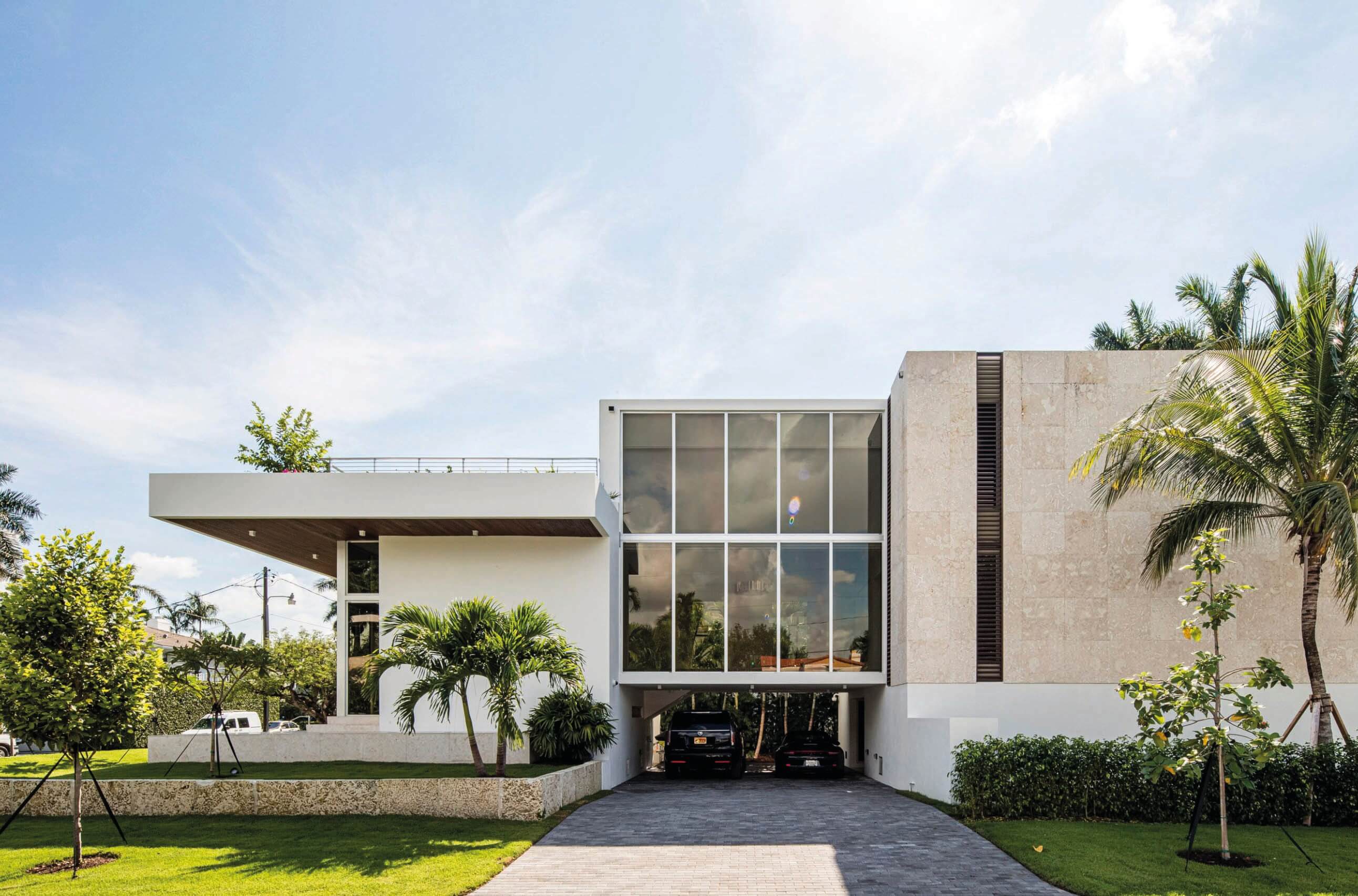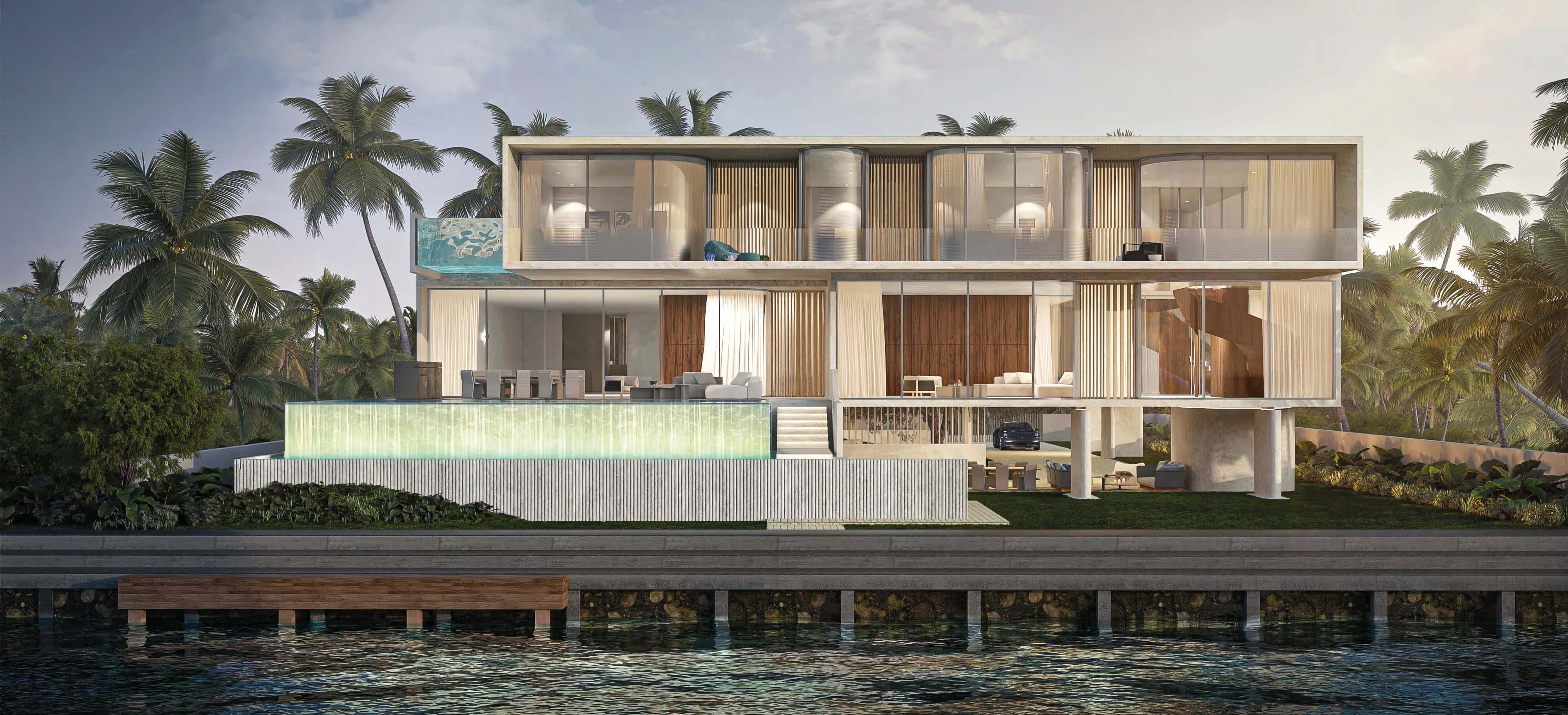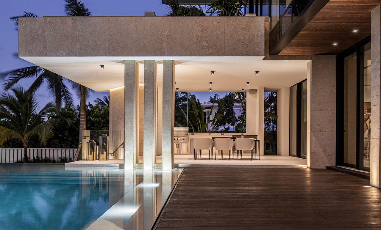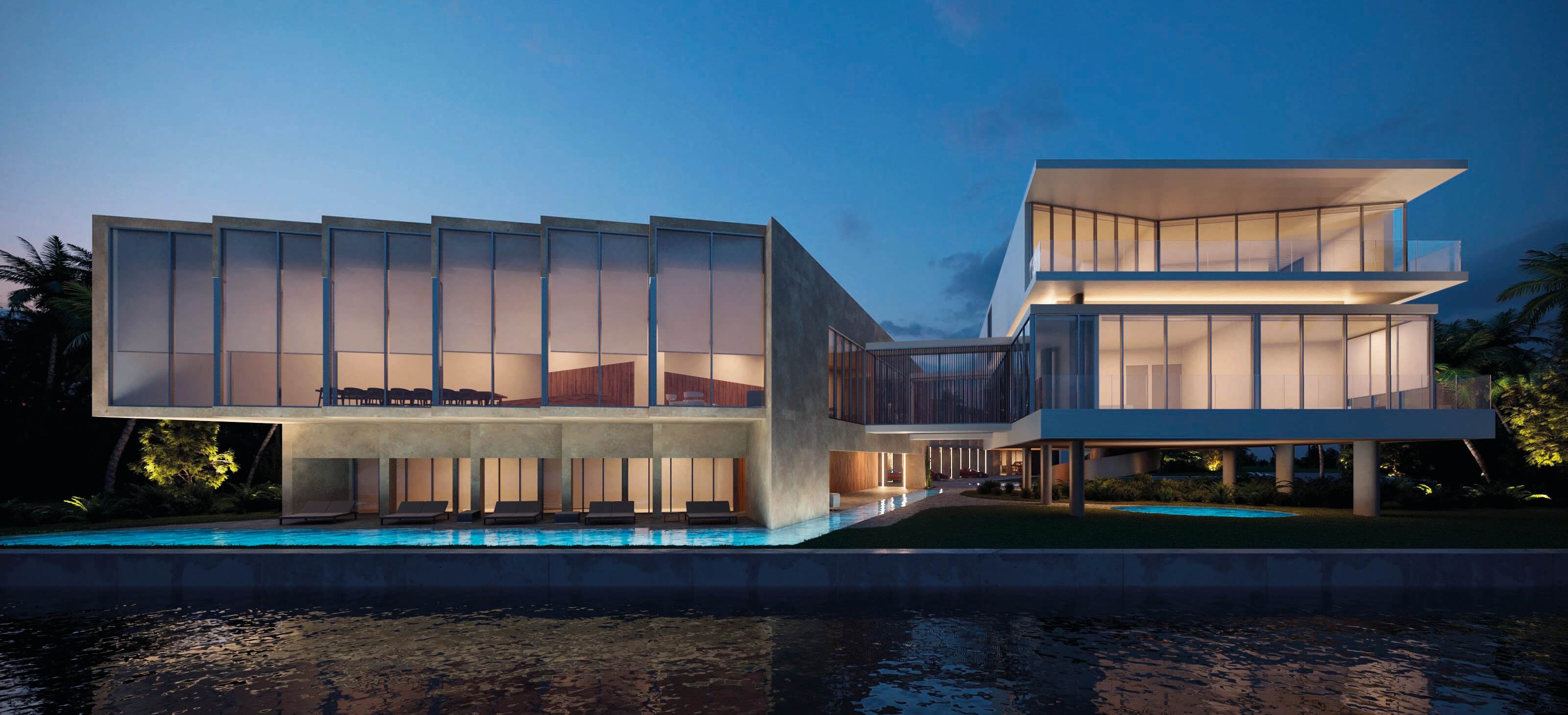 Private residence completed september 2019. Located in Miami’s Venetian Causeway, 941 North Venetian Drive. This is a three-story residential building, including the roof terrace. The building is subdivided into three parts: the solid front facade, a courtyard with a shallow water feature and the transparent volume facing the bay. The first floor is entirely dedicated to daily functions, it includes a home cinema, three car garage and service area. The second floor has five bedrooms, a social area, three balconies and a large master terrace with an infinity plunge pool. An internal elevator connects to the roof terrace characterized by a stunning view of downtown Miami and overlooking Biscayne Bay. 8,830 SF