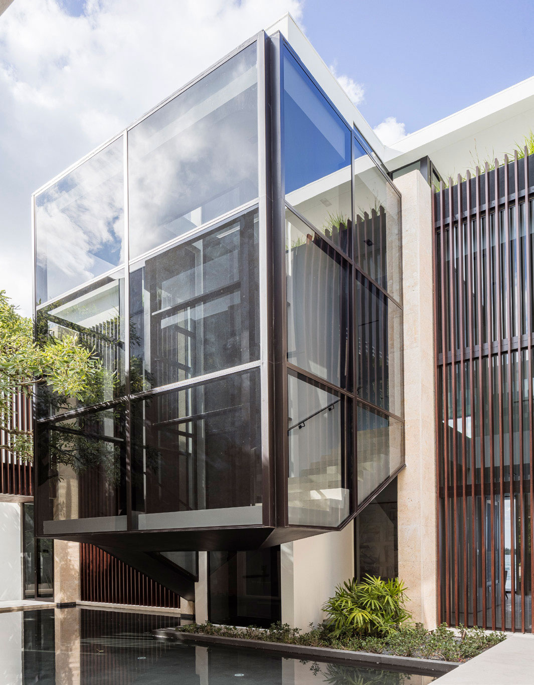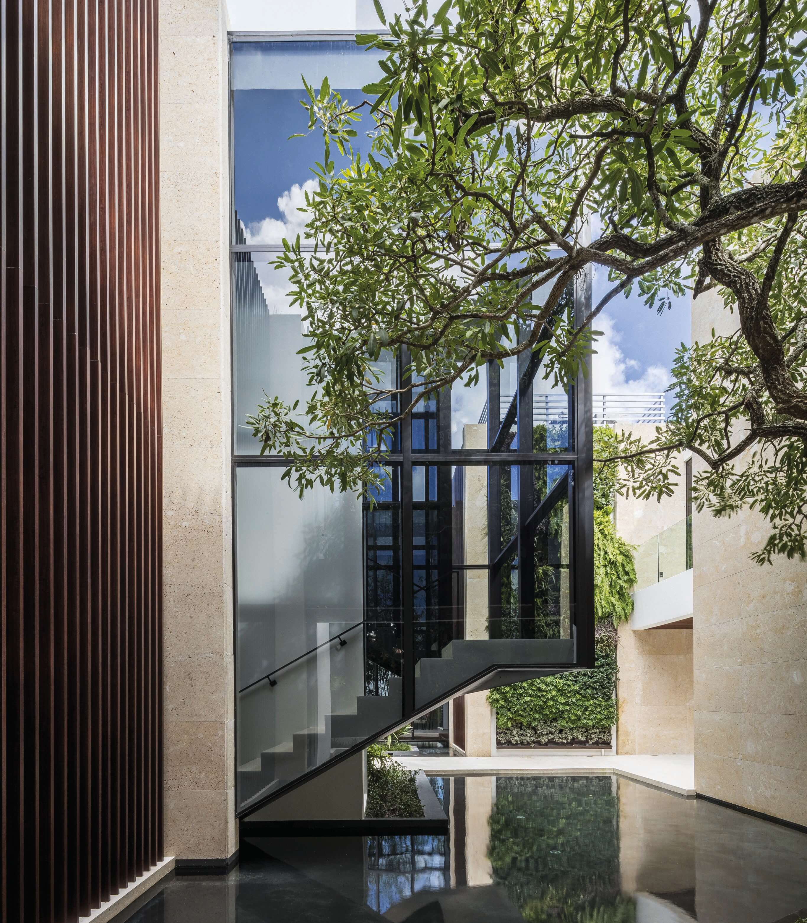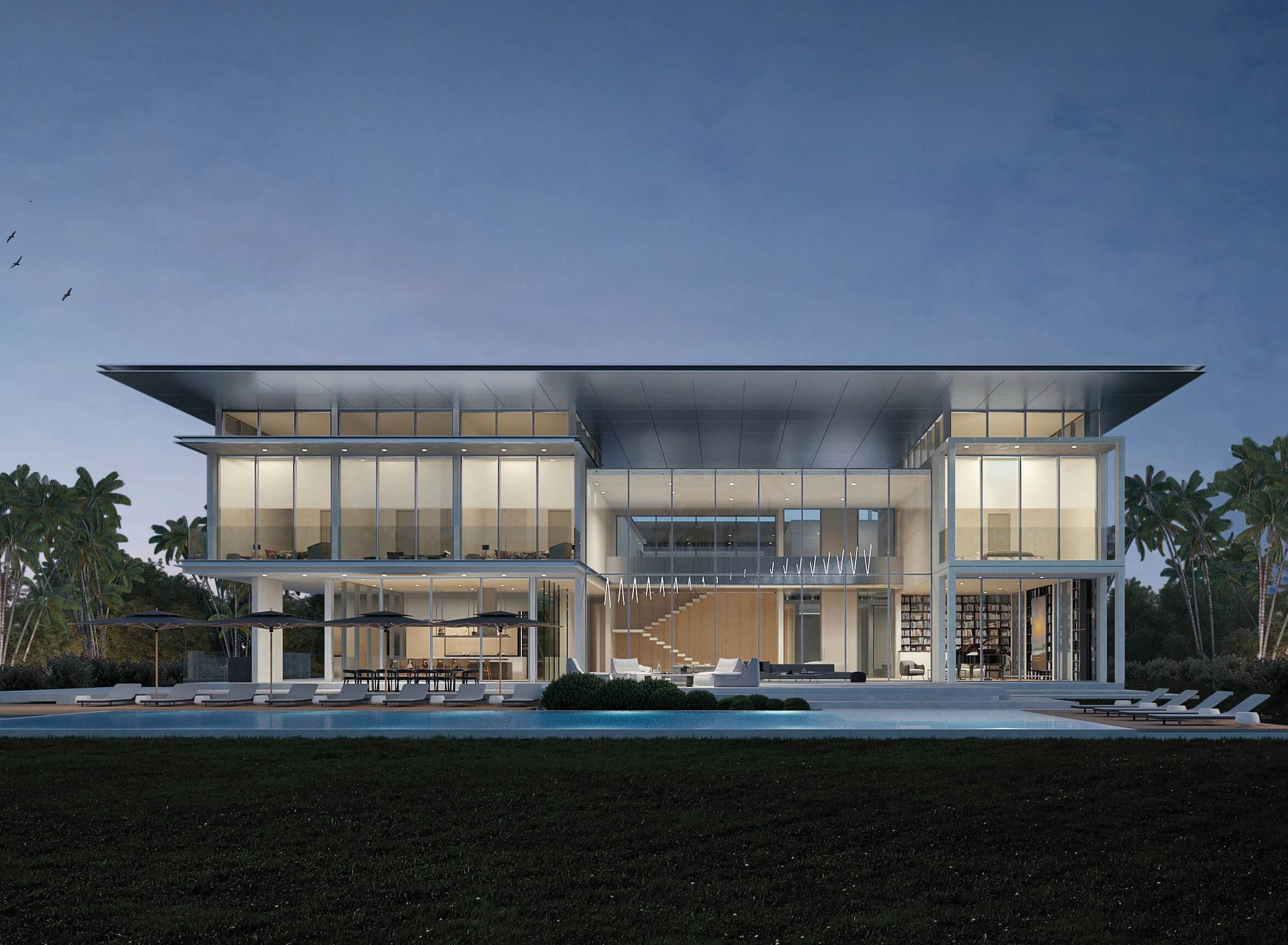 Private residence completed september 2019. Located in Miami’s Venetian Causeway, 941 North Venetian Drive. This is a three-story residential building, including the roof terrace. The building is subdivided into three parts: the solid front facade, a courtyard with a shallow water feature and the transparent volume facing the bay. The first floor is entirely dedicated to daily functions, it includes a home cinema, three car garage and service area. The second floor has five bedrooms, a social area, three balconies and a large master terrace with an infinity plunge pool. An internal elevator connects to the roof terrace characterized by a stunning view of downtown Miami and overlooking Biscayne Bay. 8,830 SF
