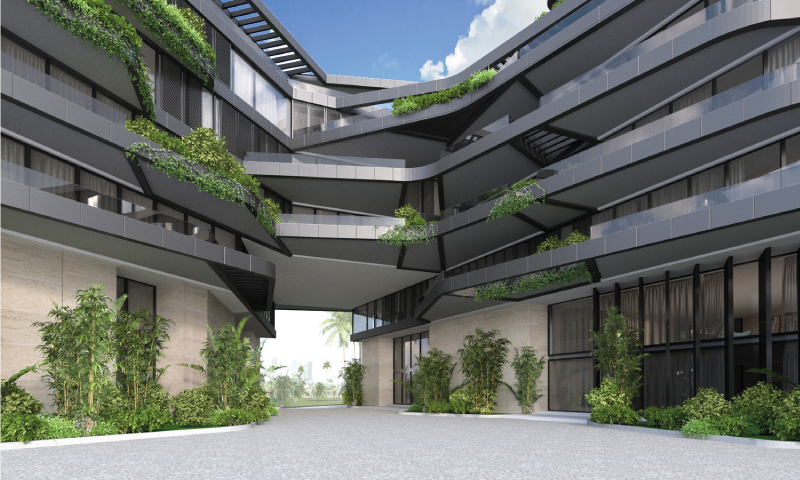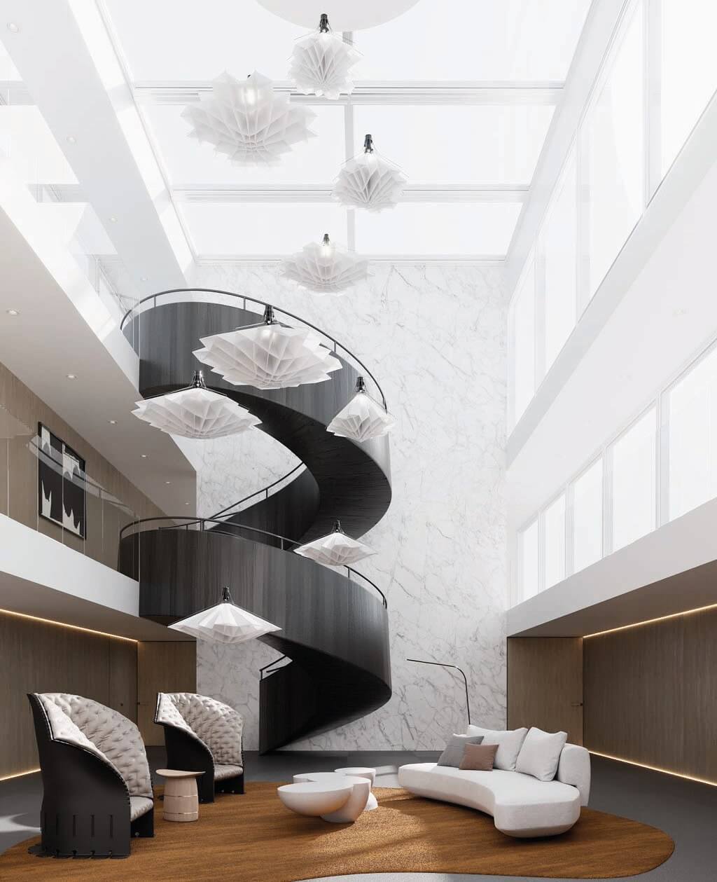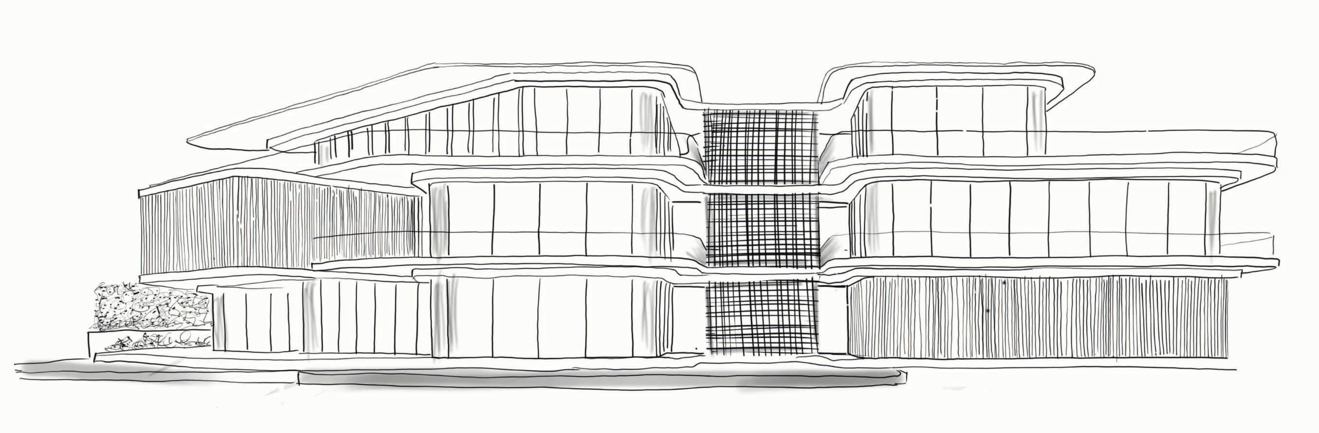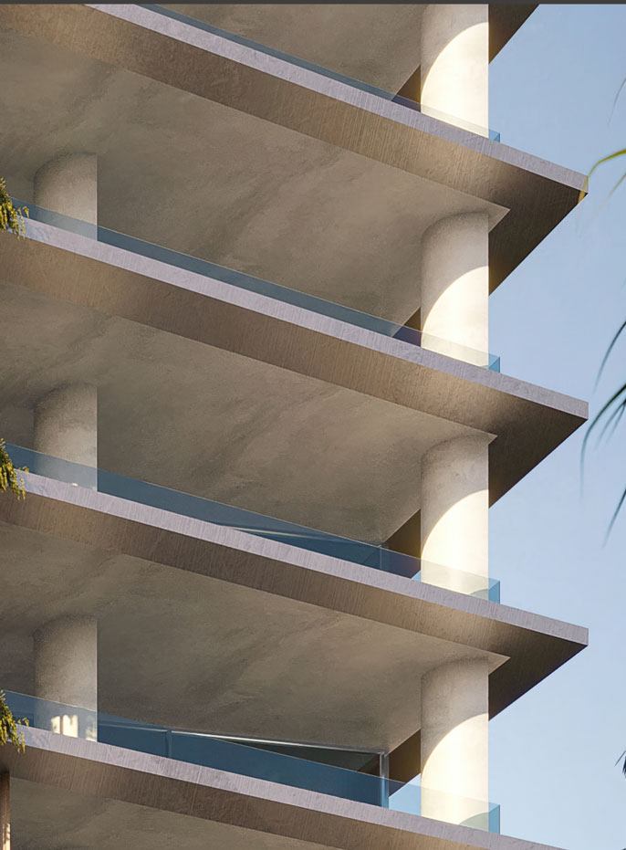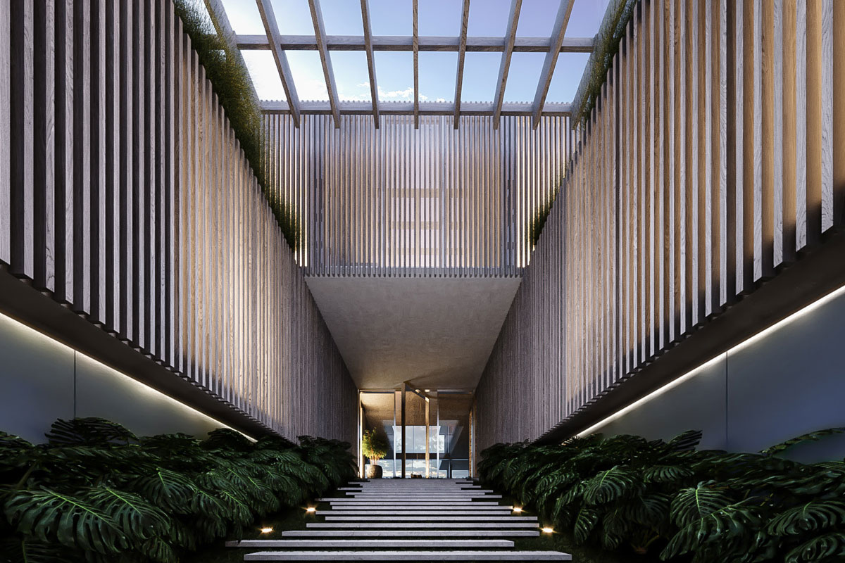 The central vertical design element is reminiscent of the curves and apertures of a Melo Melo shell becomes the key element of the composition, and the use of the wood textured louvers enables the repeating curves to be extruded and better appreciated by reinforcing the lines in the vertical plane rather than being limited to the floor plates.