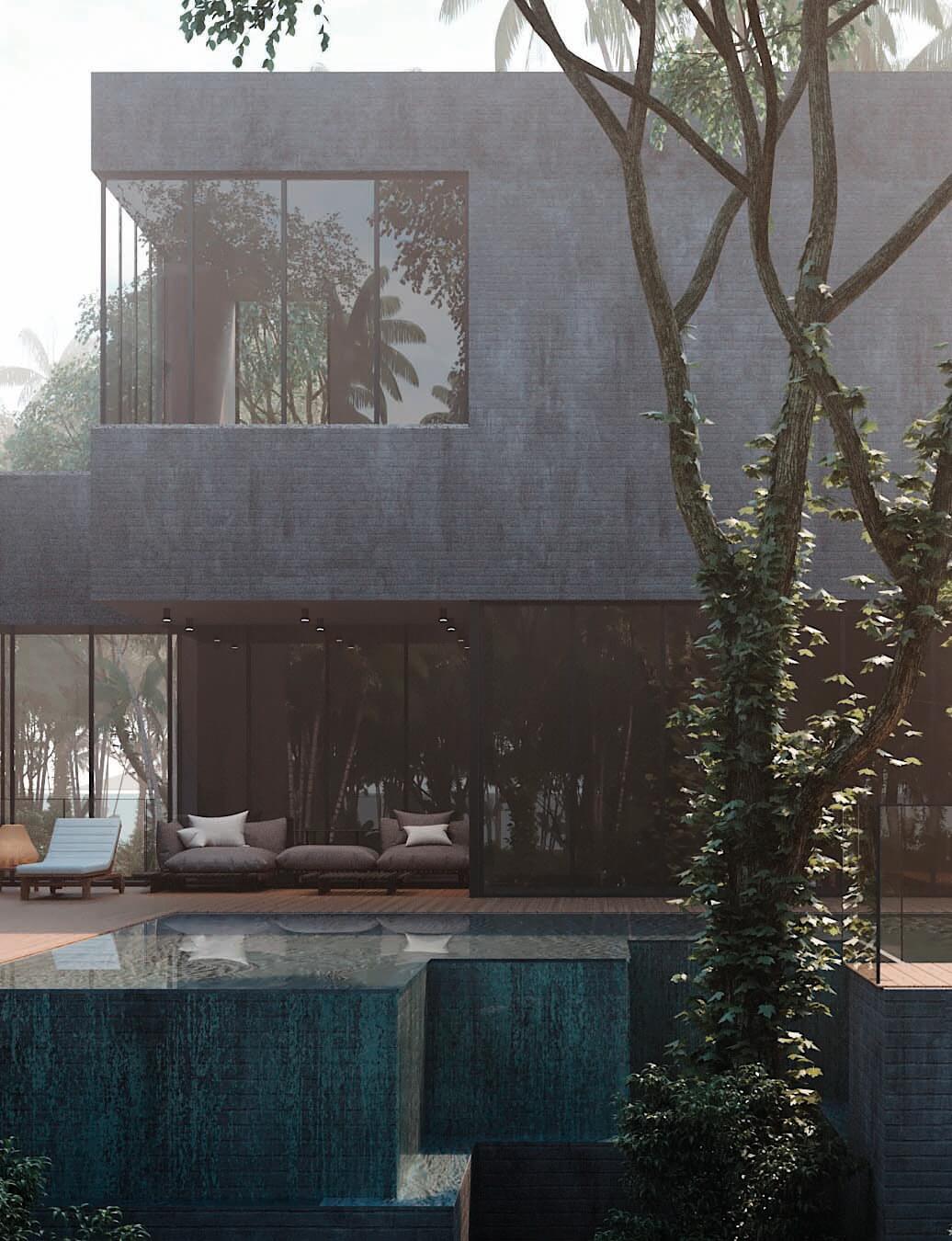 These volumes materialize in earthy tones and textures, evoking the comfort of the private life. The whole project is based on three materials: gray concrete, wood and glass. The water and the terraced landscape plan another important role in the scene helping create the ambience for the tropical and natural garden to which all is centered on.