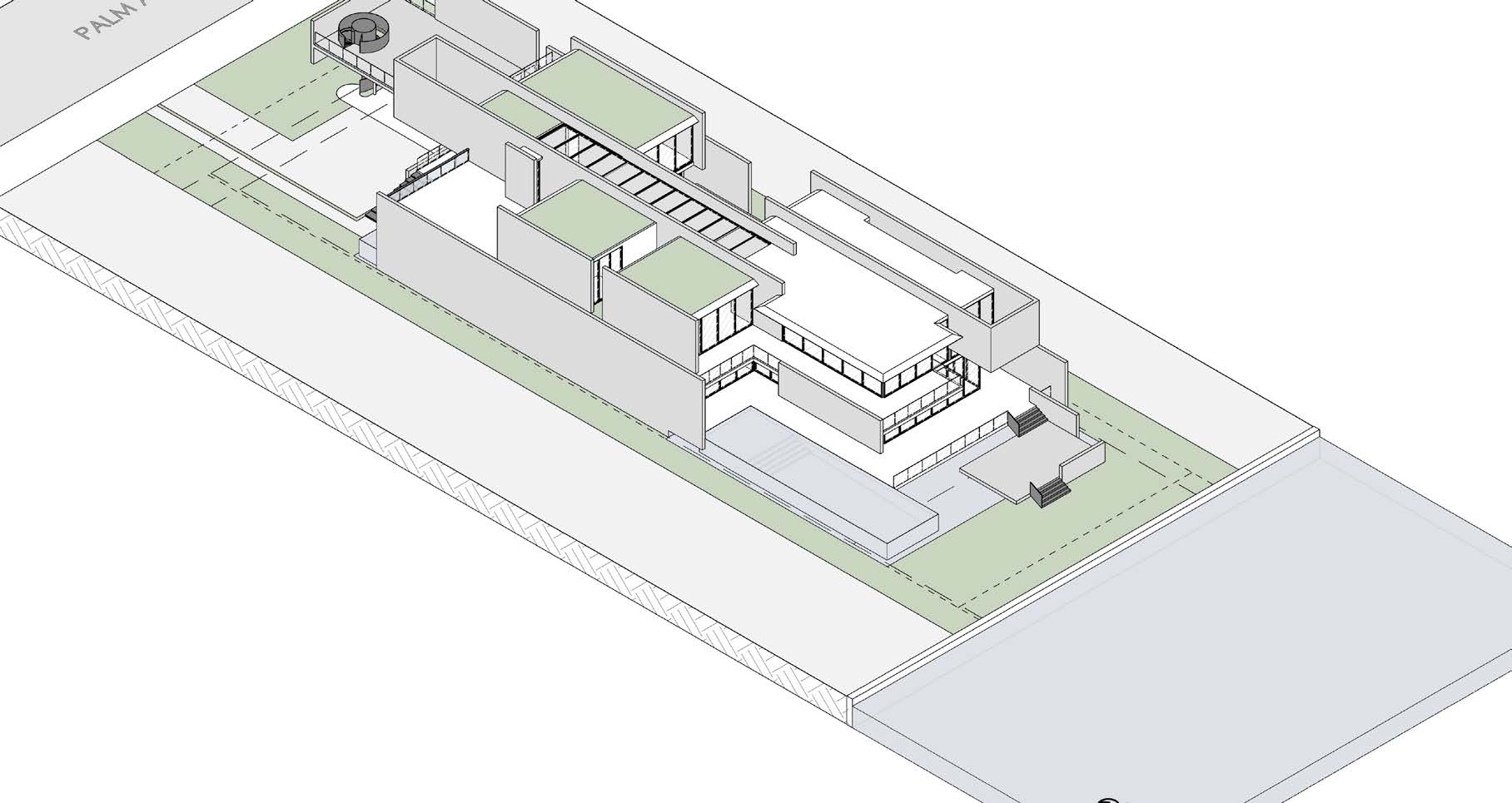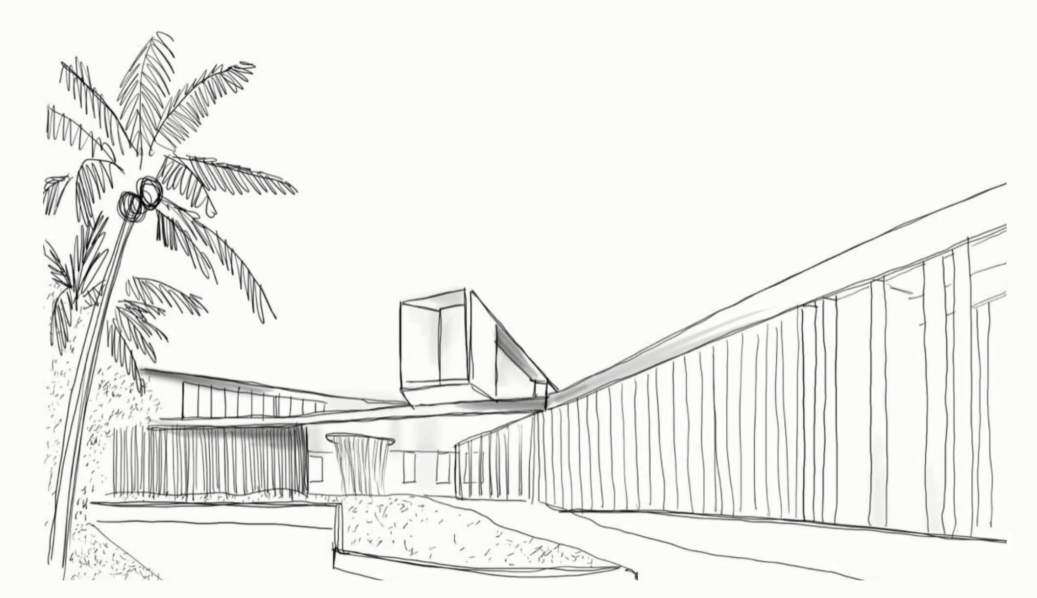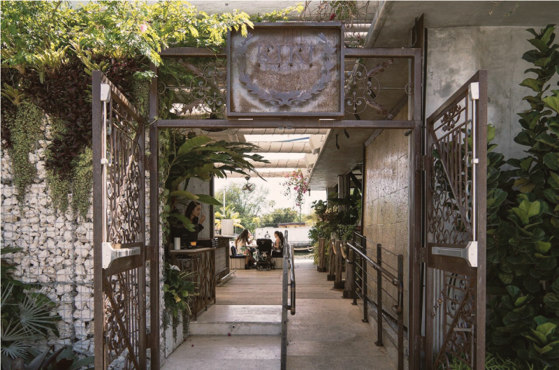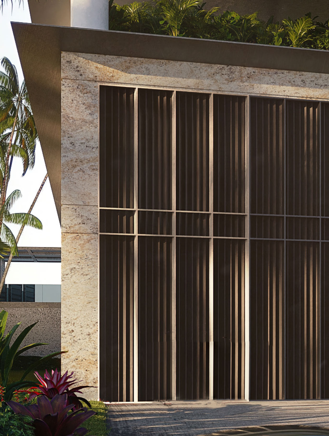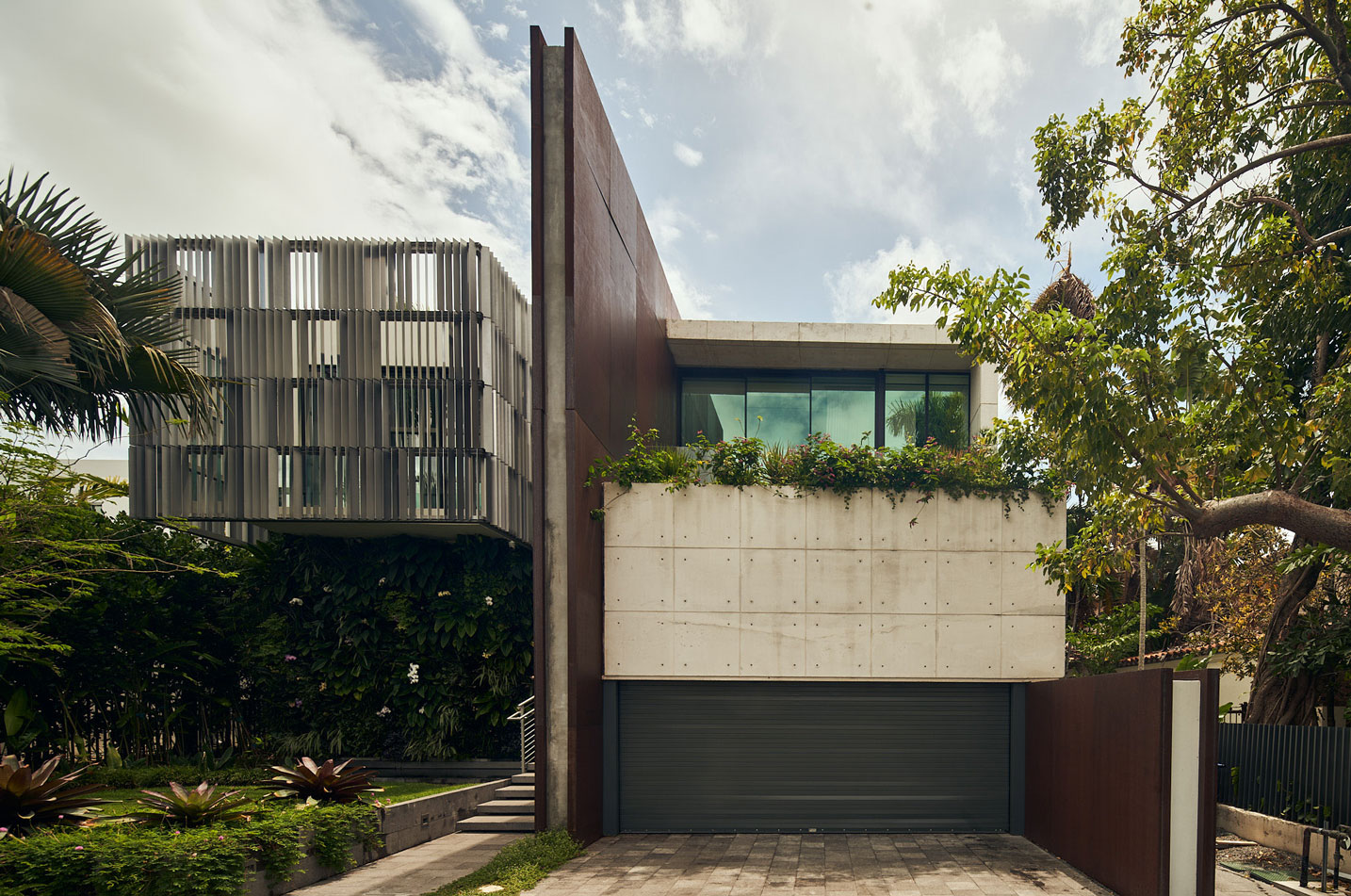 The use of planters with draping foliage softens and diffuses the hard edges of the metallic projections along with reinforcing the ideas of tropical modernism.