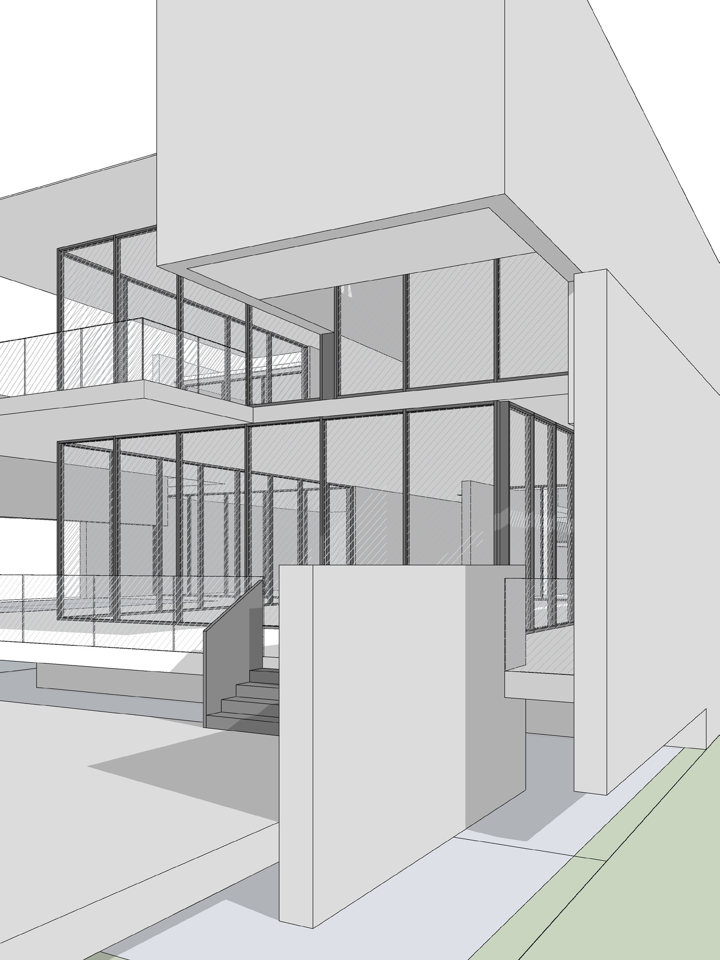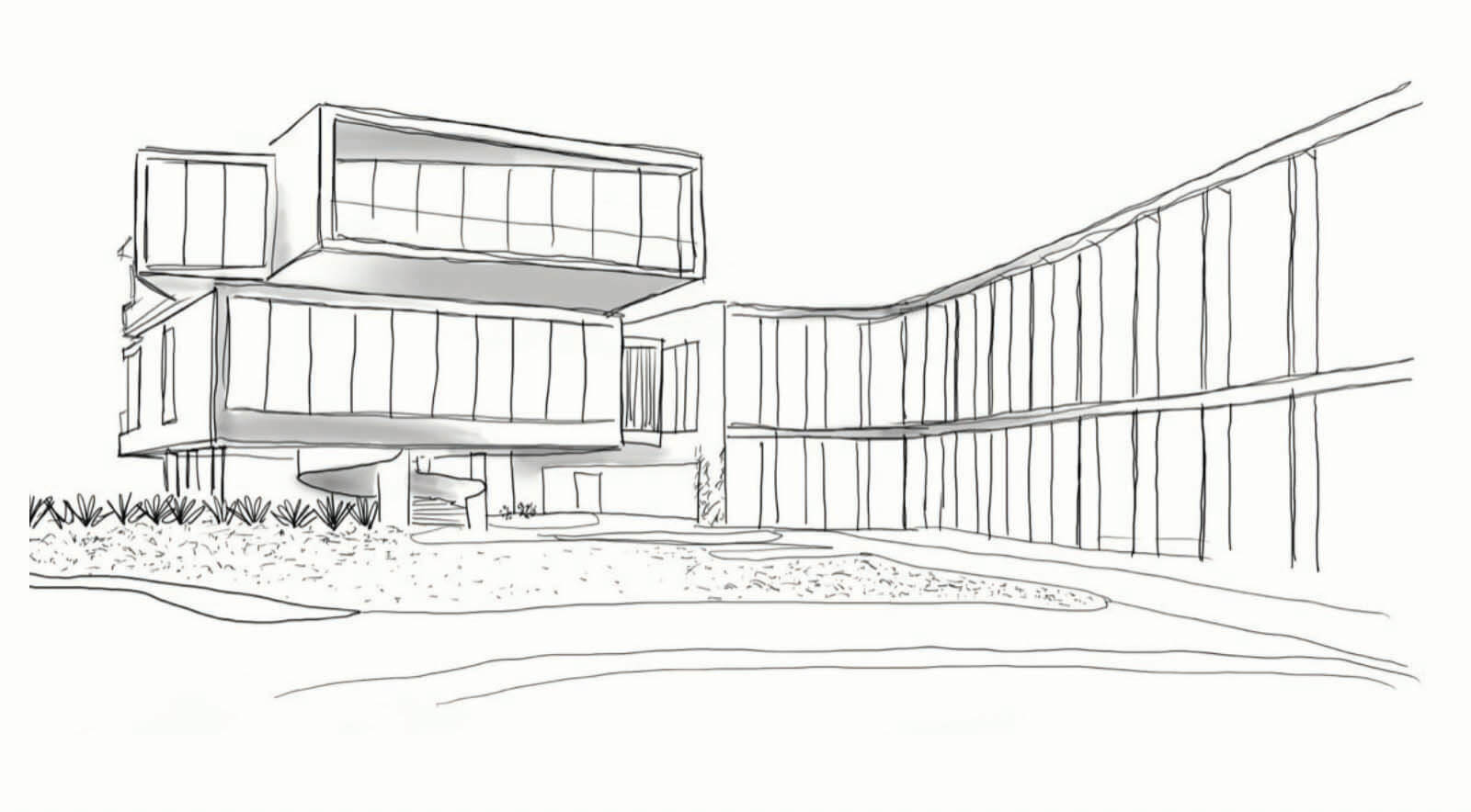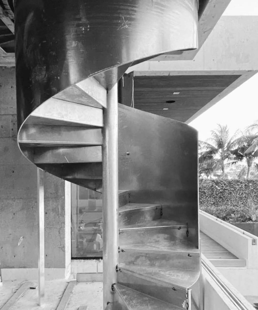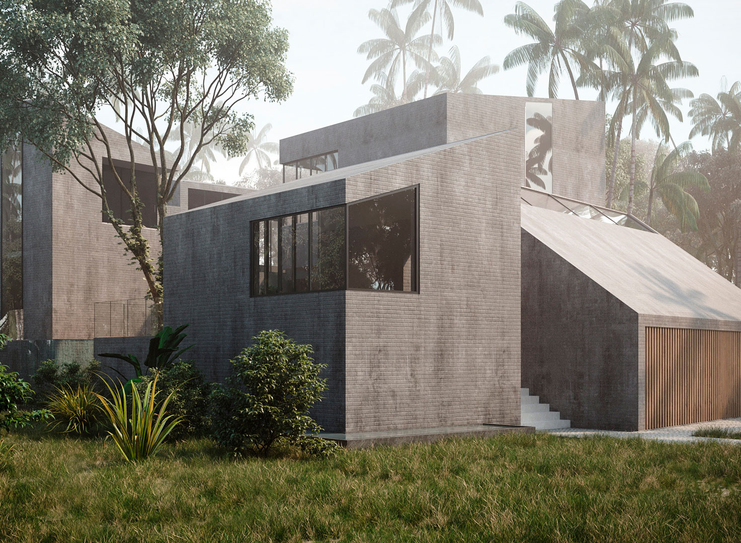 The use of planters with draping foliage softens and diffuses the hard edges of the metallic projections along with reinforcing the ideas of tropical modernism.