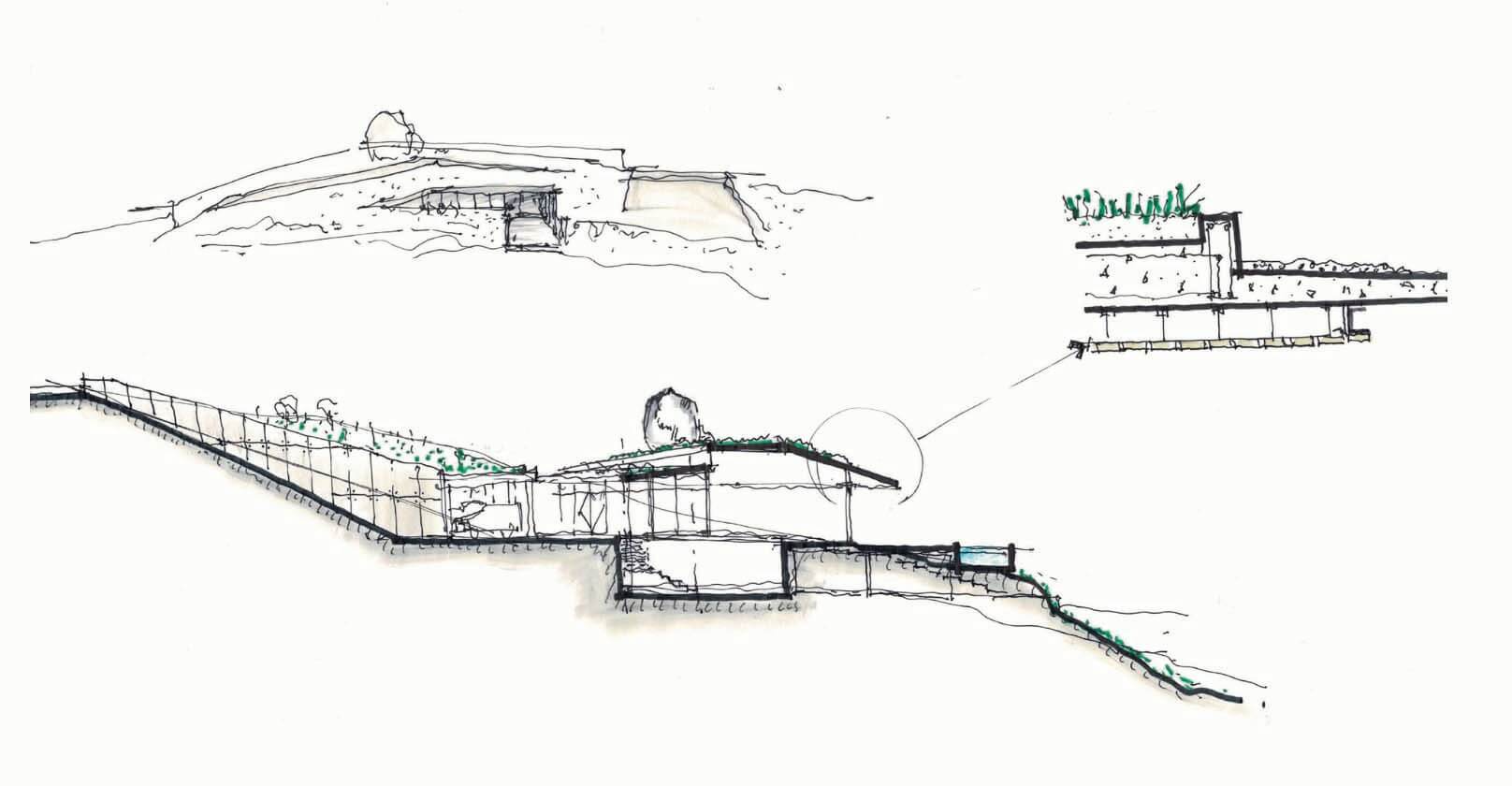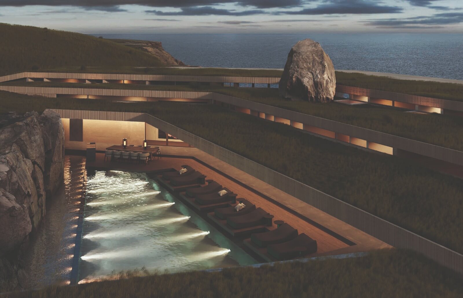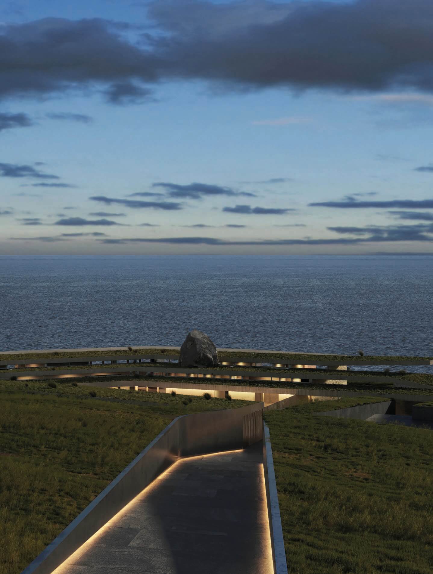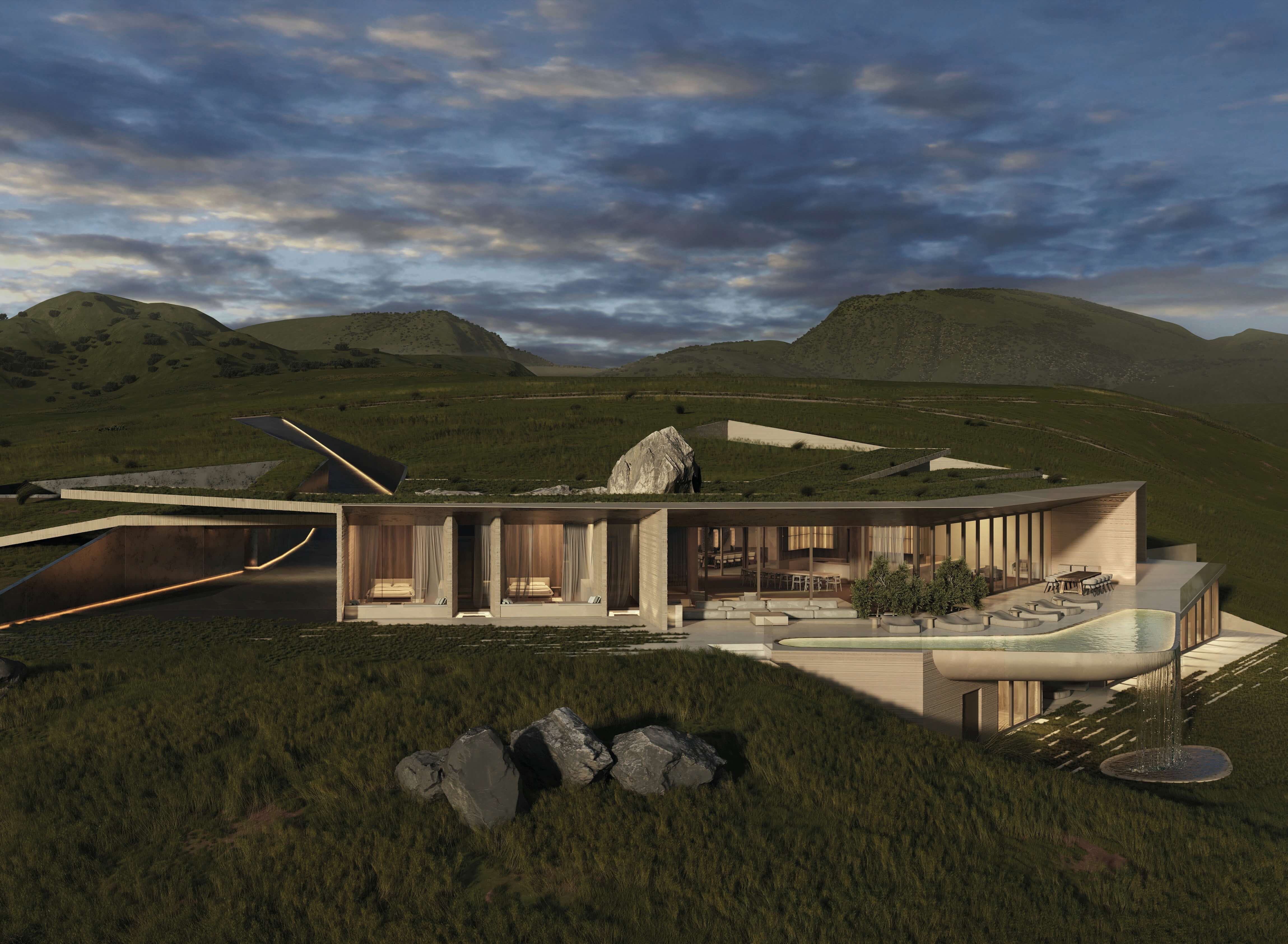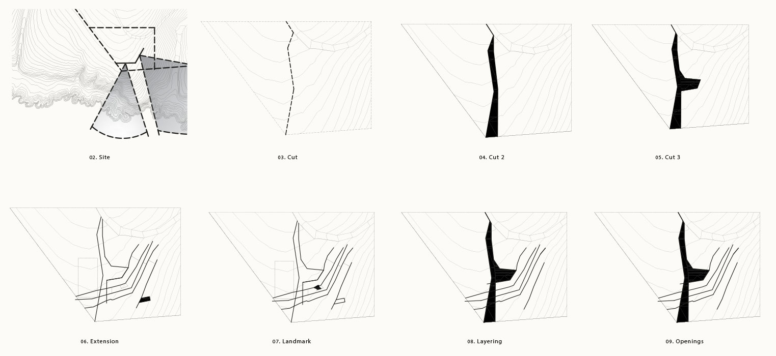 The project site, located by a cliff at the south-west of the Australia coast, is a breathtaking enclave with an extraordinary landscape. In this sense, the site was calling for a very respectful and topographic project in which we intervened with different operations more assignable to nature than to architecture, such as layering in the same way earth builds up through the years, or cracks that so regularly happen in any landscape, or extensions of land protruding out and carefully thought of as well as integrated landmarks, like any landscape may have. Through these operations, we were able to develop a project that is revealed from the land as you approach it with slight hints of architectural elements happening which evolves, as you move deeper into it, in a rear facade towards the bay completely architectural. 39,000 SF