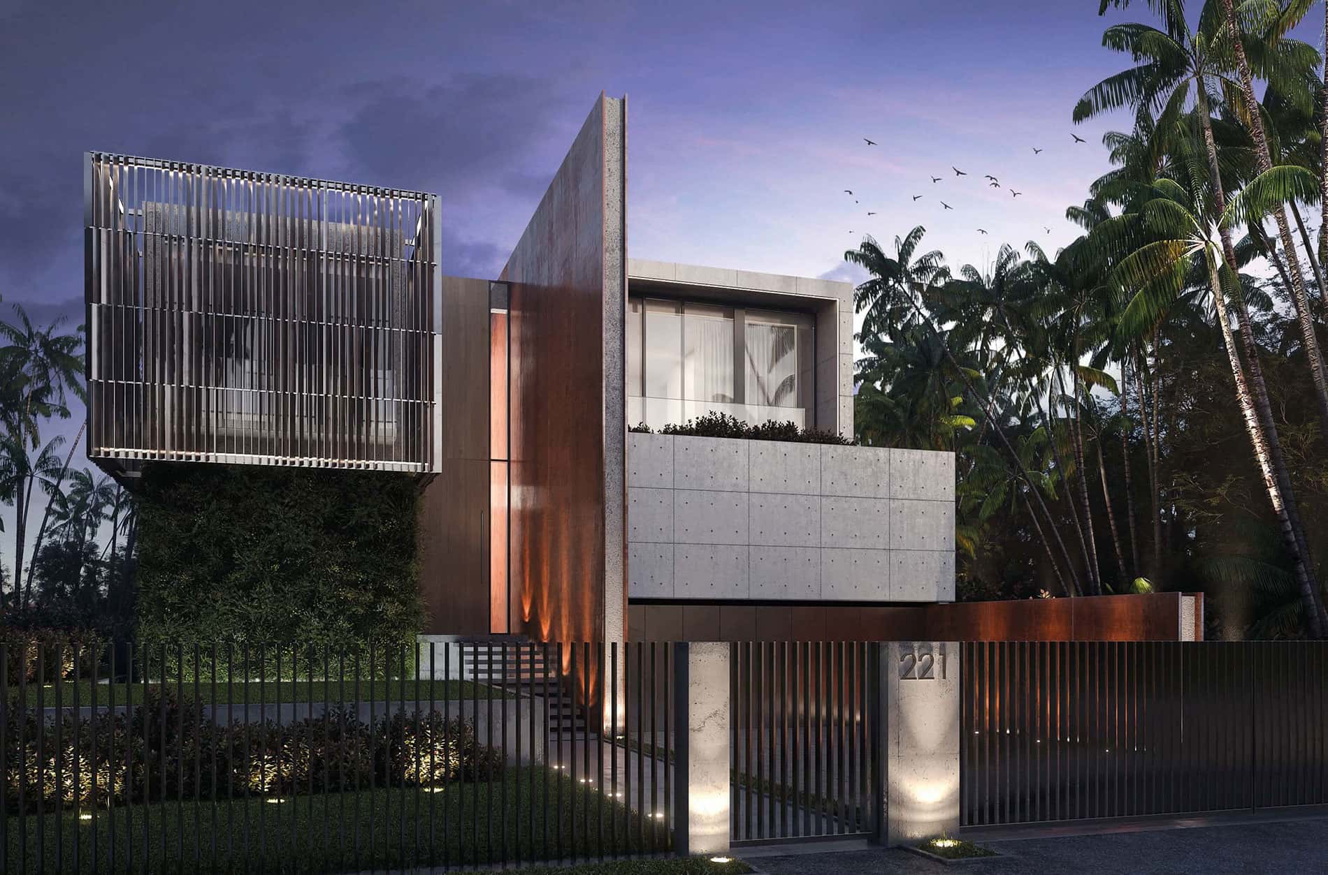 Private residence, located in Miami Beach, 221 East Dilido Dr. This is a two-story building, plus a roof terrace, with a view to the biscayne bay. The main element of the project is the corten steel wall 30’ high, that cuts the house through the center, like a spine, and around it the entire project takes place. The house contains 1 guest bedroom at the ground floor and 3 bedrooms at the second floor. The access to the roof top terrace is through a sculptural spiral stair off the rear terrace of the master bathroom. The whole project is based in three materials: corten steel, cast concrete and glass. The water is another import element, which accompanies the visitor from the entrance all the way to the bay. 5,900 SF