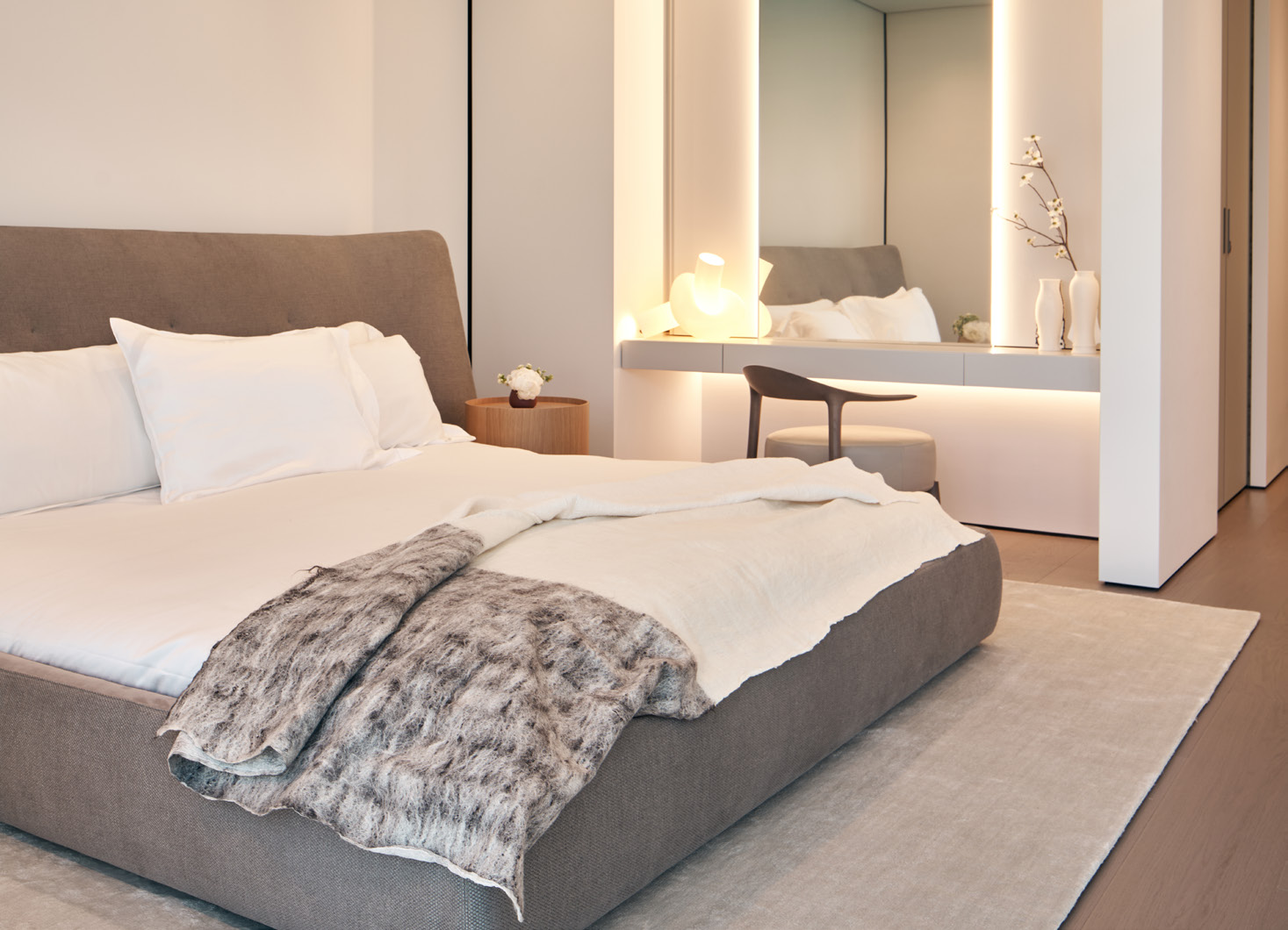 Thirlwall renovated this 2,800 sq. ft., 3 bedroom, 2.5 bathrrom apartment in the murano Grande in Miami Beach in luxurious fashion with Indian sandstone flooring with LED lit baseboards with Oscar Ono wood flooring, a built in banquette with Spinneybeck leather, seating by Knoll, Poltrona Frau and Carl Hanson, custom fur rug by Bowron and lighting by Brand van Egmond. Famed fine art photographer Marisa Baumgartner also created a site specific art piece for the unit that incorporated one twenty-five foot wall. The unit boasts views of both the ocean and downtown Miami.