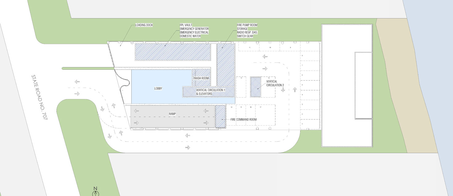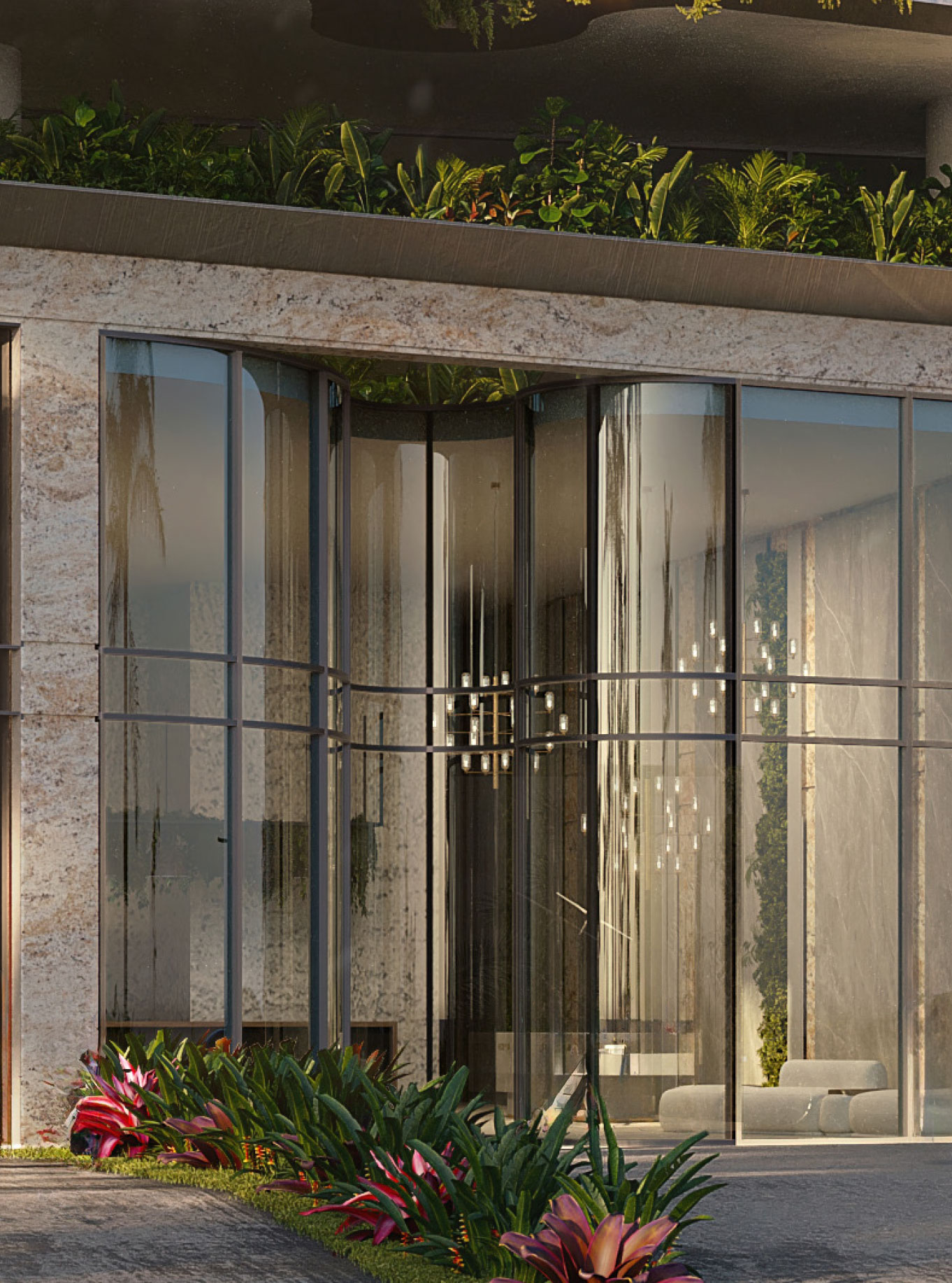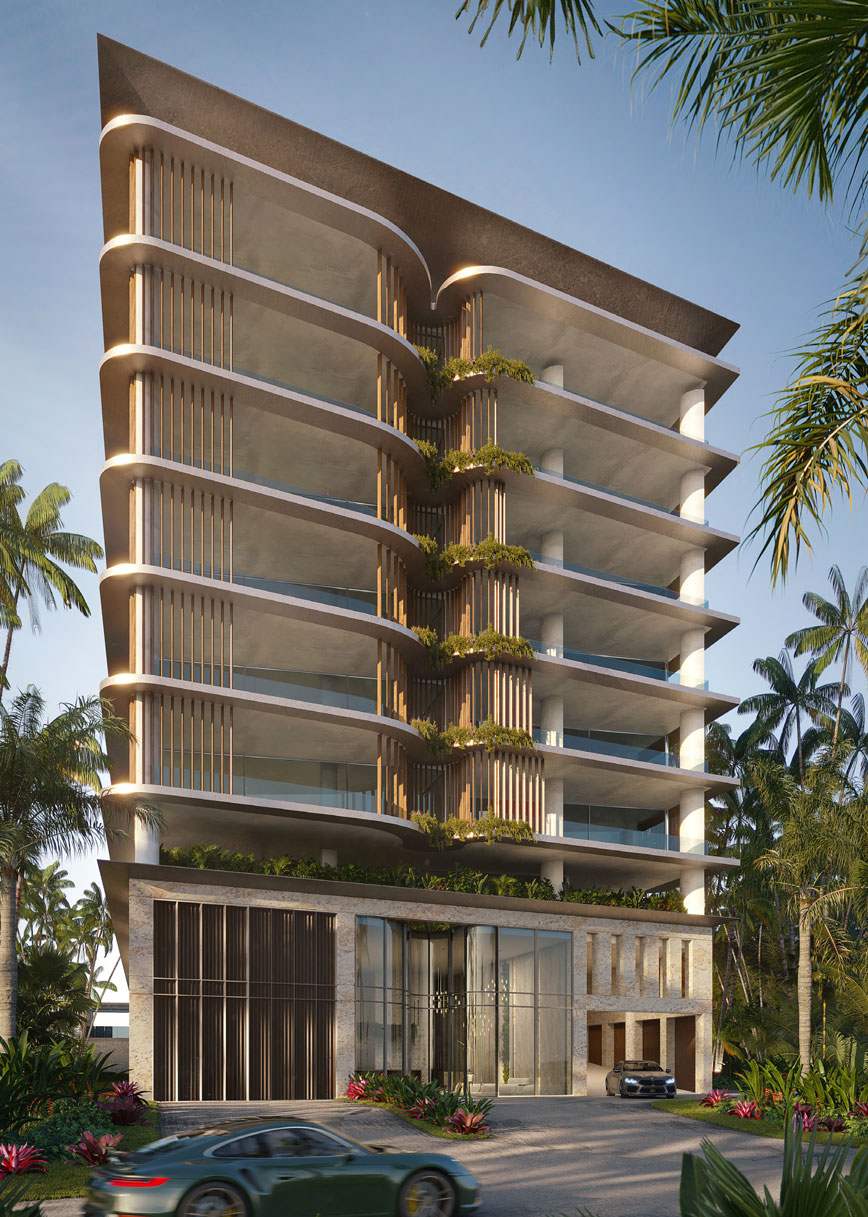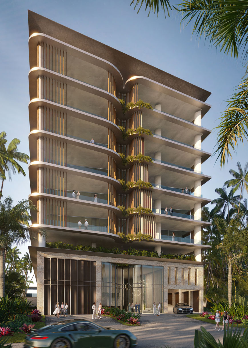 The entrance facade utilizes proprietary curved hurricane impact storefront glass to bring down and duplicate in a subtle way the upper tower central design element which also allows for a visually arresting main entrance door alcove that is visible as well from the amenity deck above.