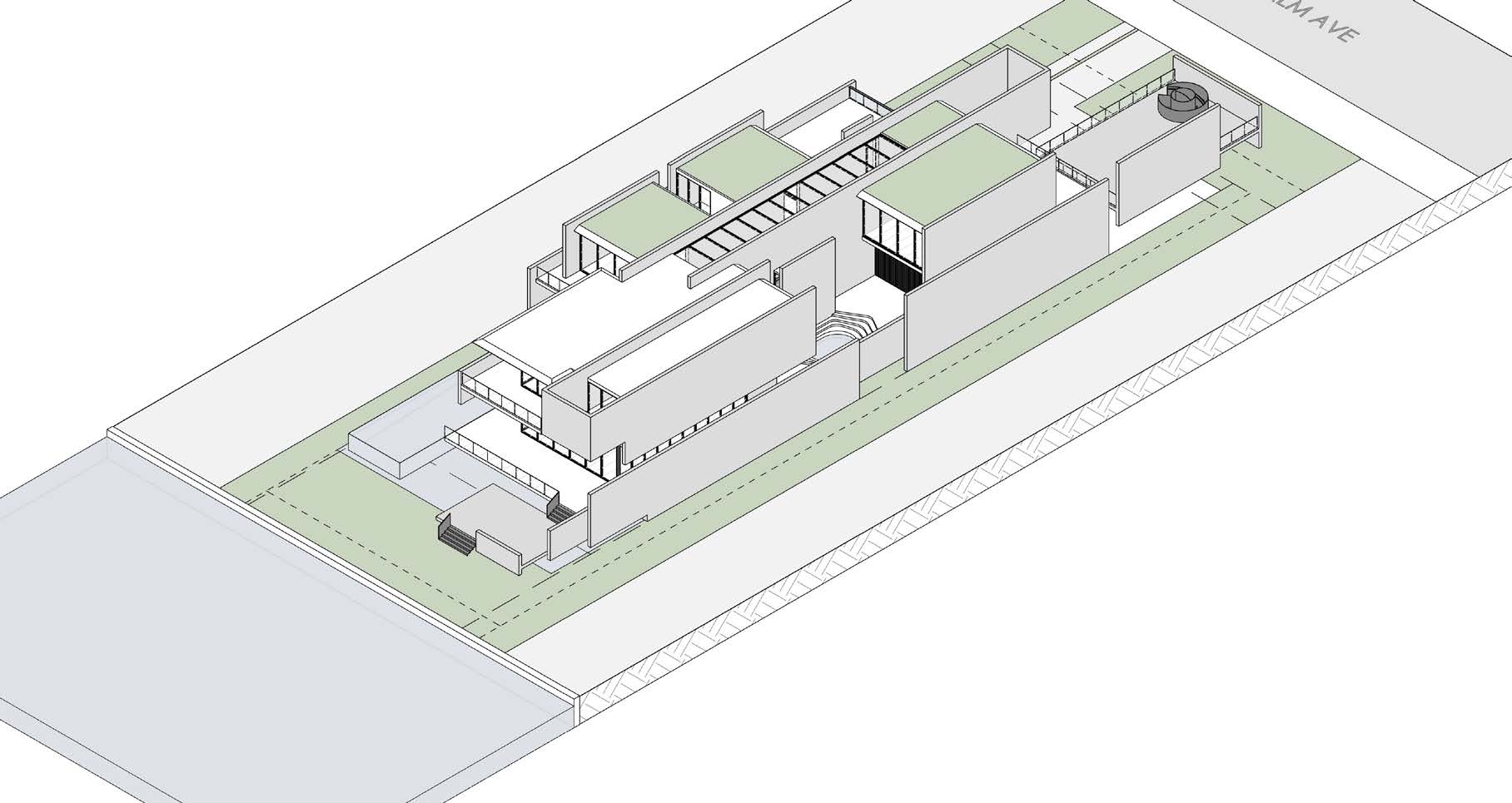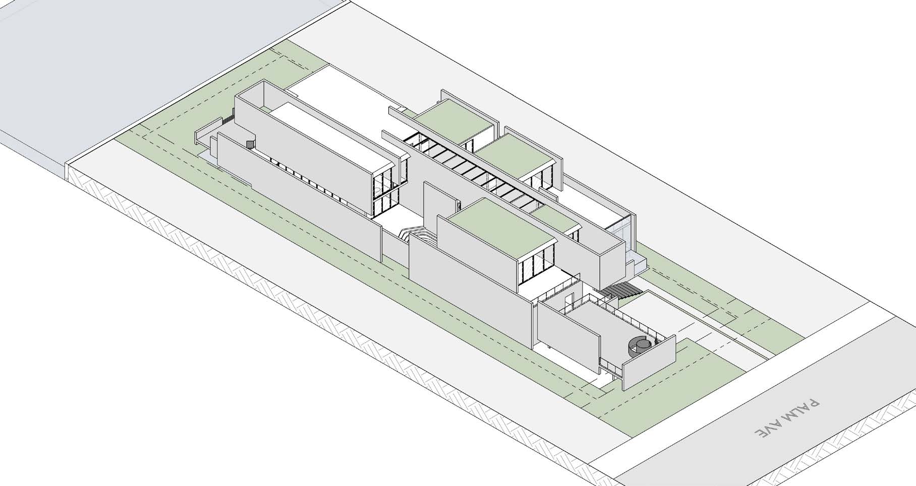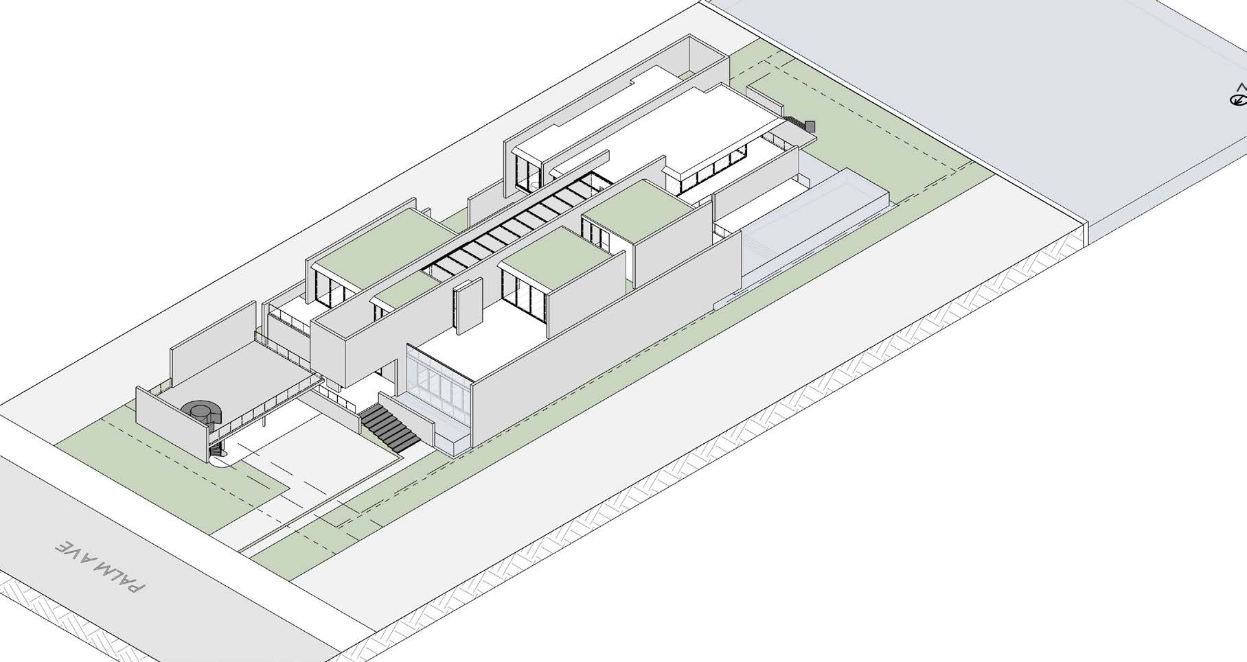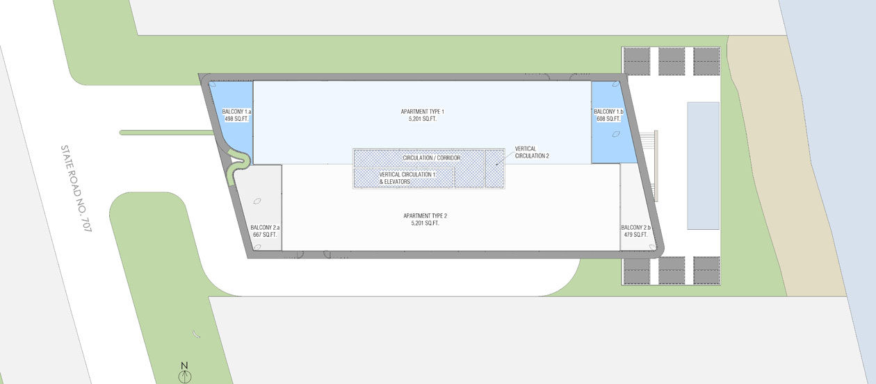 An extended main access offers a connection from the front facade to the waterview. Throughout this pathway, interior and exterior consecutive spaces give a variety of moments before the double height main entrance door. Materiality and height of volumes also plays a fundamental part of the design. The stone and concrete on the ground level creates a solid element that provides support to upper levels that are more fragmented creating courtyards on different heights. 26,500 SF