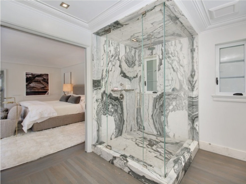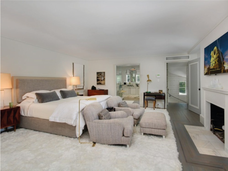 The house has a four car garage, a formal living and dining area, connected to a kitchen and family room, a guest house and an office on the first floor, and three bedrooms, a family room and a master bedroom on the second floor.