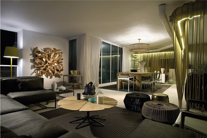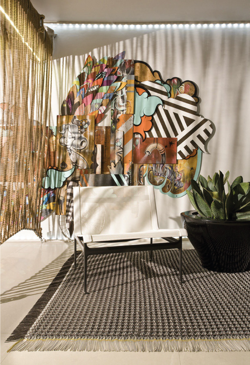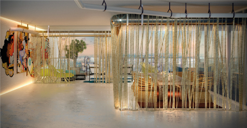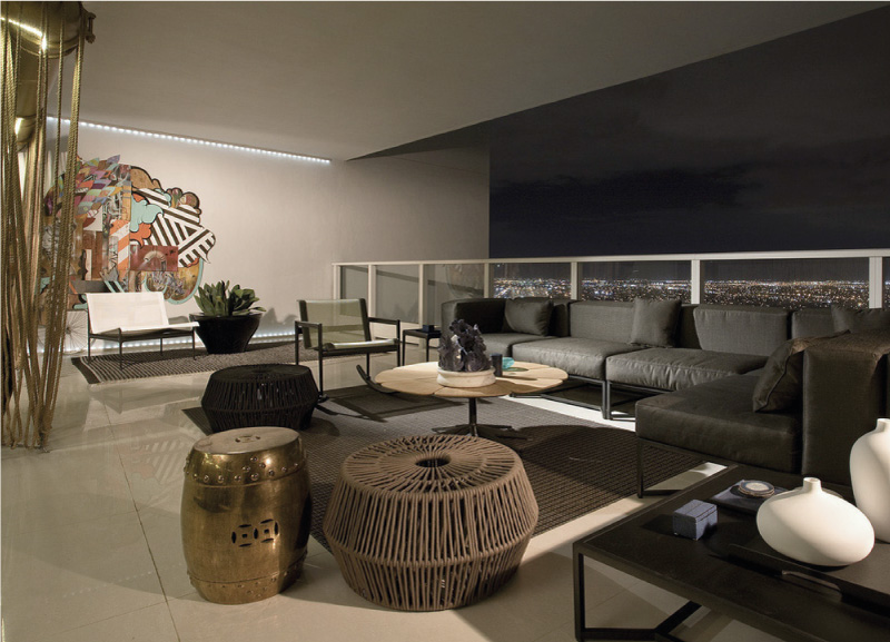 Thirlwall designed this rooftop terrace in conjunction with seven other design projects in the penthouse of the Paramount Bay as a showcase of Miami design talent. This space blends indoor and outdoor spaces to create a cohesive product. The hanging dividers, which uses a full mile of Manila rope, helps to conceal unmovable plumbing elements. To give students a hands-on experience, Thirlwall worked eleventh grade design students from DASH, the Design and Arcchitecture Senior High, to bring the project to life. Furnishings include outdoor dining sets and lounges by Kettal, seating by Richard Shultz, and graffiti artwork from the Margolize colletion.
