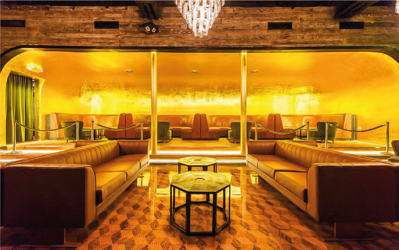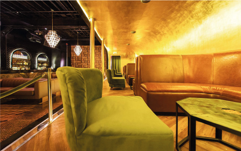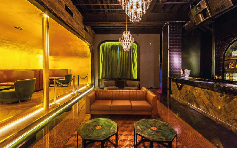 Libertine is Thirlwall’s first venture into hospitality design. This club combines a speakeasy feel with a London private lounge. Several of Thirlwall’s custom design elements came together to create this venue including: the custum banquettes and green velvet chaurs; the flooring, which is created with $2000 in pennies with varying levels of polish; a (size)marble fireplace beneath a (size) Venetian glass mirror; black emperor marble countertops; and reclaimed wood from Hall Smith. The golden niche is inspired by David Lynch’s Moholland Drive and is covered in 18 karat gold leaf. The space is decorated with Victorrian memento mori, features two World War I equine gas masks, A baby grand piano converted into a DJ deck, and vintage pornography from the 1910’s in the VIP room. All of this serves to enhance the extensive cocktail menu that Libertine has to offer.